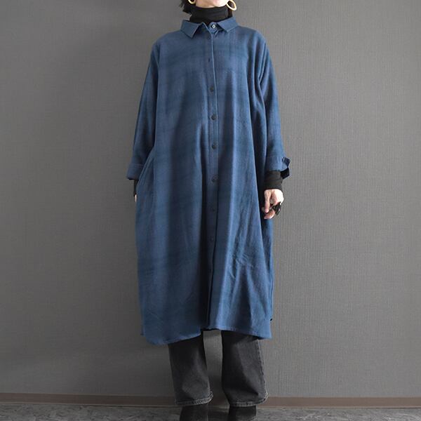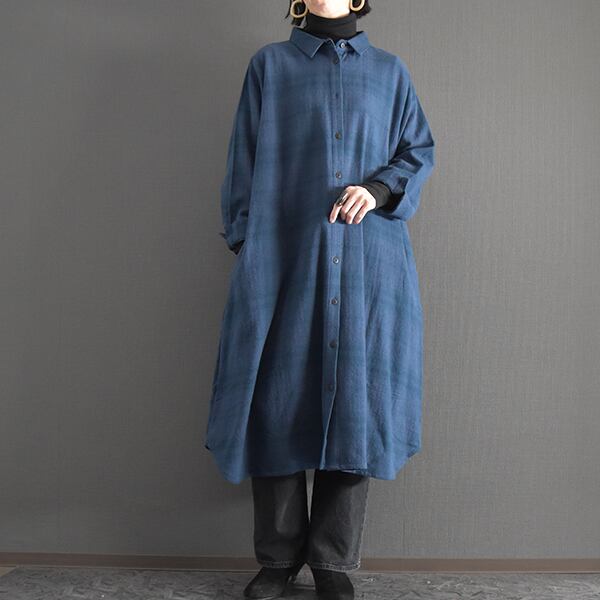 柔らかい起毛生地を使用しています。Aラインのシャツワンピースタイプなので、季節によってコート感覚で着ていただくのもGOOD。