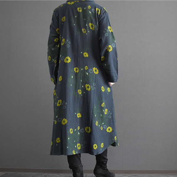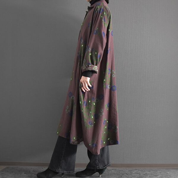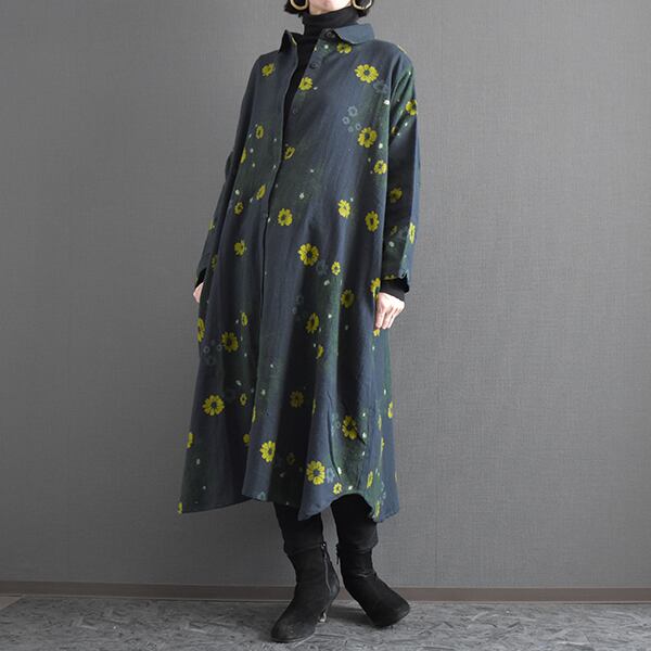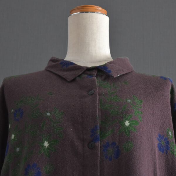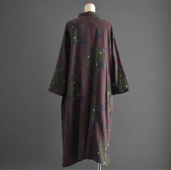 小さめの襟と落ち着いた花柄でワンピースとしてもアウターとしても活躍しそうな一枚です。