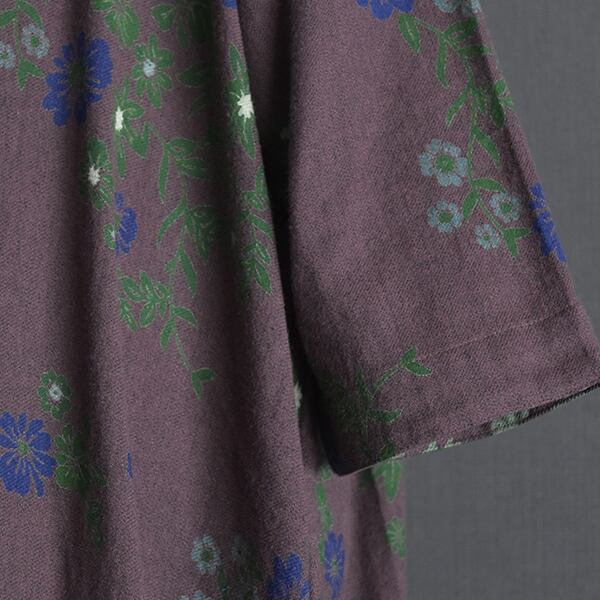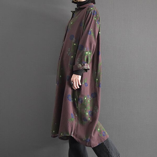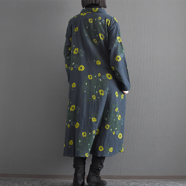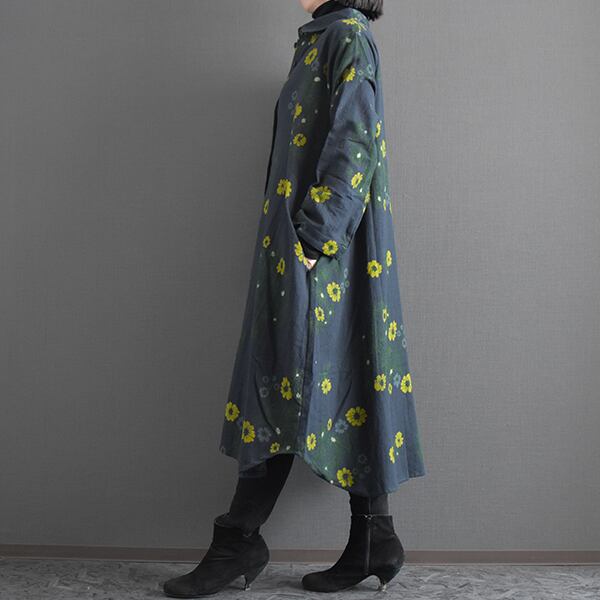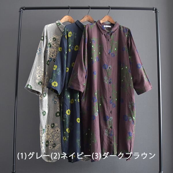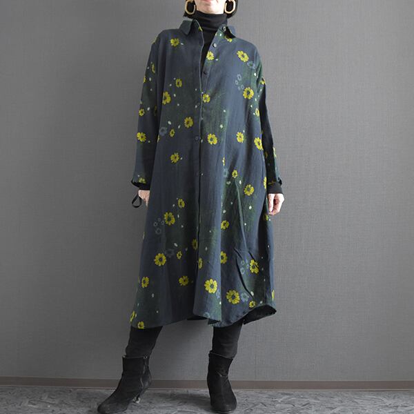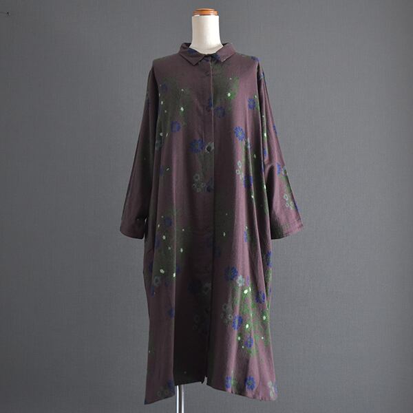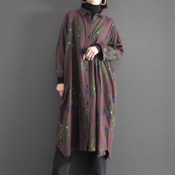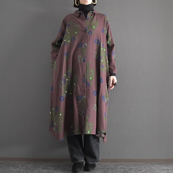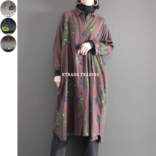 ソフト起毛コットン花柄前開きシャツワンピース 2025秋冬