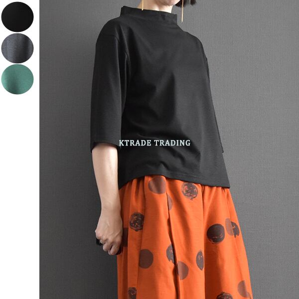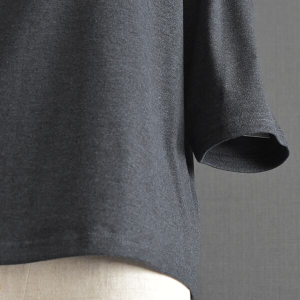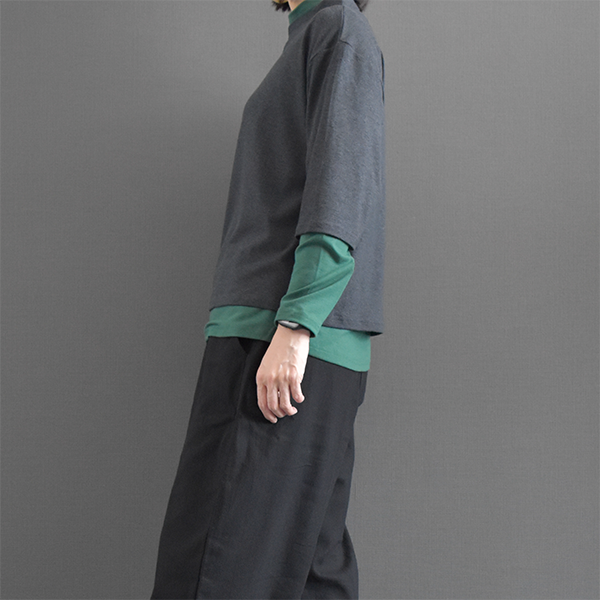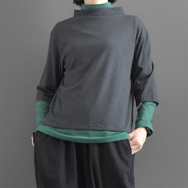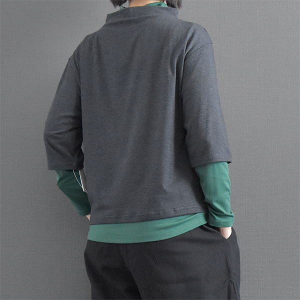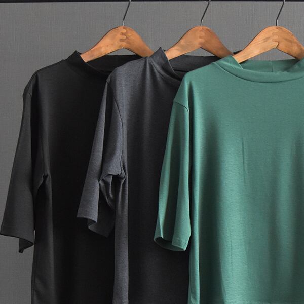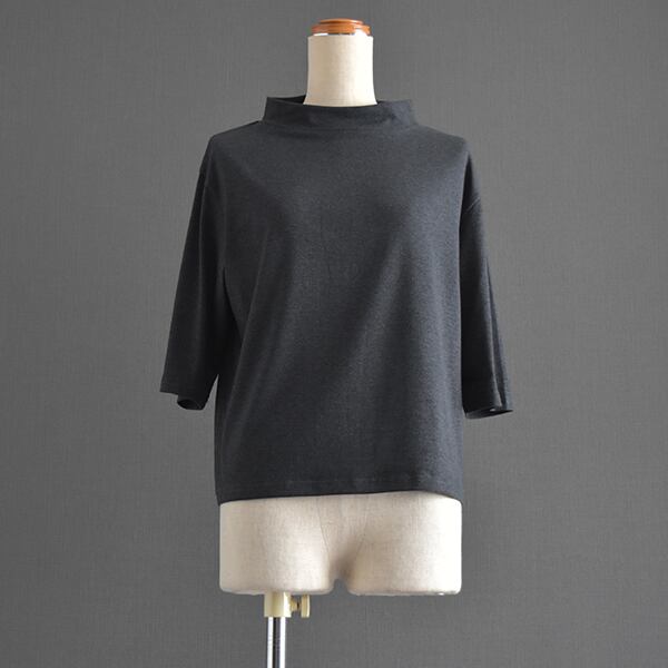 低めのスタンド襟がポイントで、シンプルなトップスながら着回しの効くアイテムです。