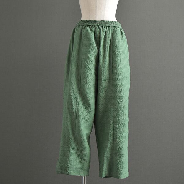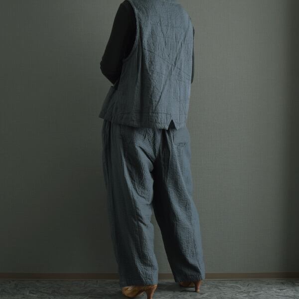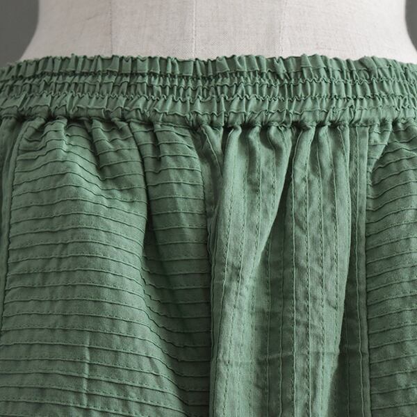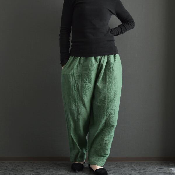 パンツはピンタックを縦横で切り替えて配置し、シンプルになり過ぎないデザインに仕上げました。薄手綿の裏地付きなので透け感は気にせず履いていただけます