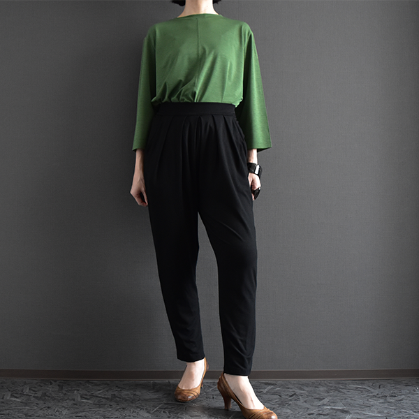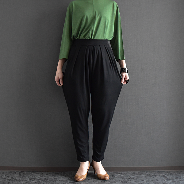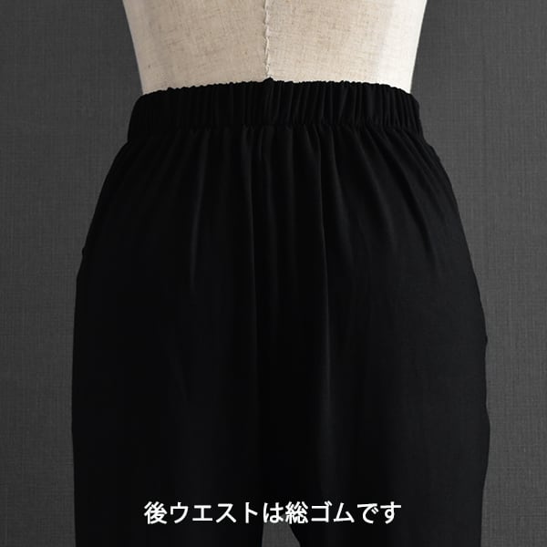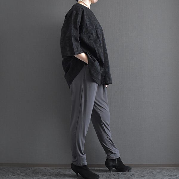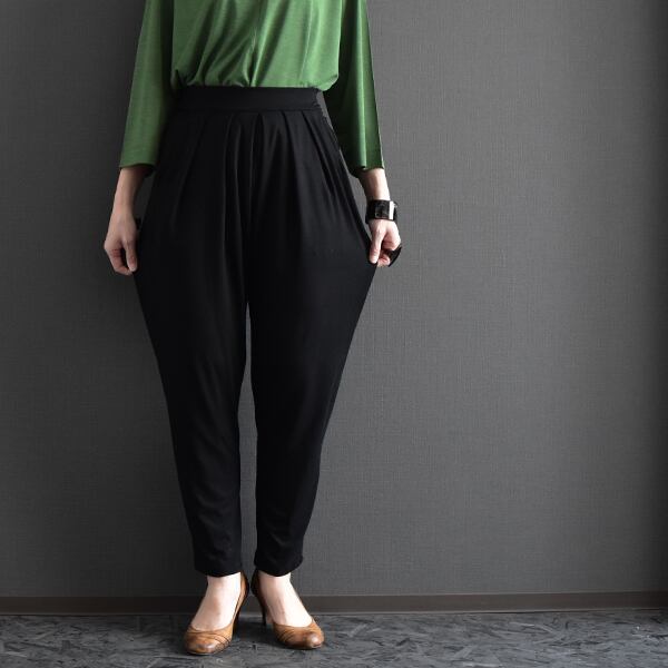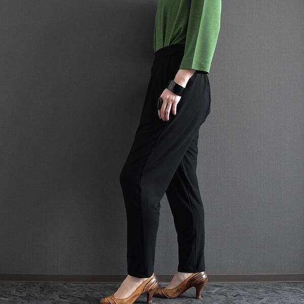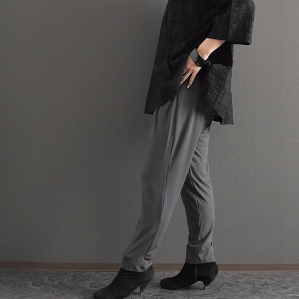 腰まわりに程よいゆとりを持たせ、裾に向かってすっきりと細くなるシルエットで、体型を自然にカバーしながら脚をきれいに見せてくれます。