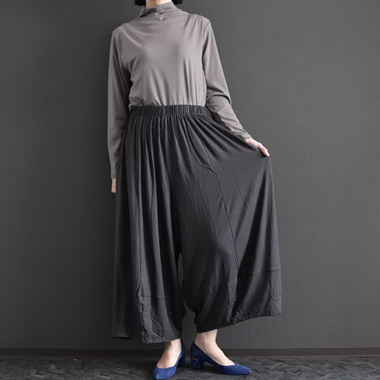 落ち感のあるレーヨンストレッチ素材を使用した、リラックス感と上品さを兼ね備えたワイドサルエルパンツ。