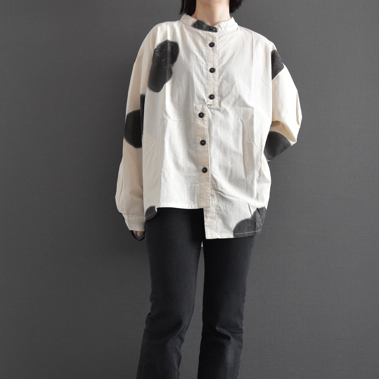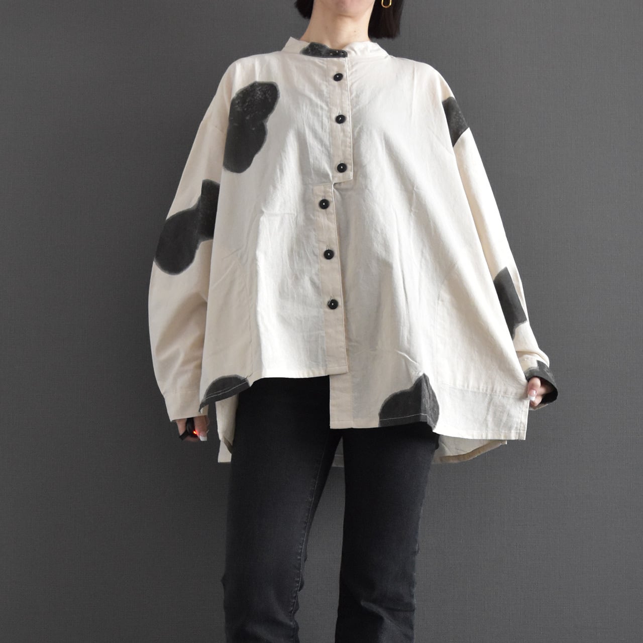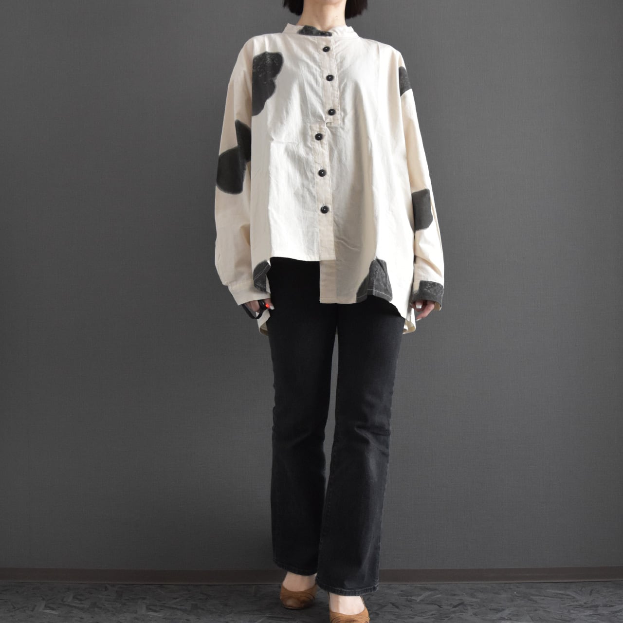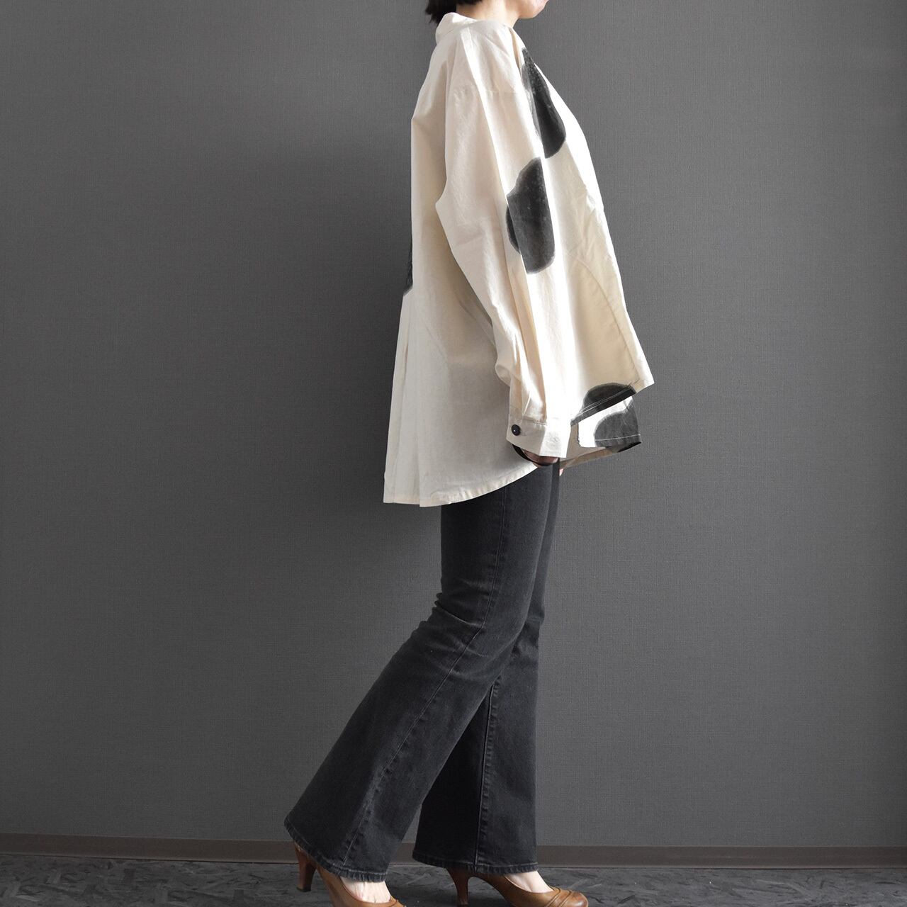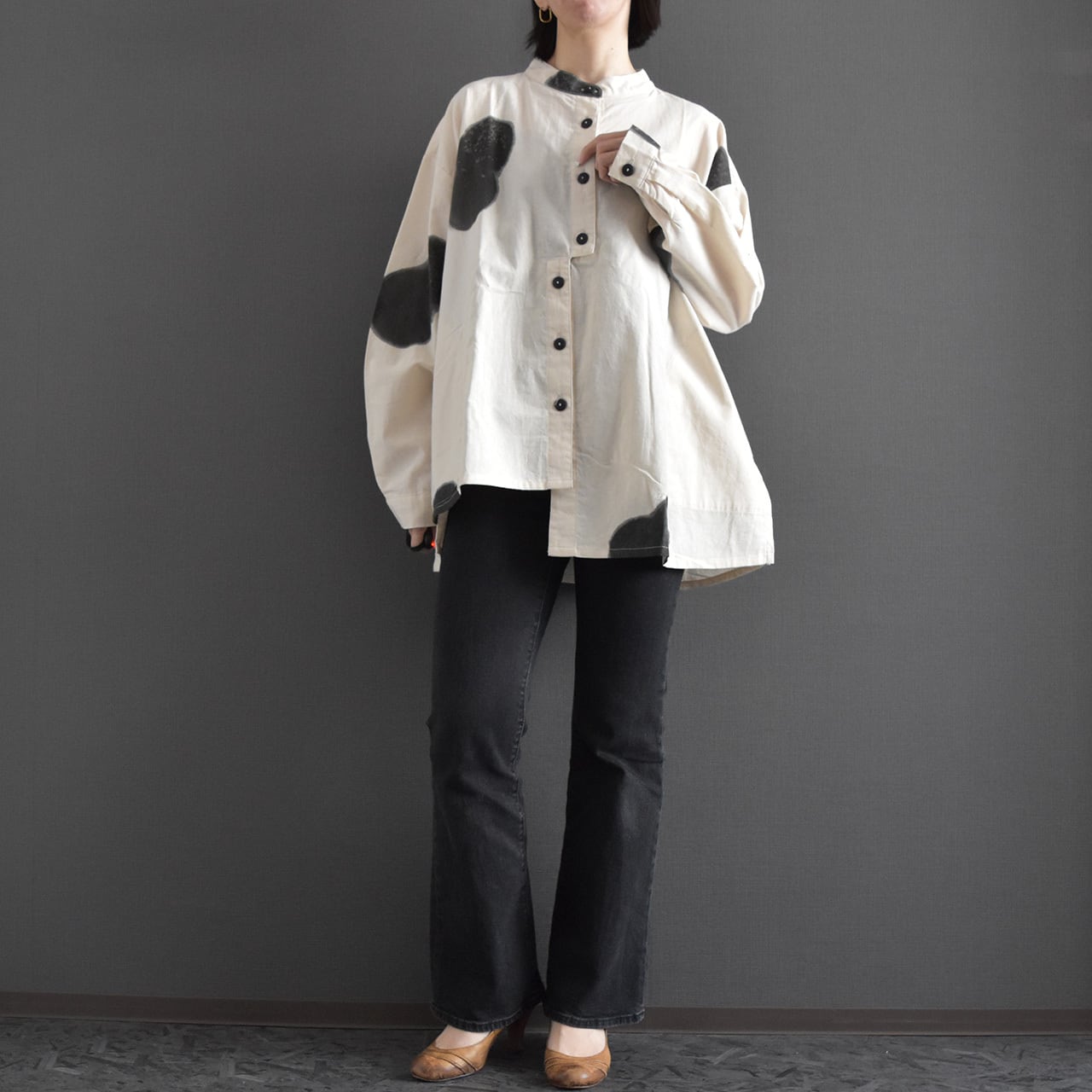 手描きのランダムな柄配置が、ナチュラルでありながらモード感のある表情を演出します。