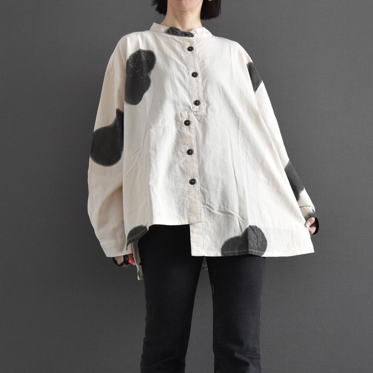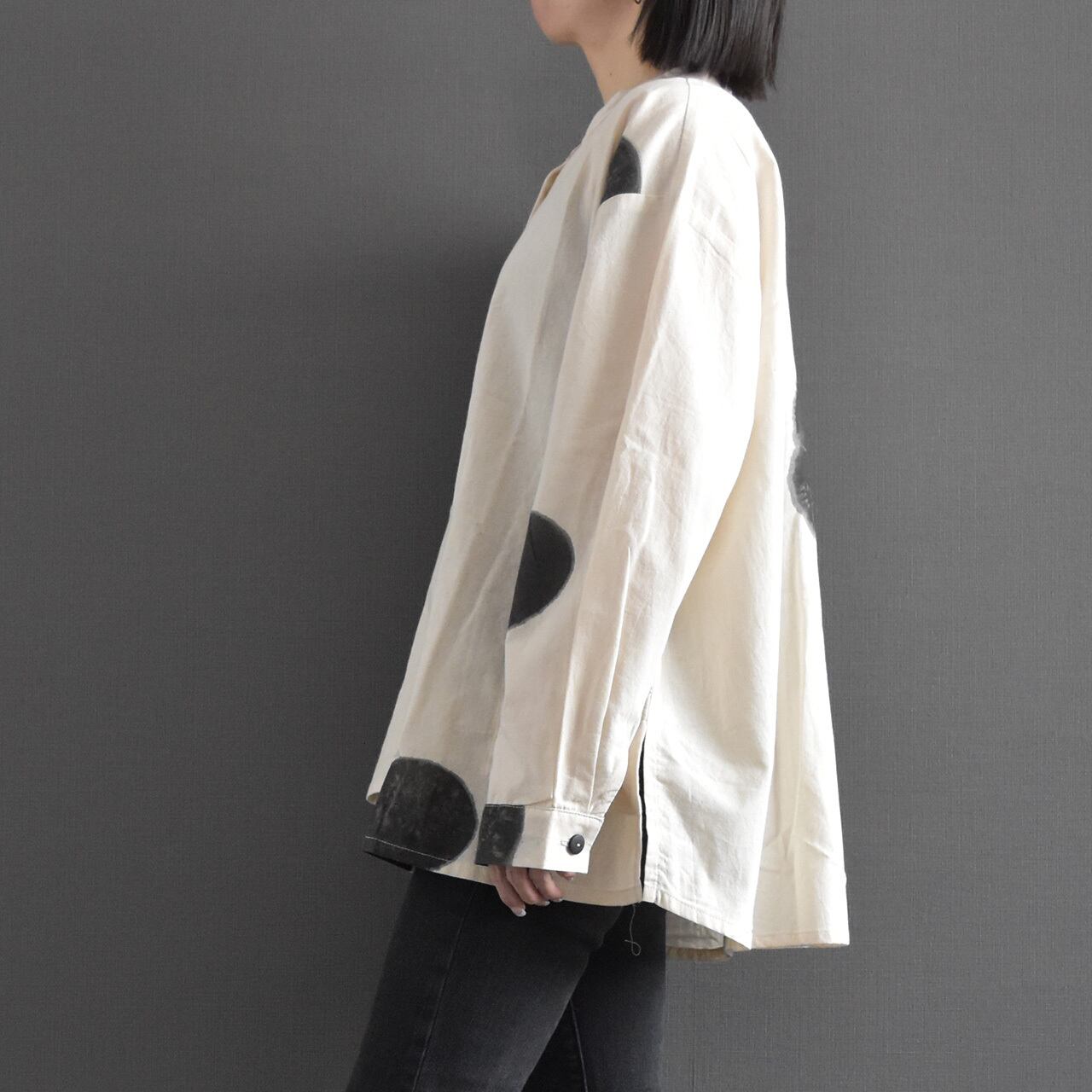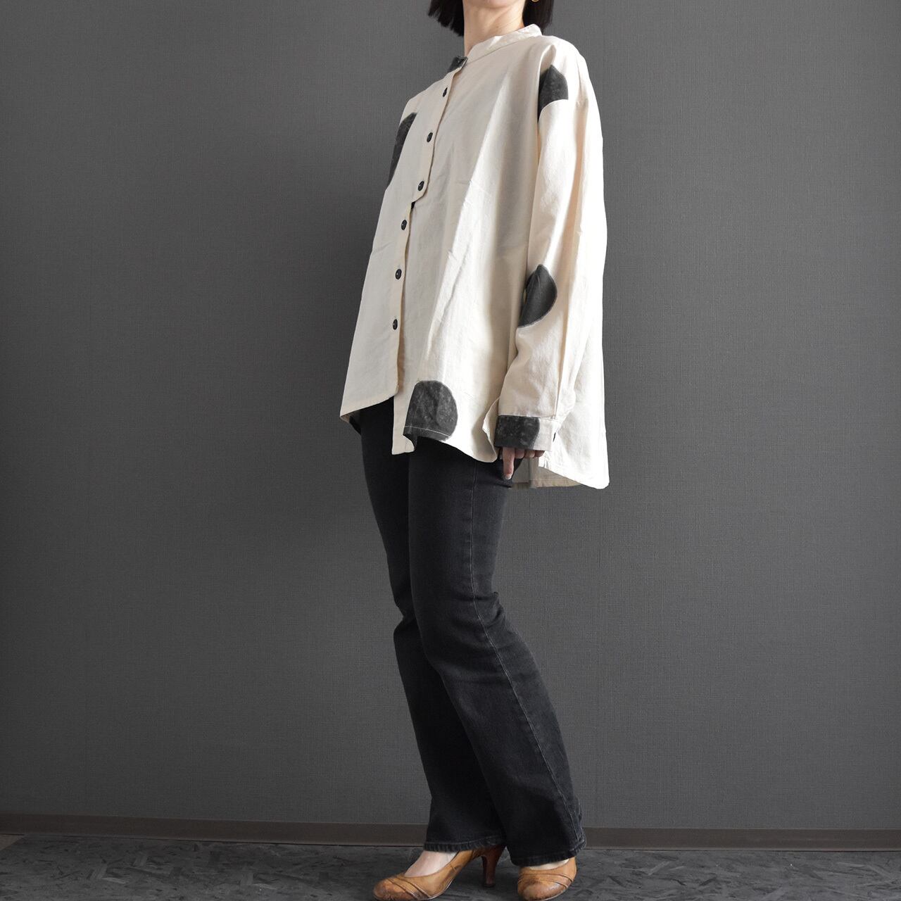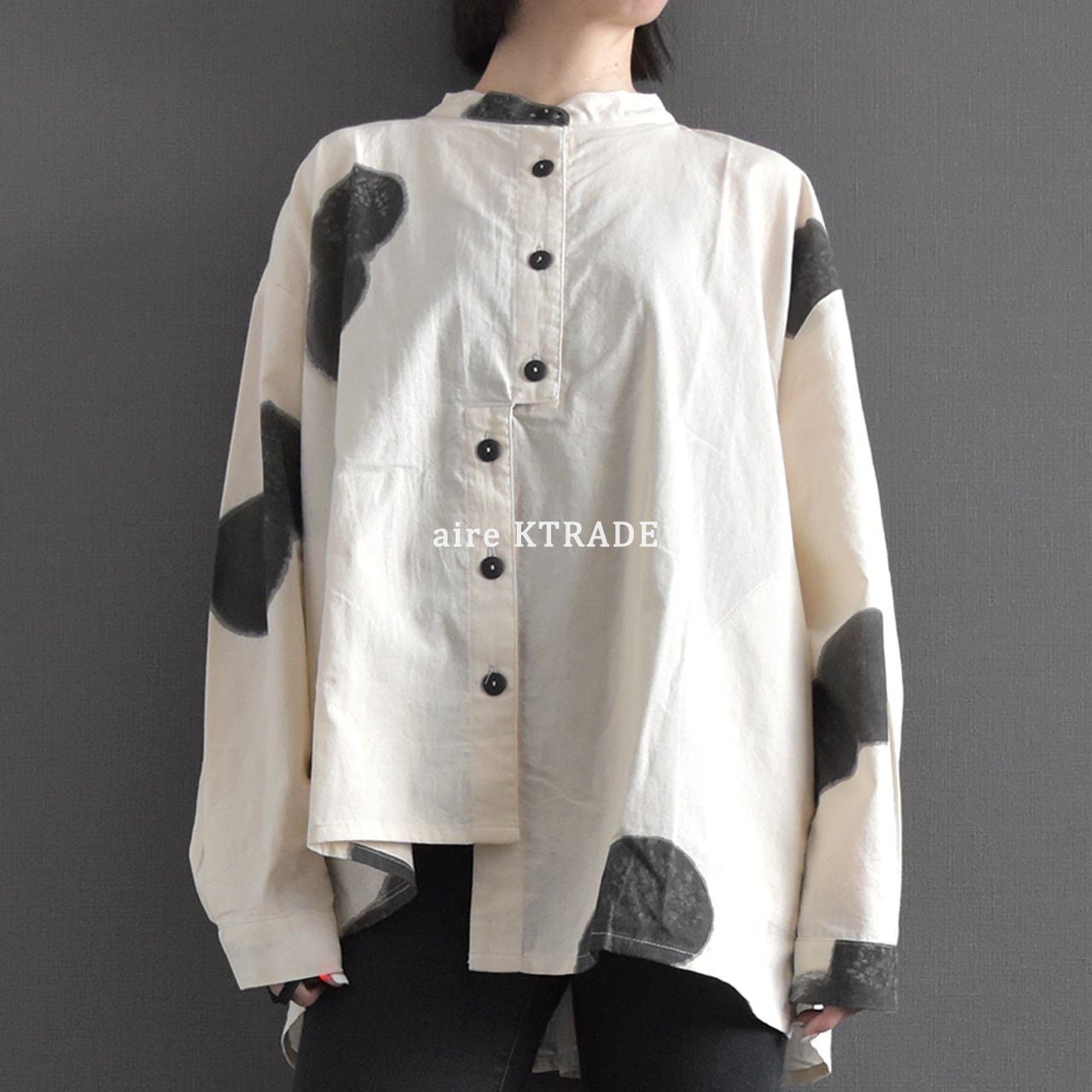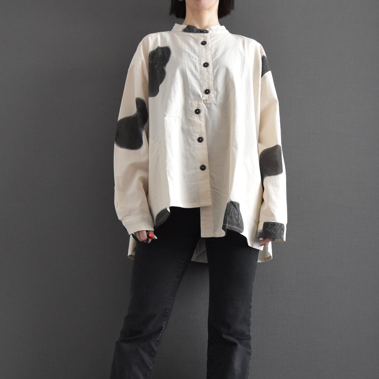 手描きのランダムな柄配置が、ナチュラルでありながらモード感のある表情を演出します。