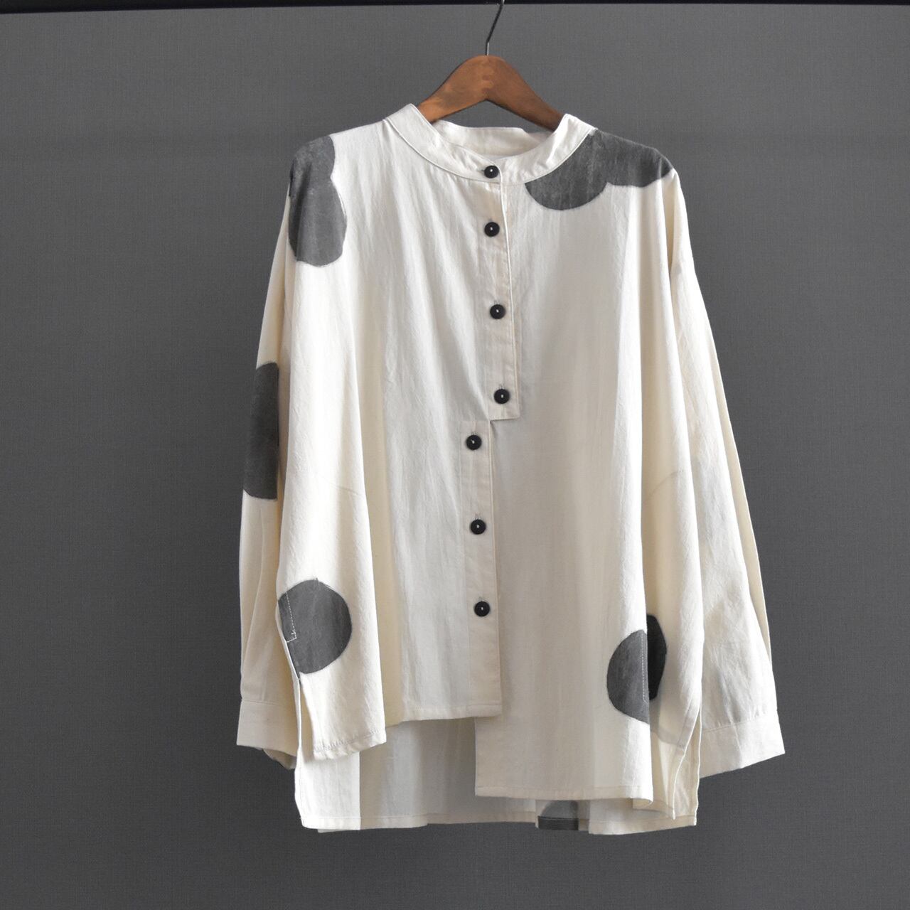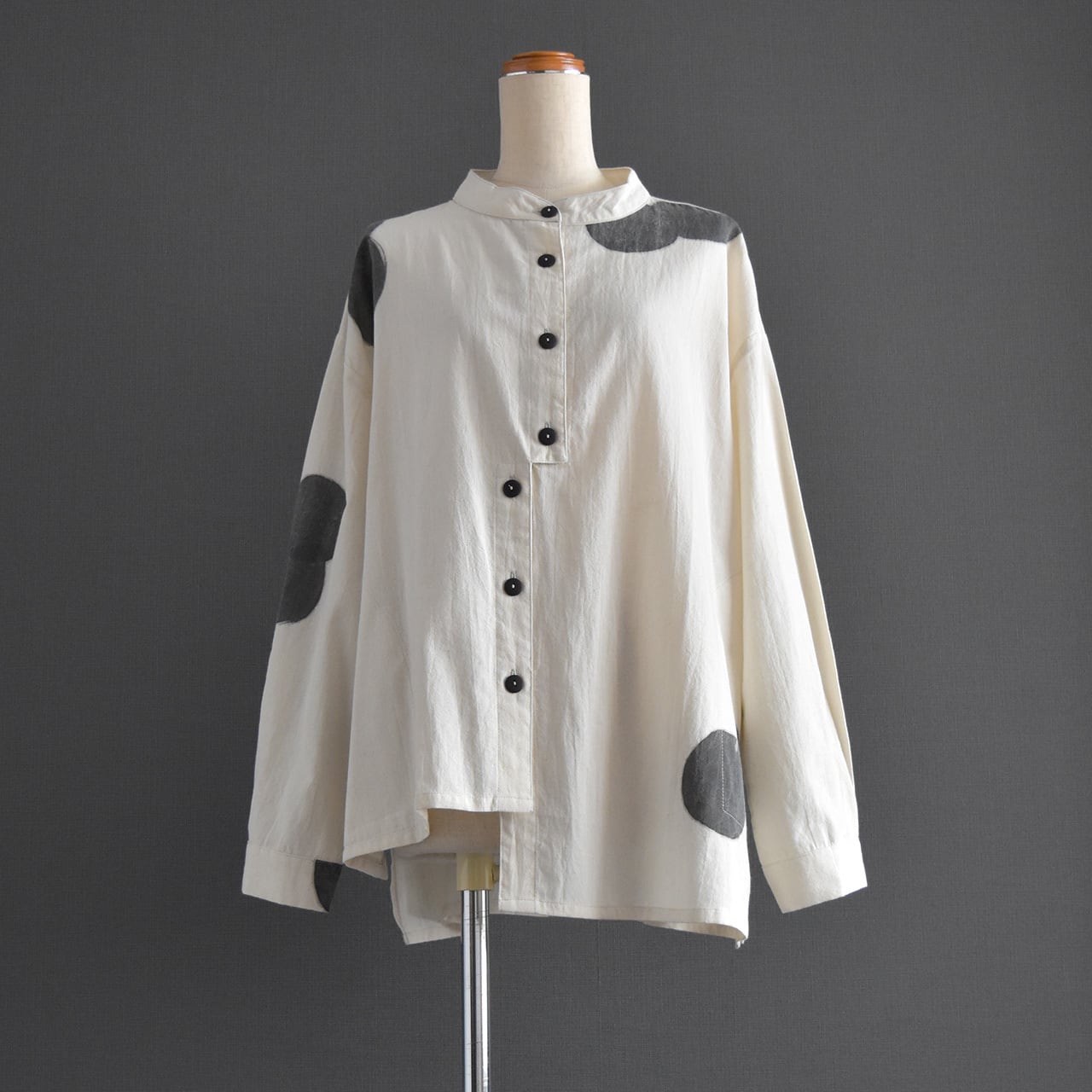 大胆なドット柄が目を引く、存在感のあるデザインブラウス。