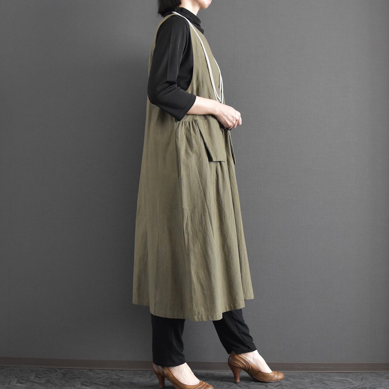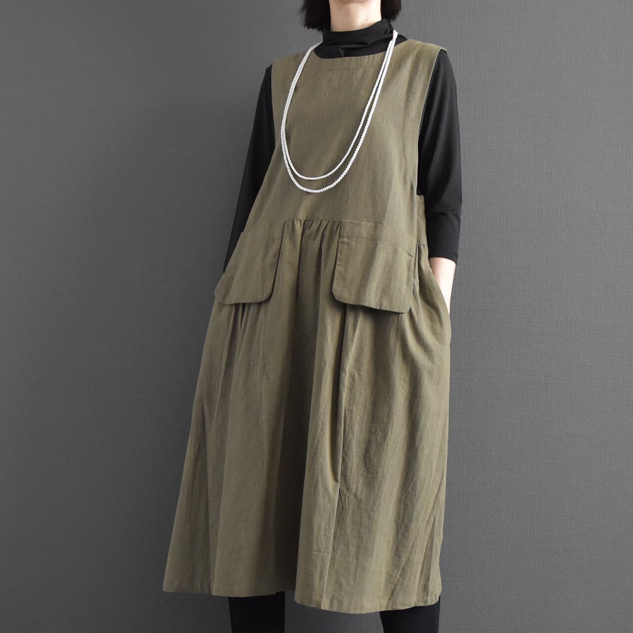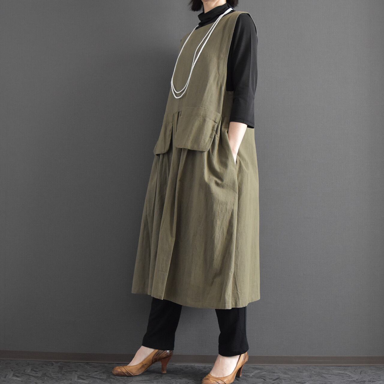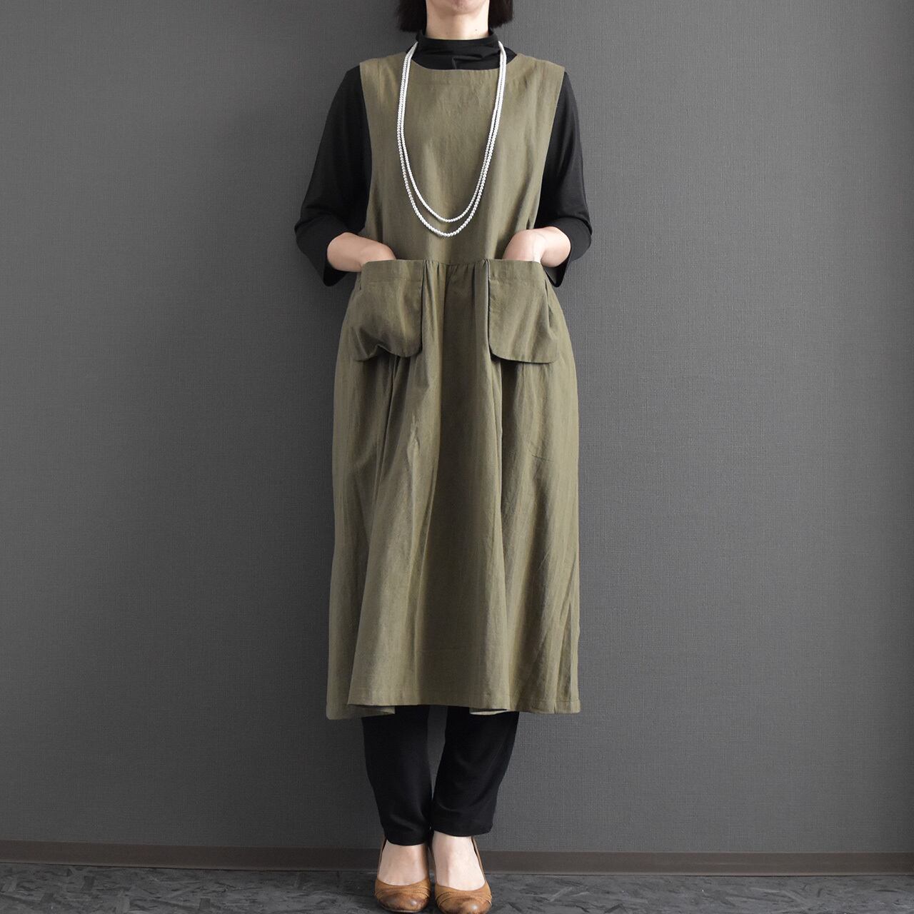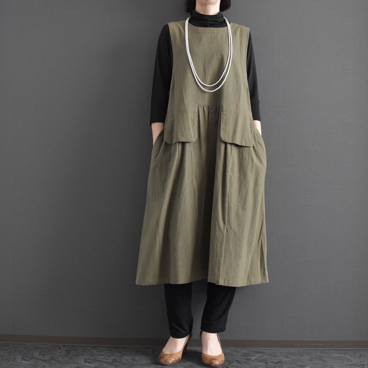 ナチュラルな風合いと大人の落ち着きを兼ね備えた、ジャンパースカートワンピース。