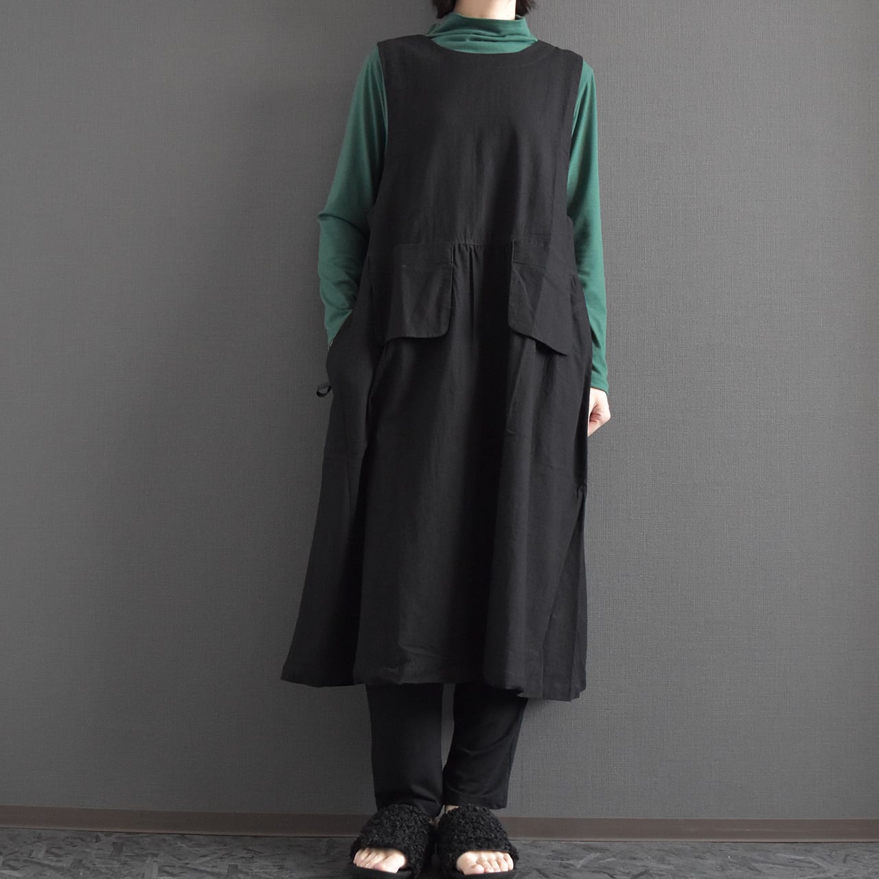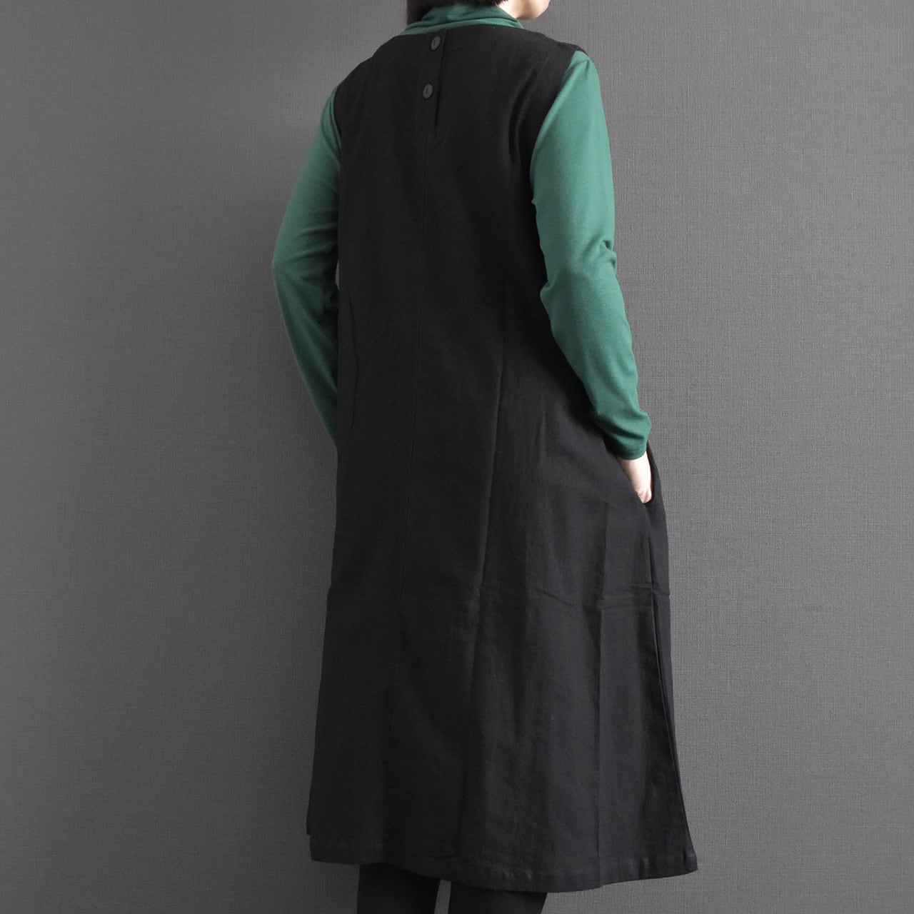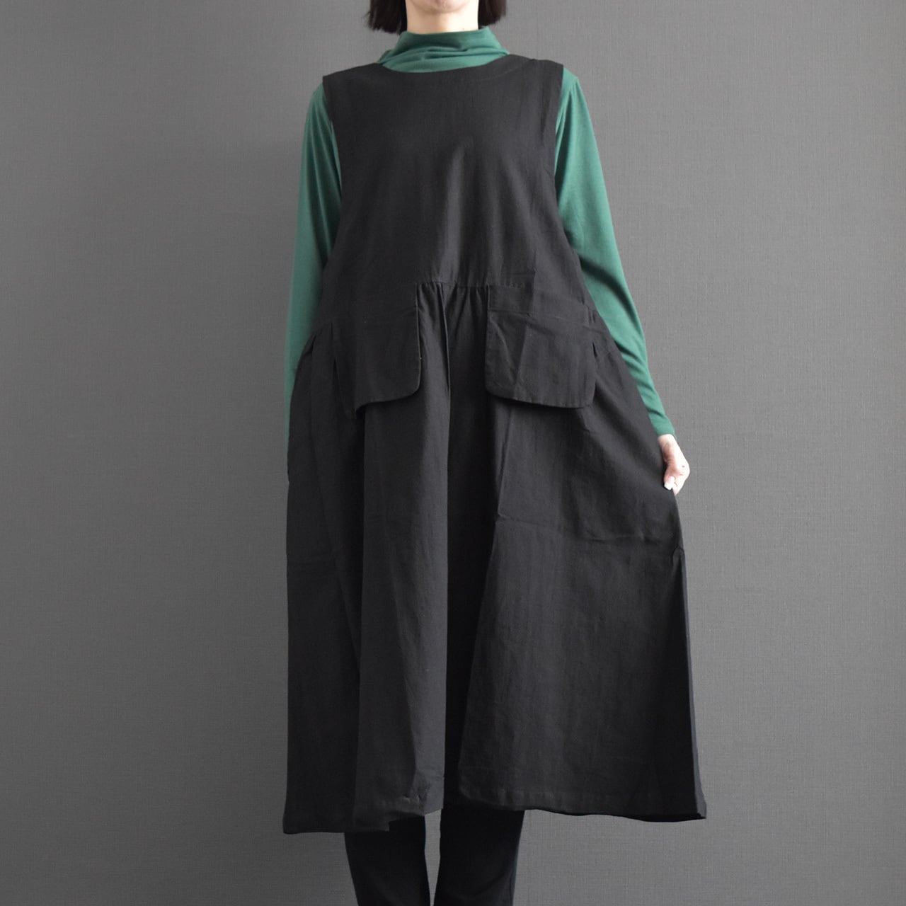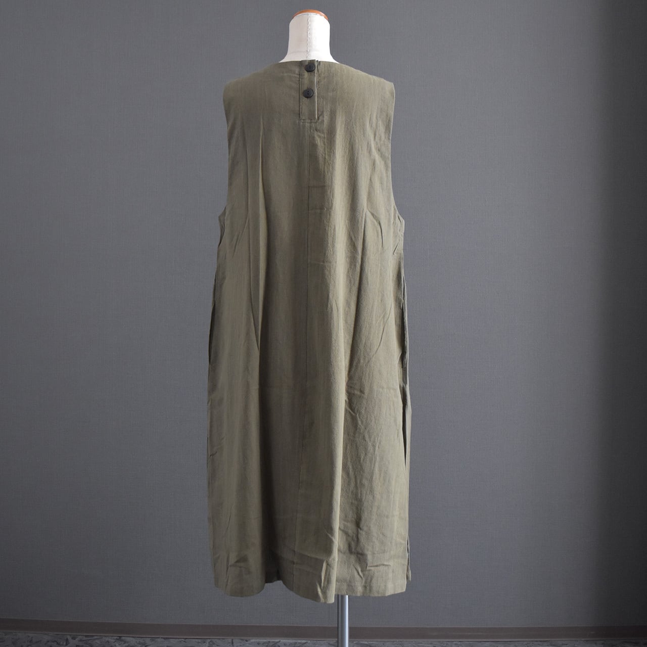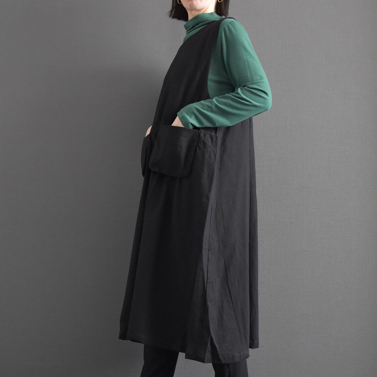 ナチュラルな風合いと大人の落ち着きを兼ね備えた、ジャンパースカートワンピース。
