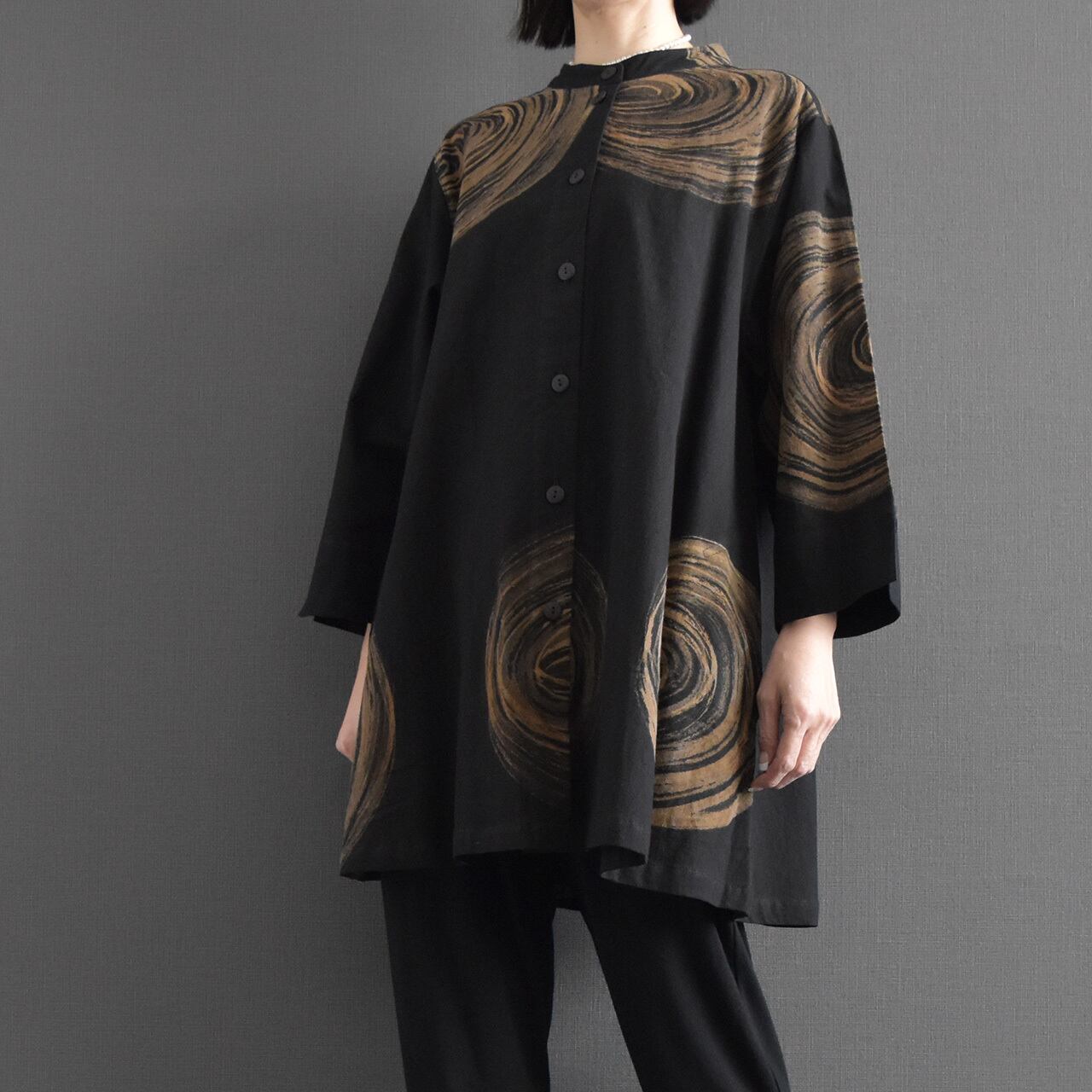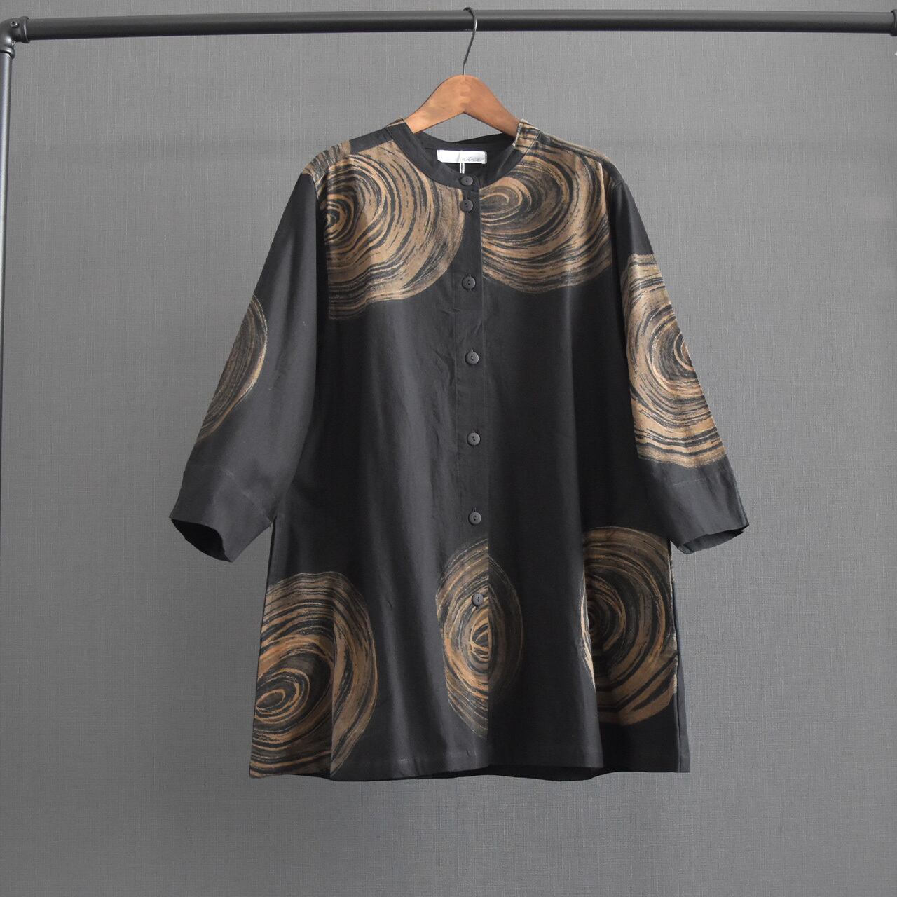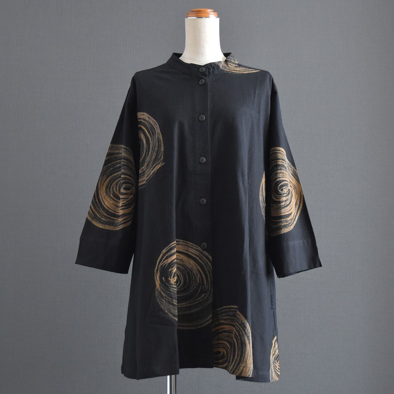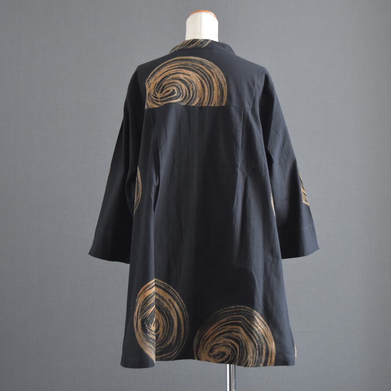 大胆でありながら落ち着きのある、渦模様が印象的な前開きチュニック。