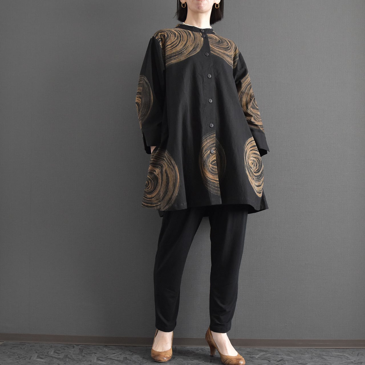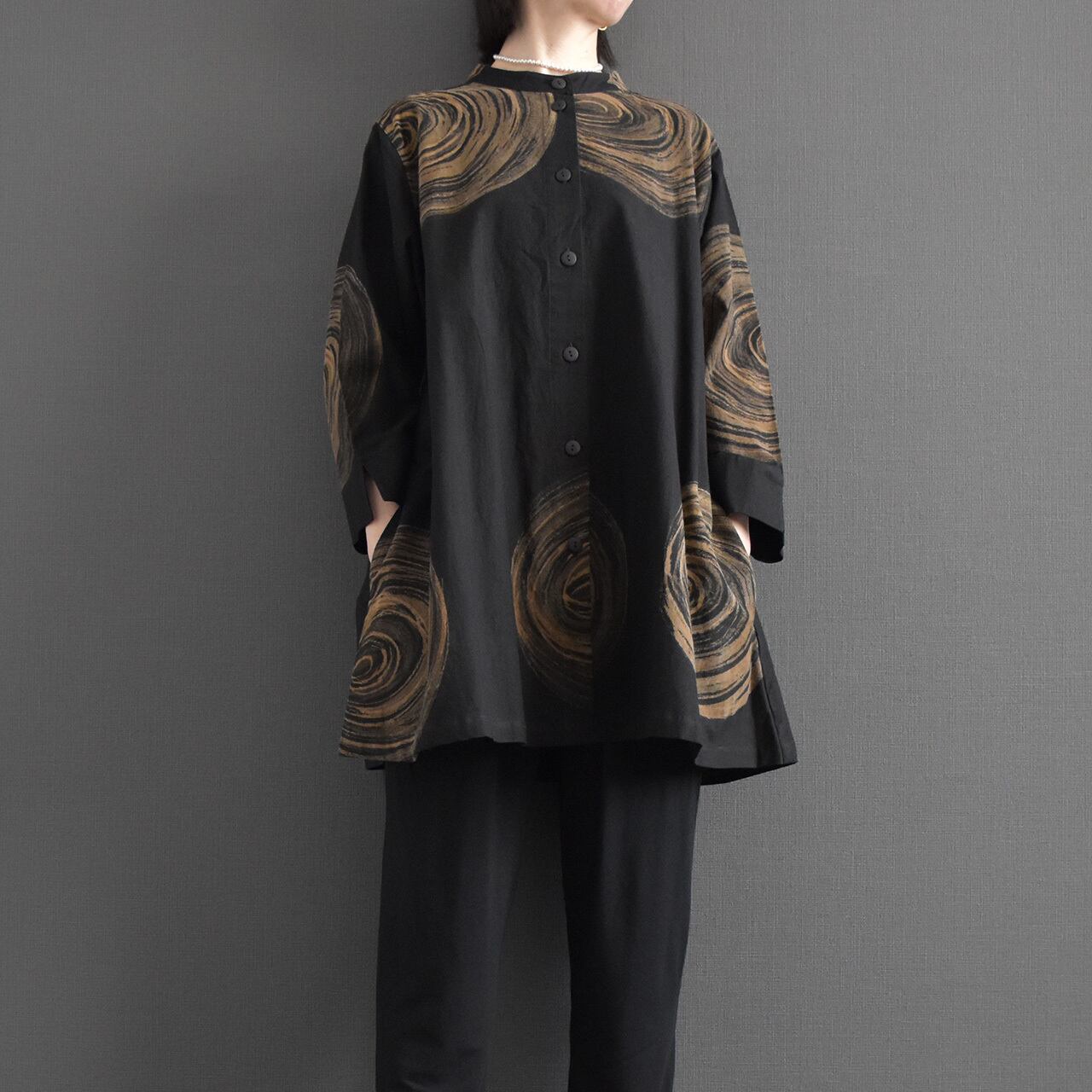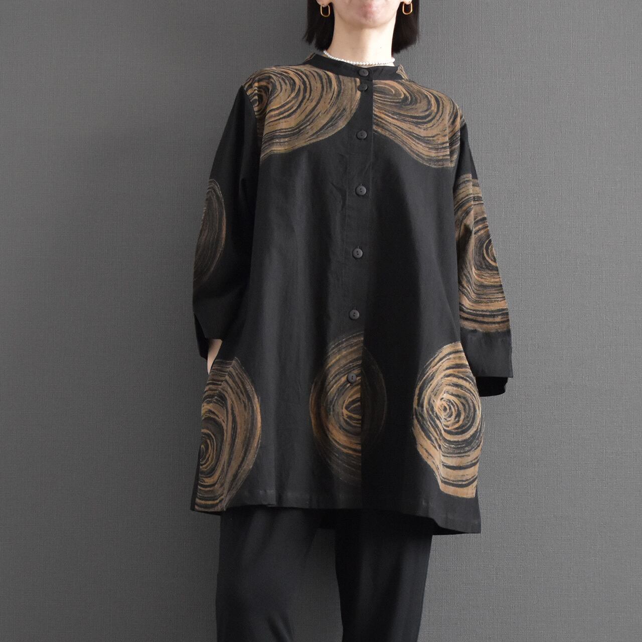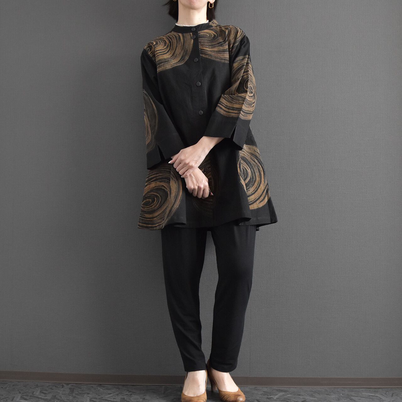 大胆でありながら落ち着きのある、渦模様が印象的な前開きチュニック。