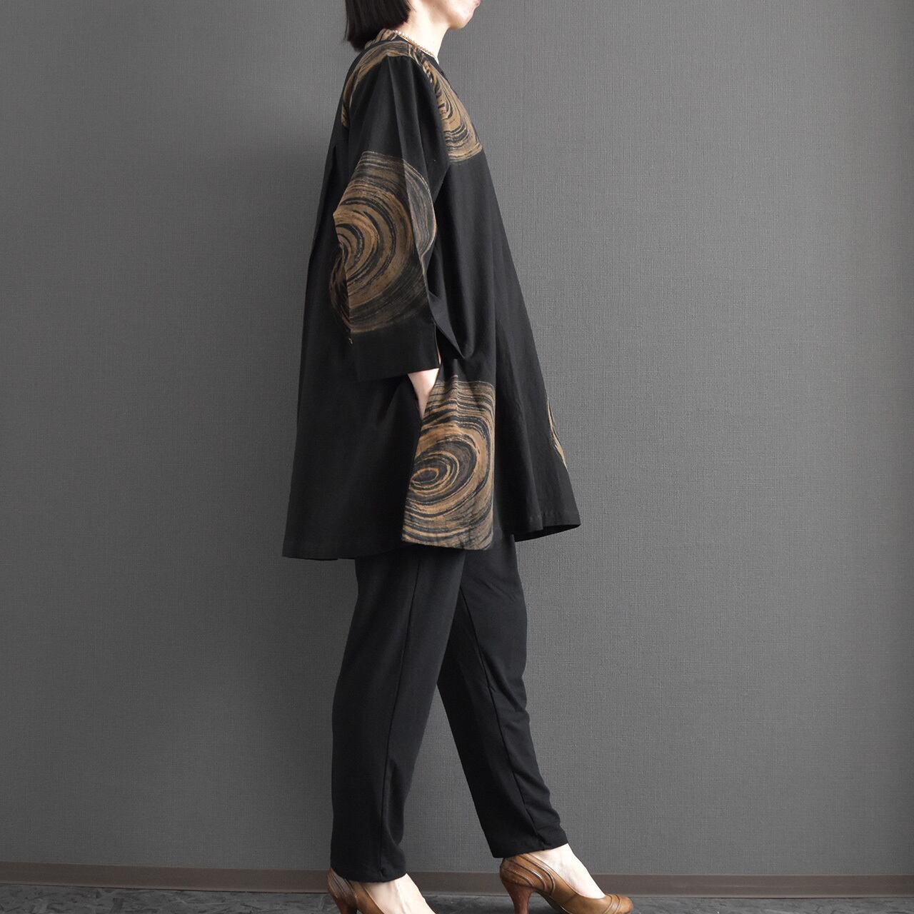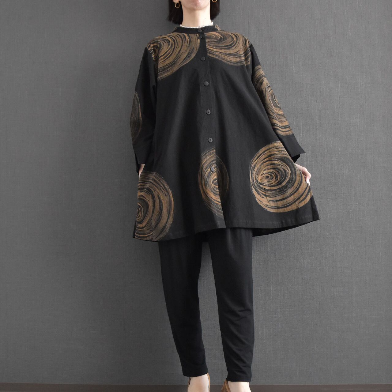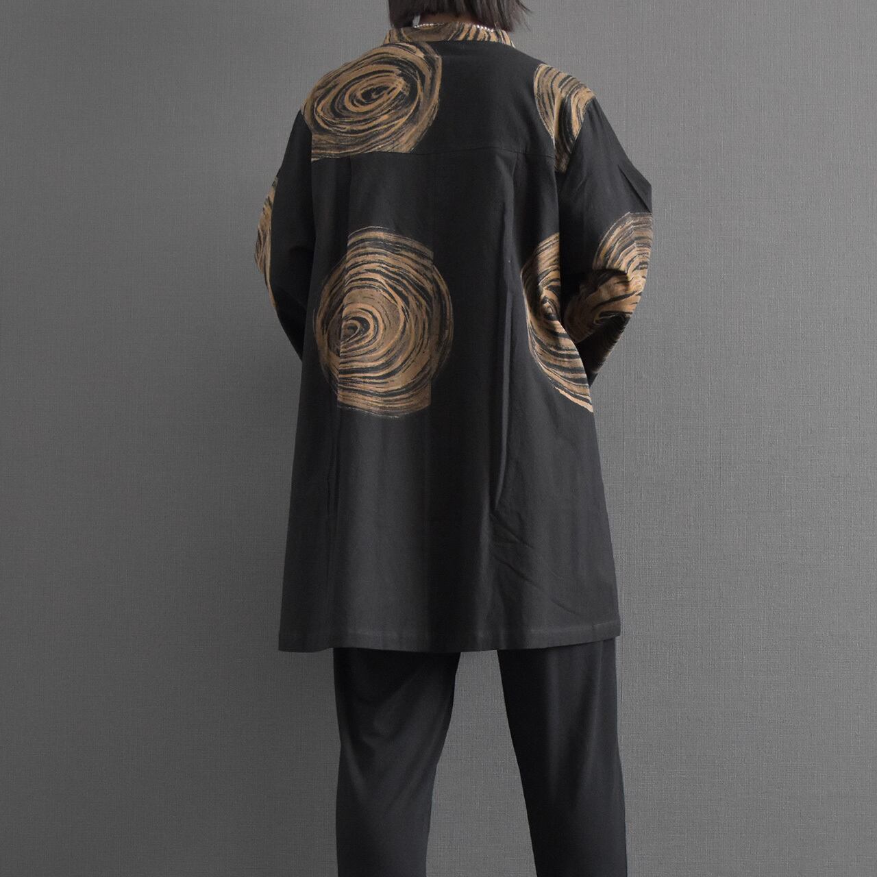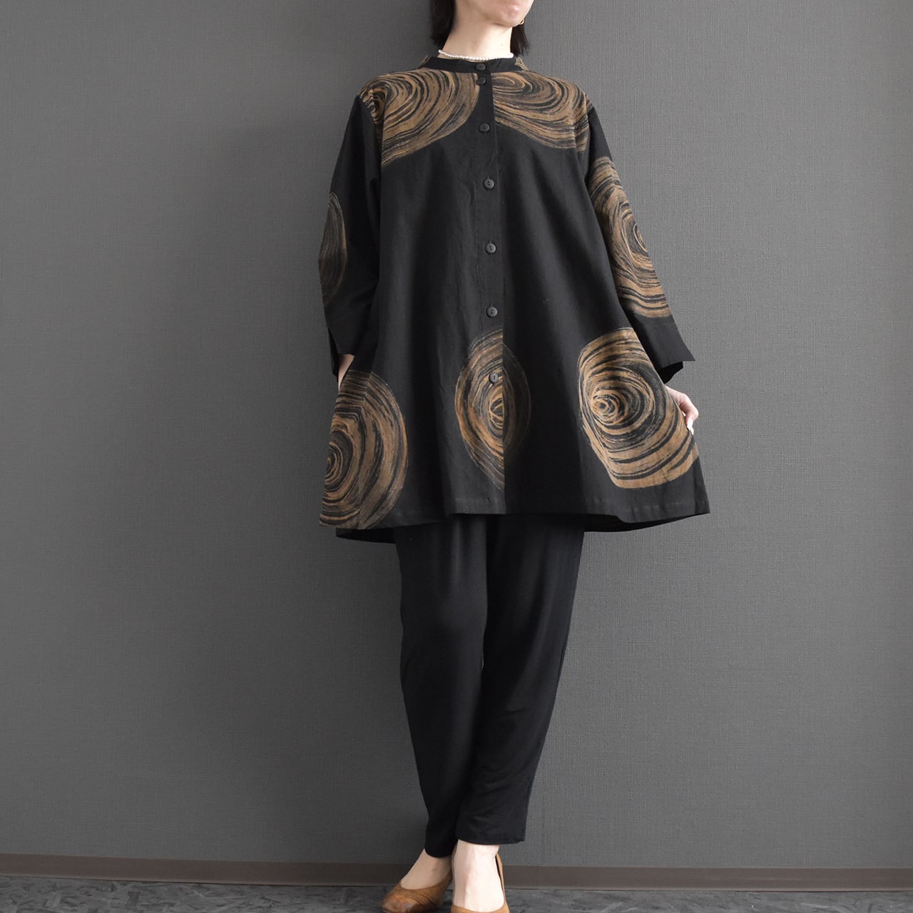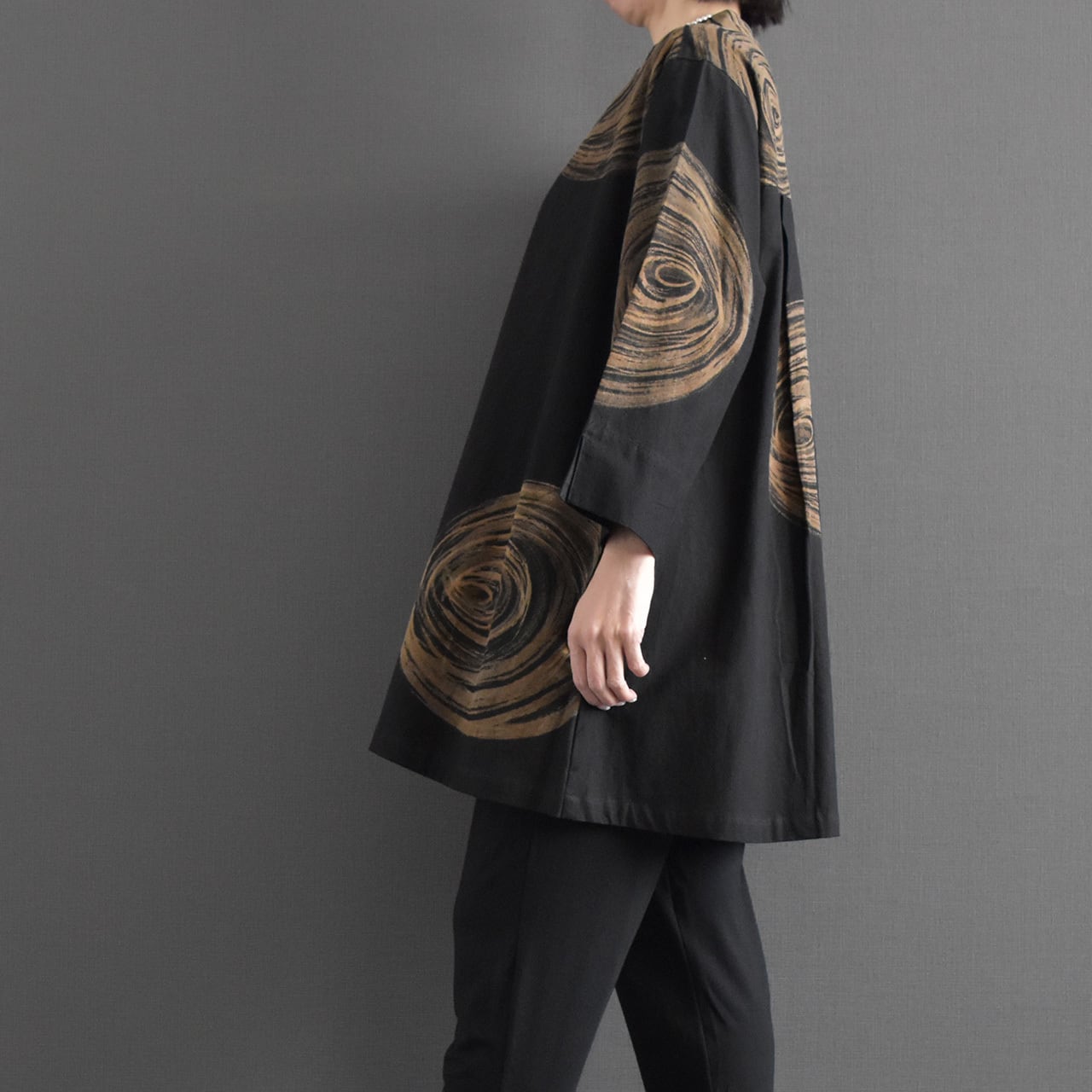 大胆でありながら落ち着きのある、渦模様が印象的な前開きチュニック。