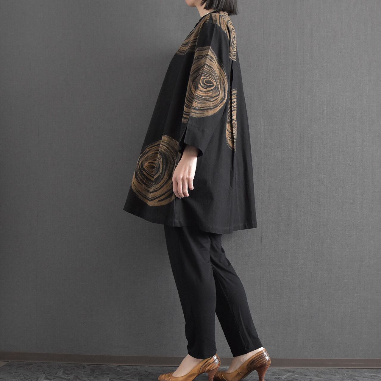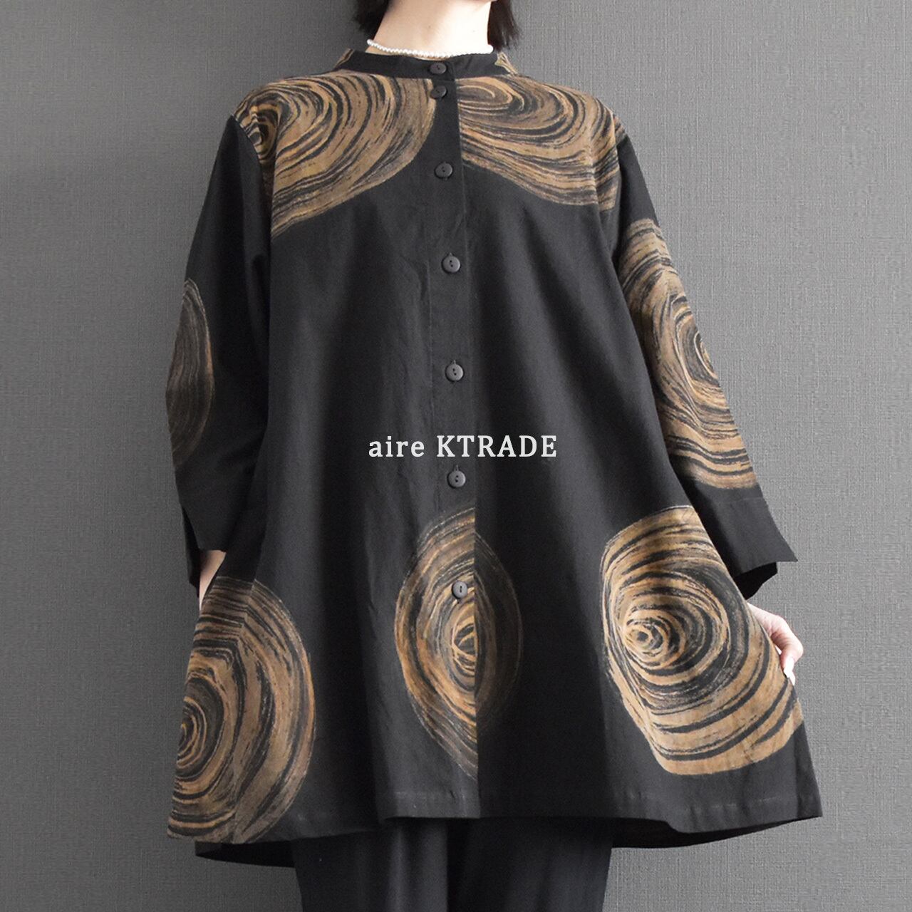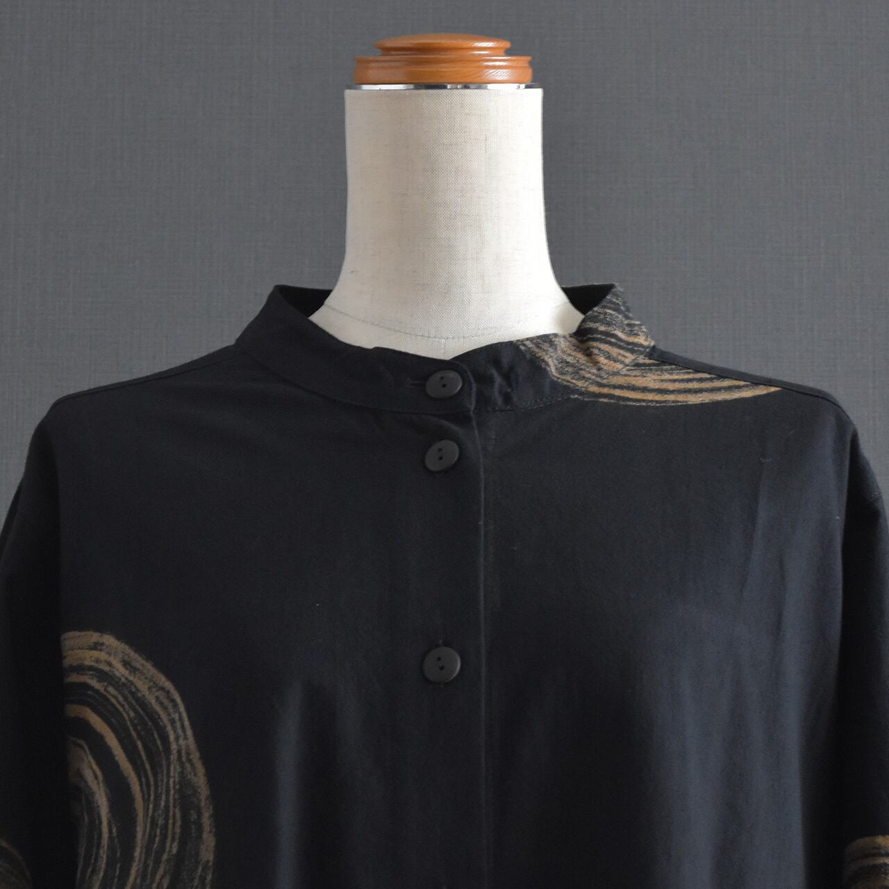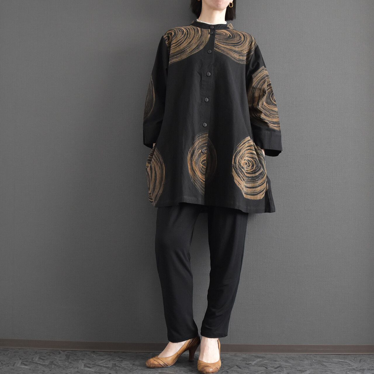 大胆でありながら落ち着きのある、渦模様が印象的な前開きチュニック。