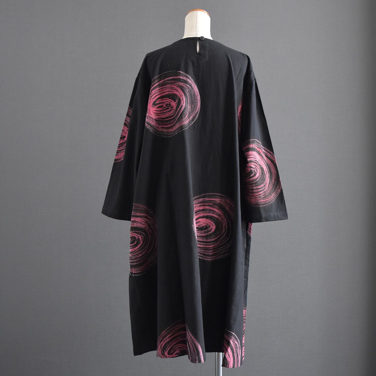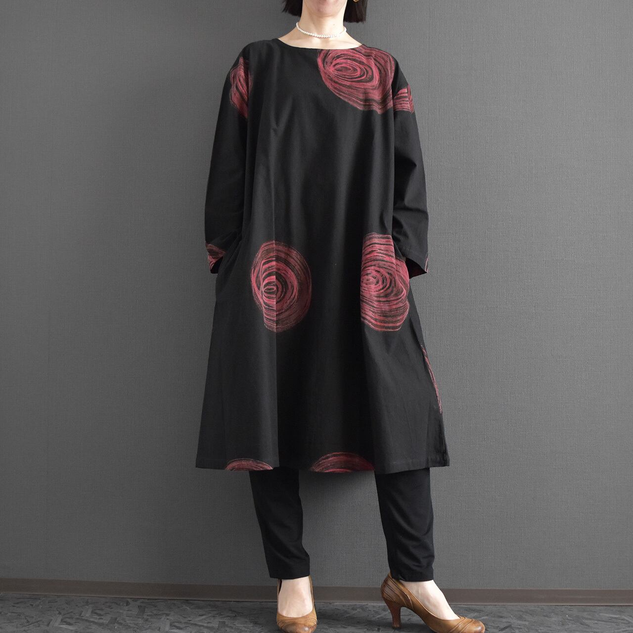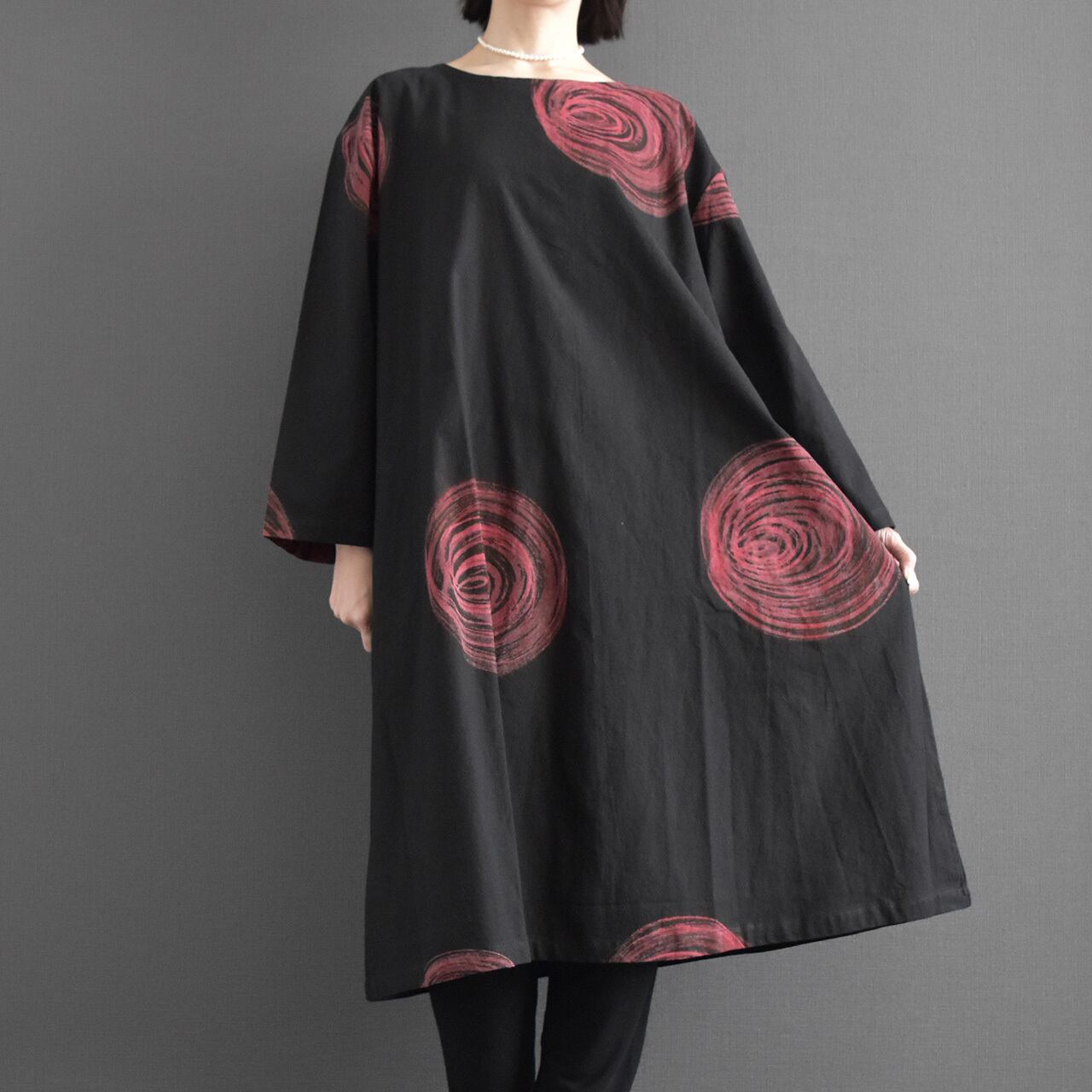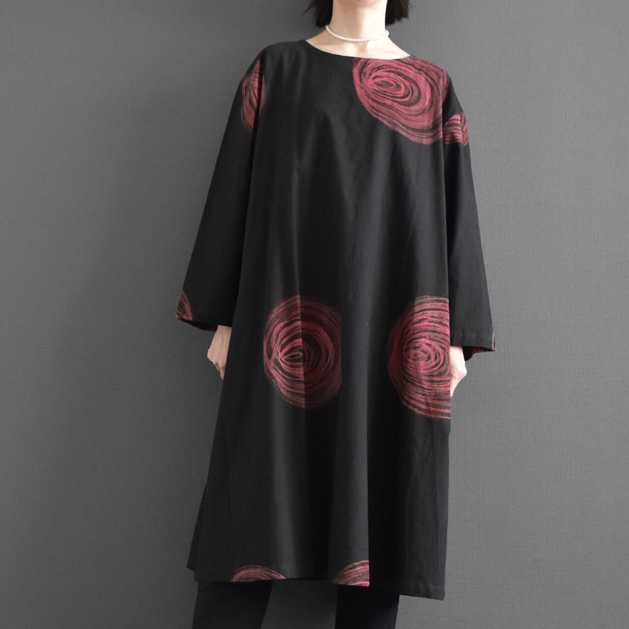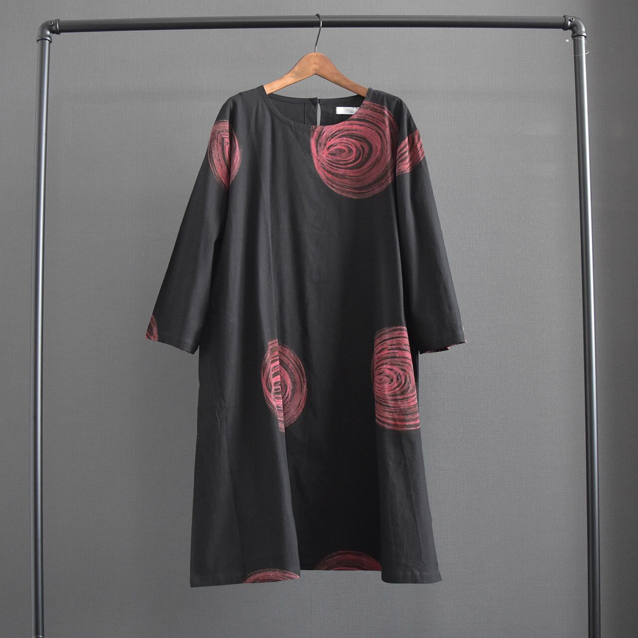大胆な渦模様が印象的な、存在感のあるワンピース。