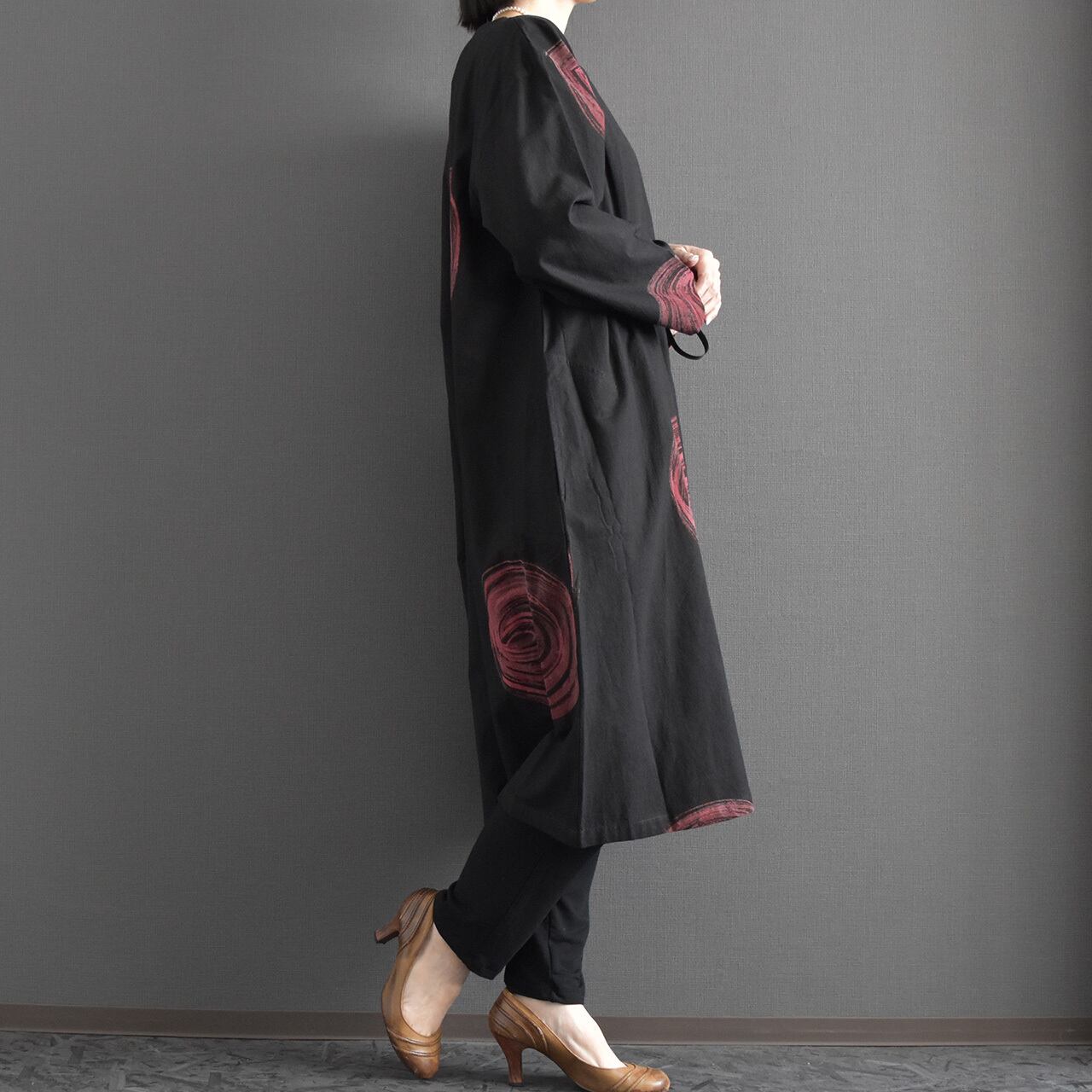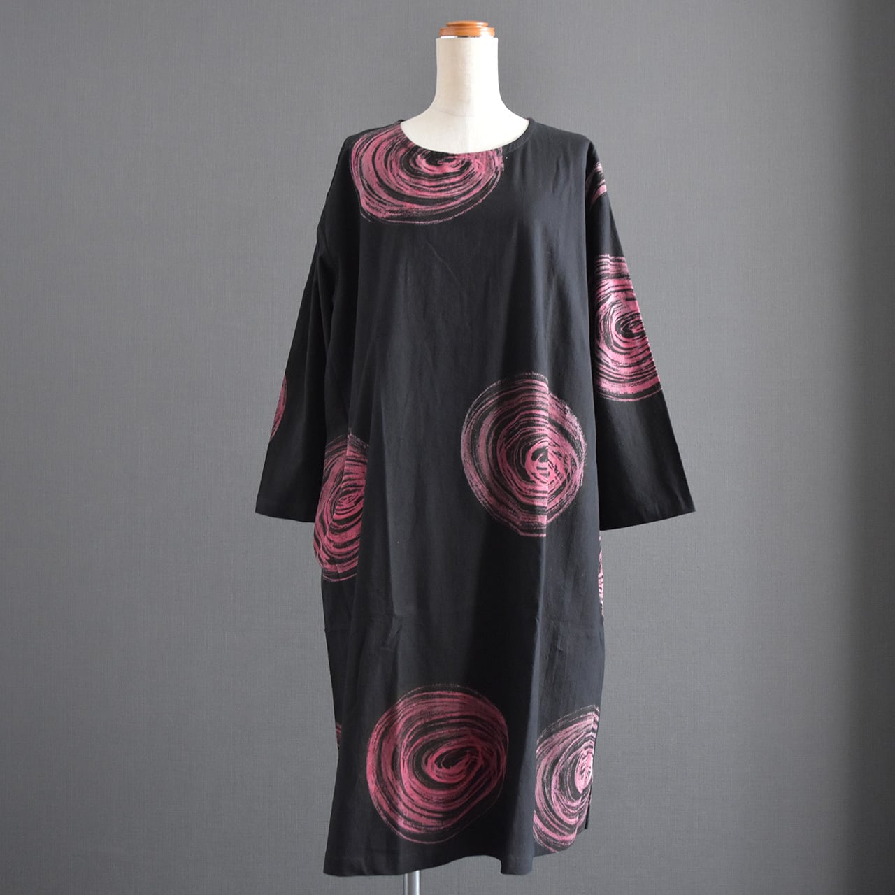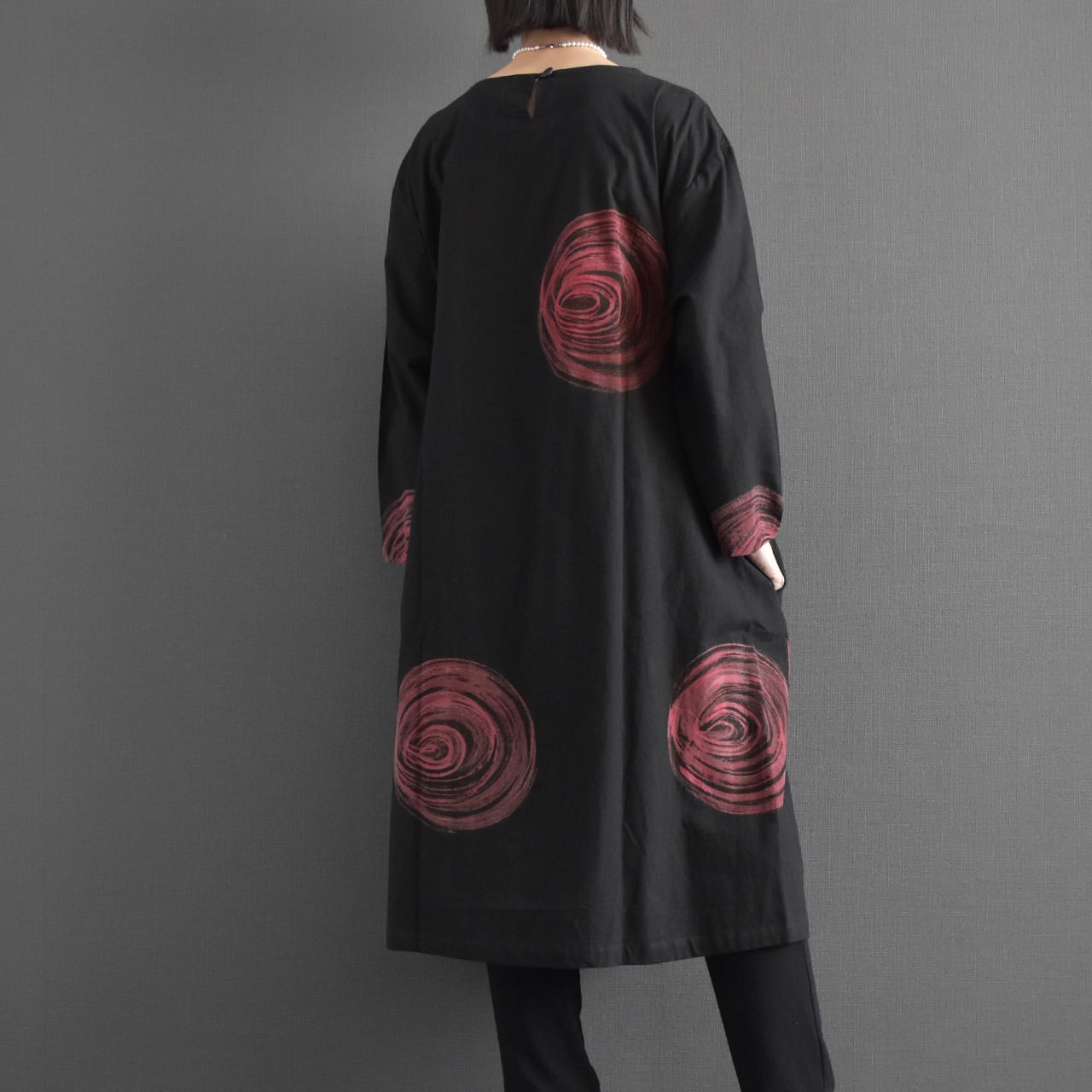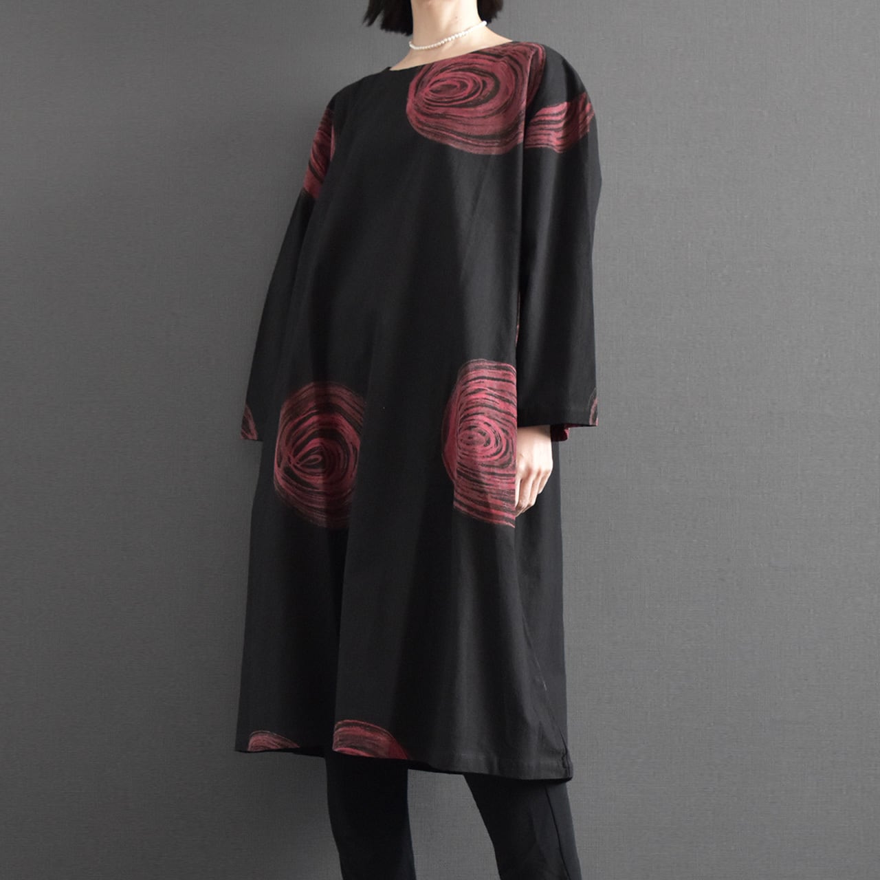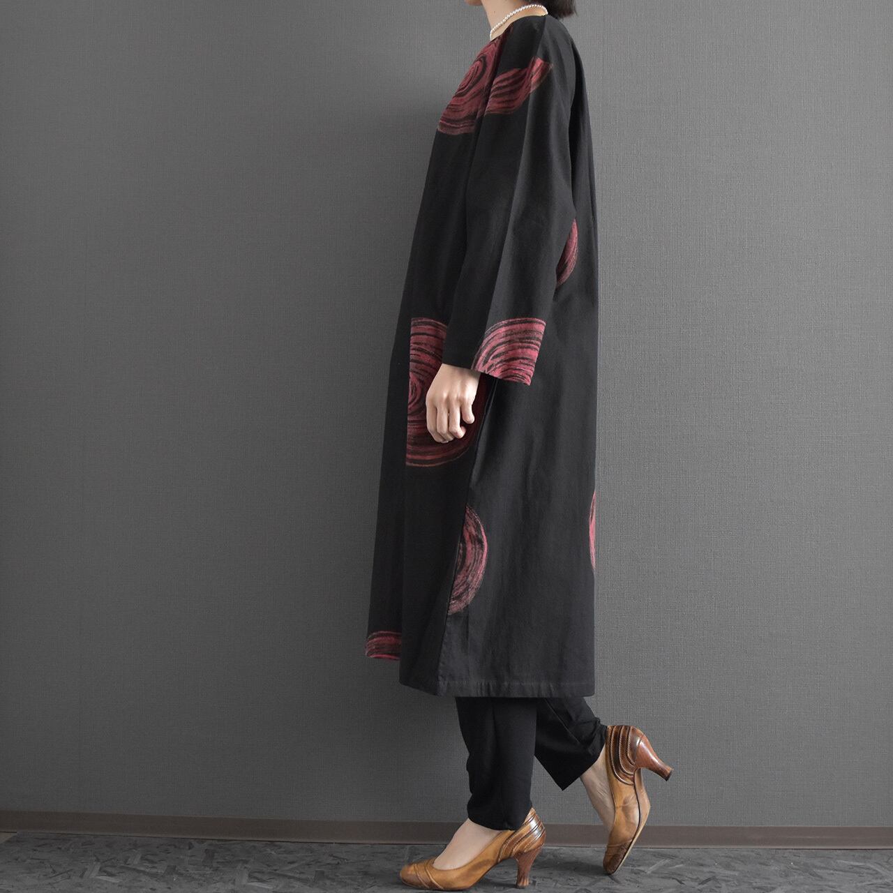 大胆な渦模様が印象的な、存在感のあるワンピース。