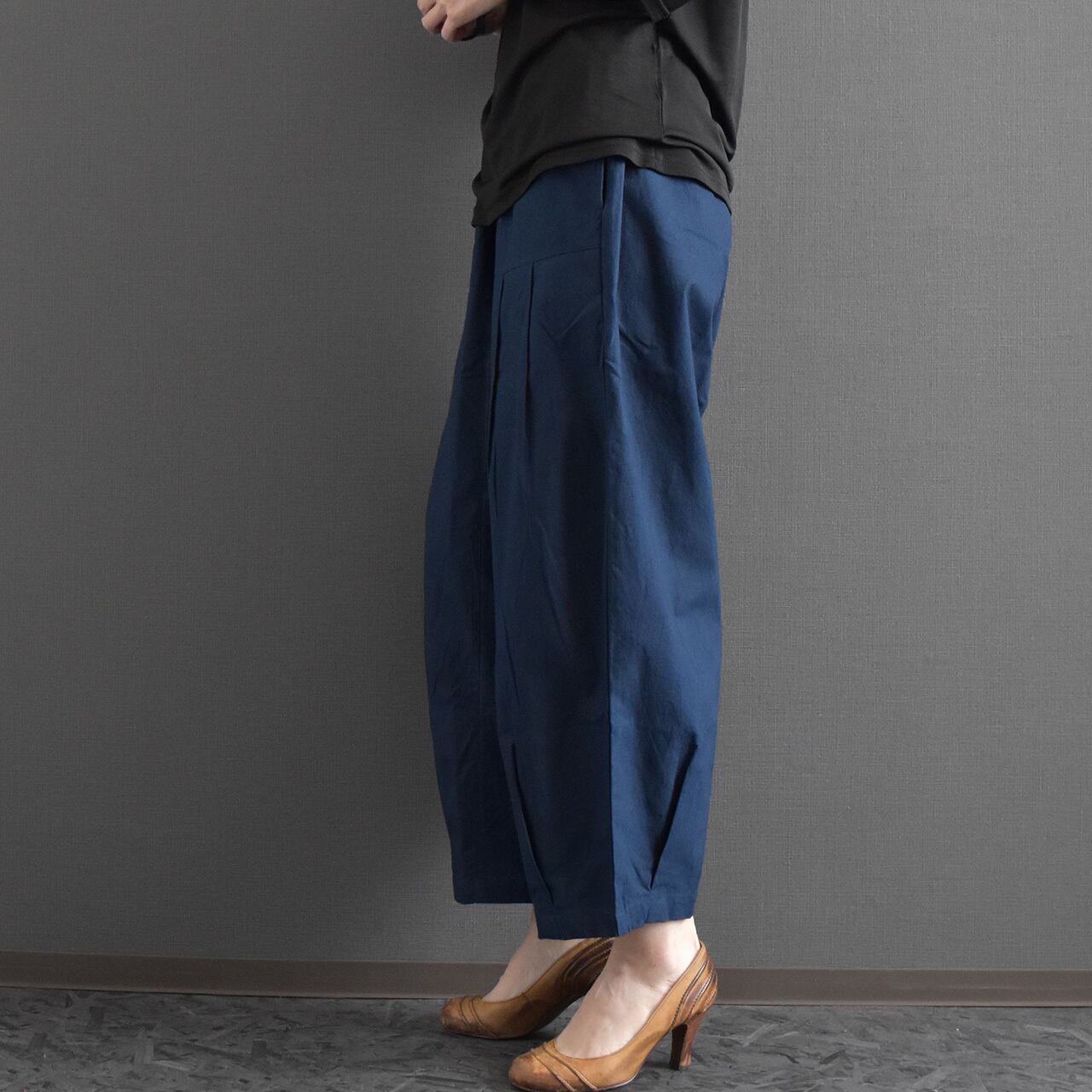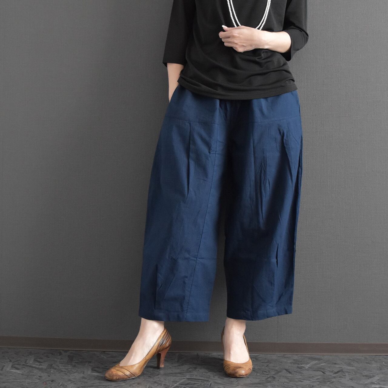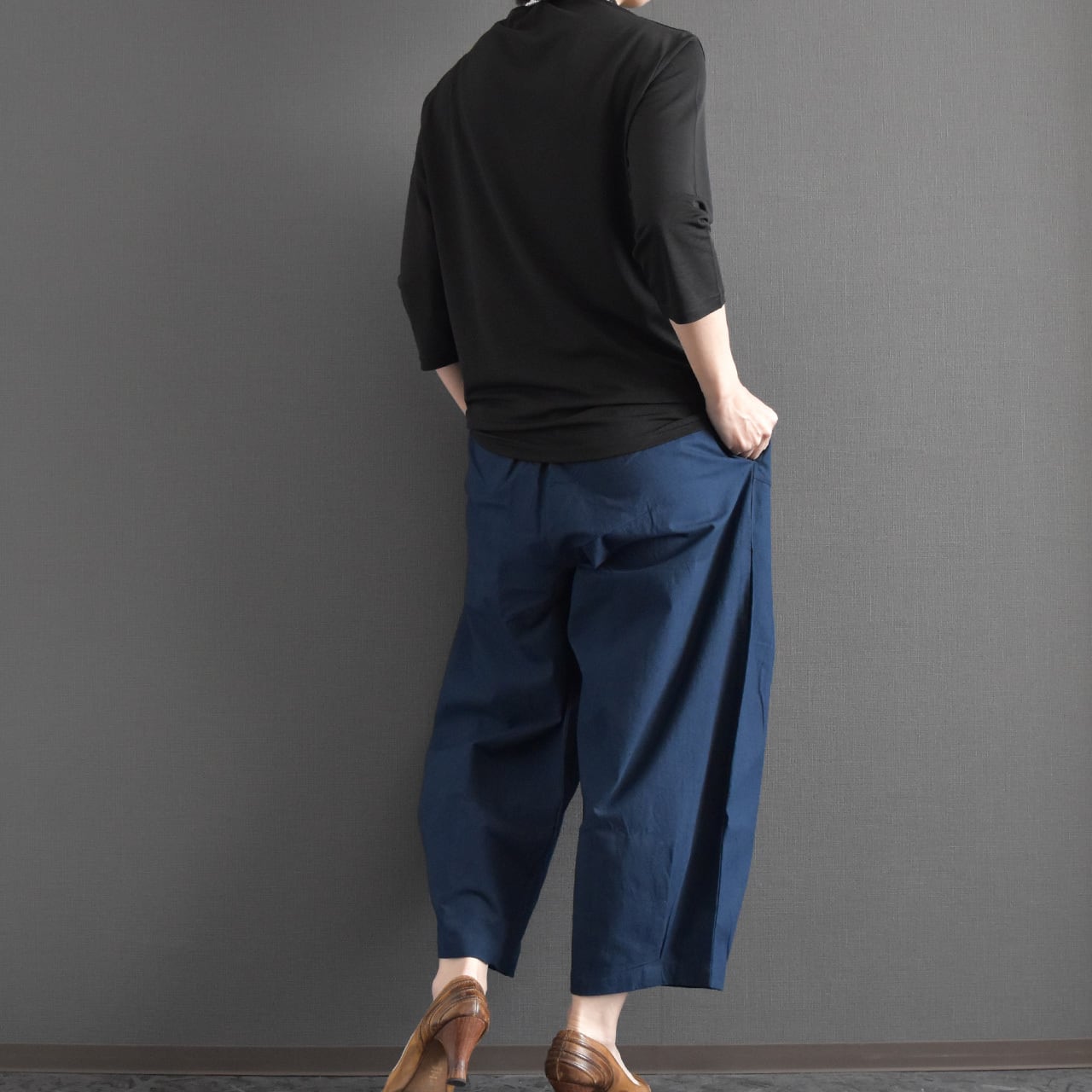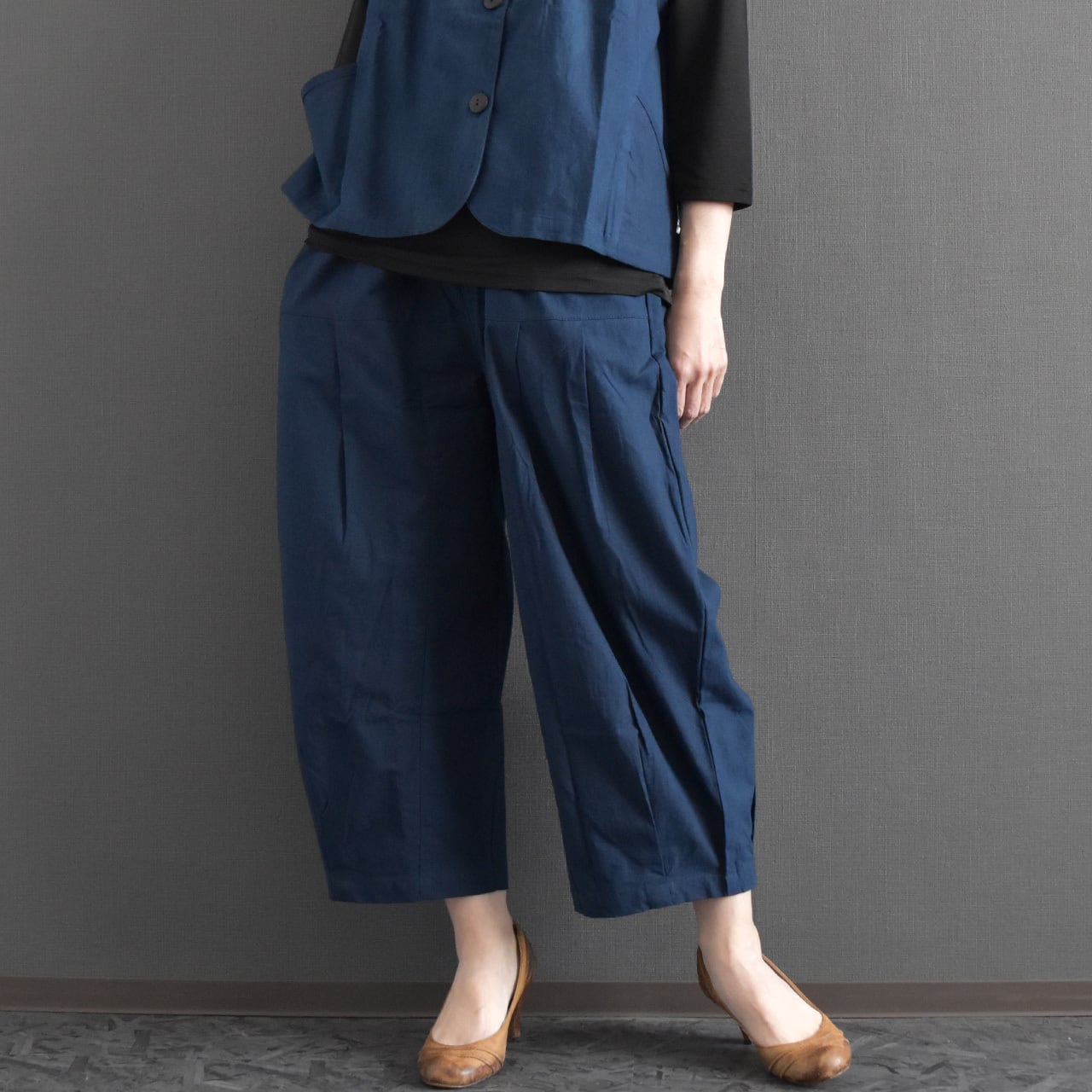 綿素材を使用した、タック切替デザインのセミワイドパンツ。