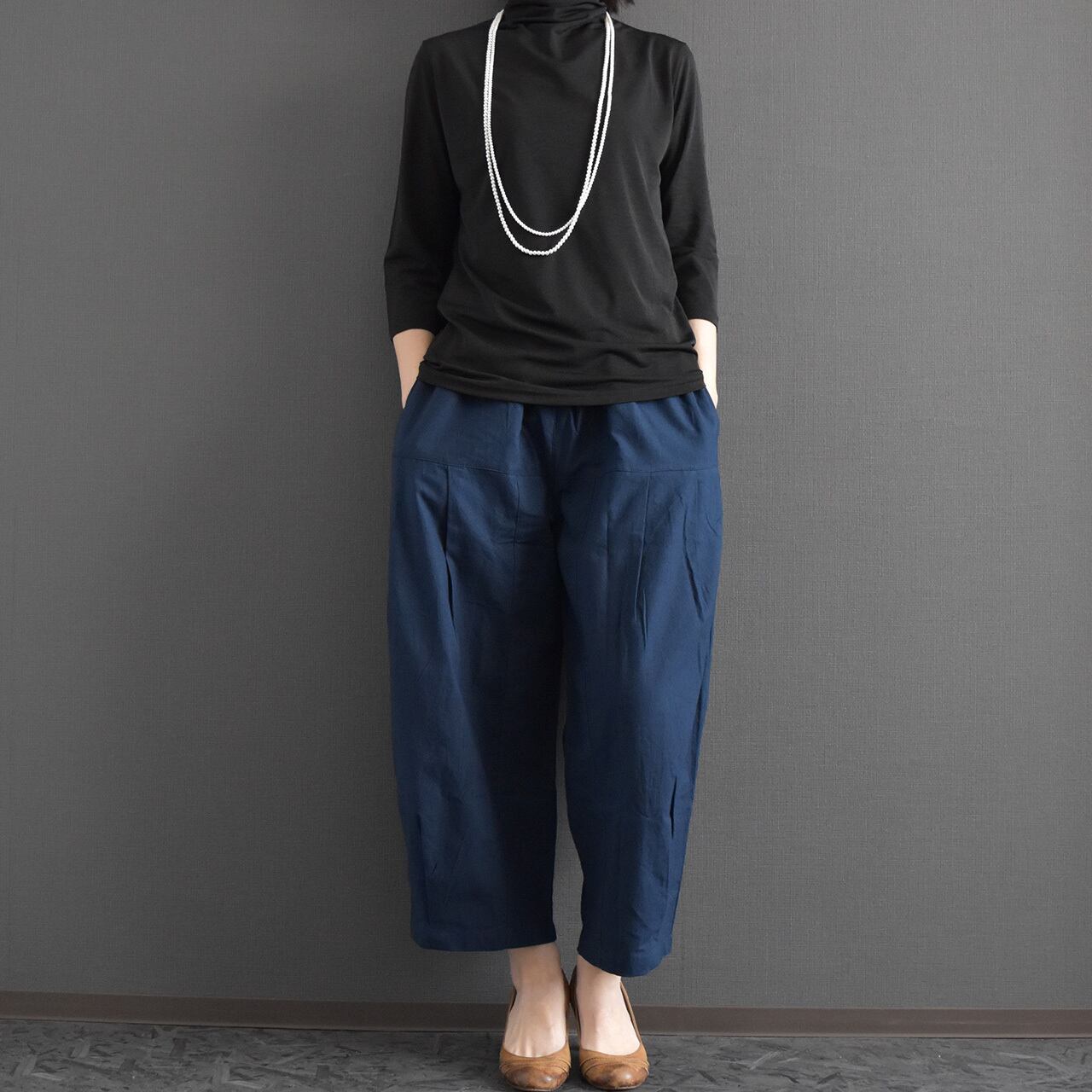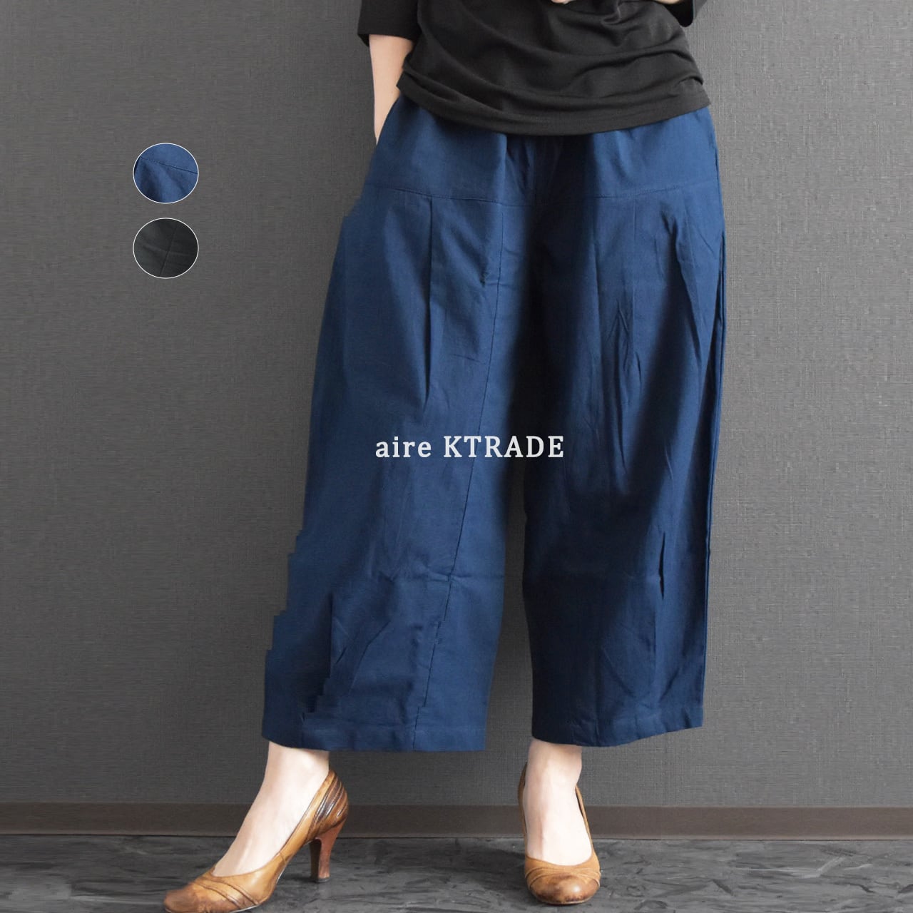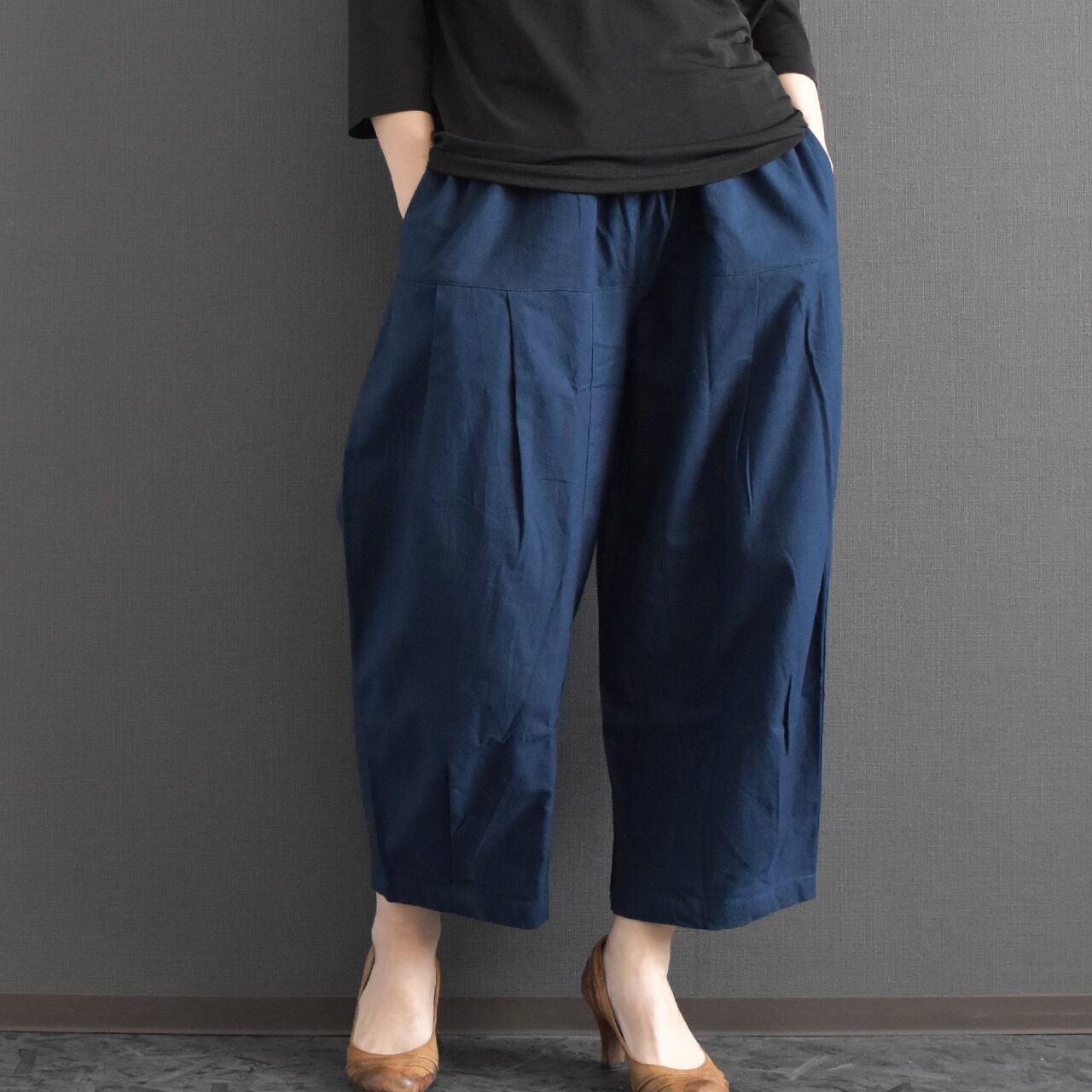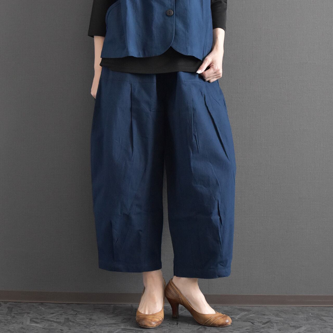 綿素材を使用した、タック切替デザインのセミワイドパンツ。