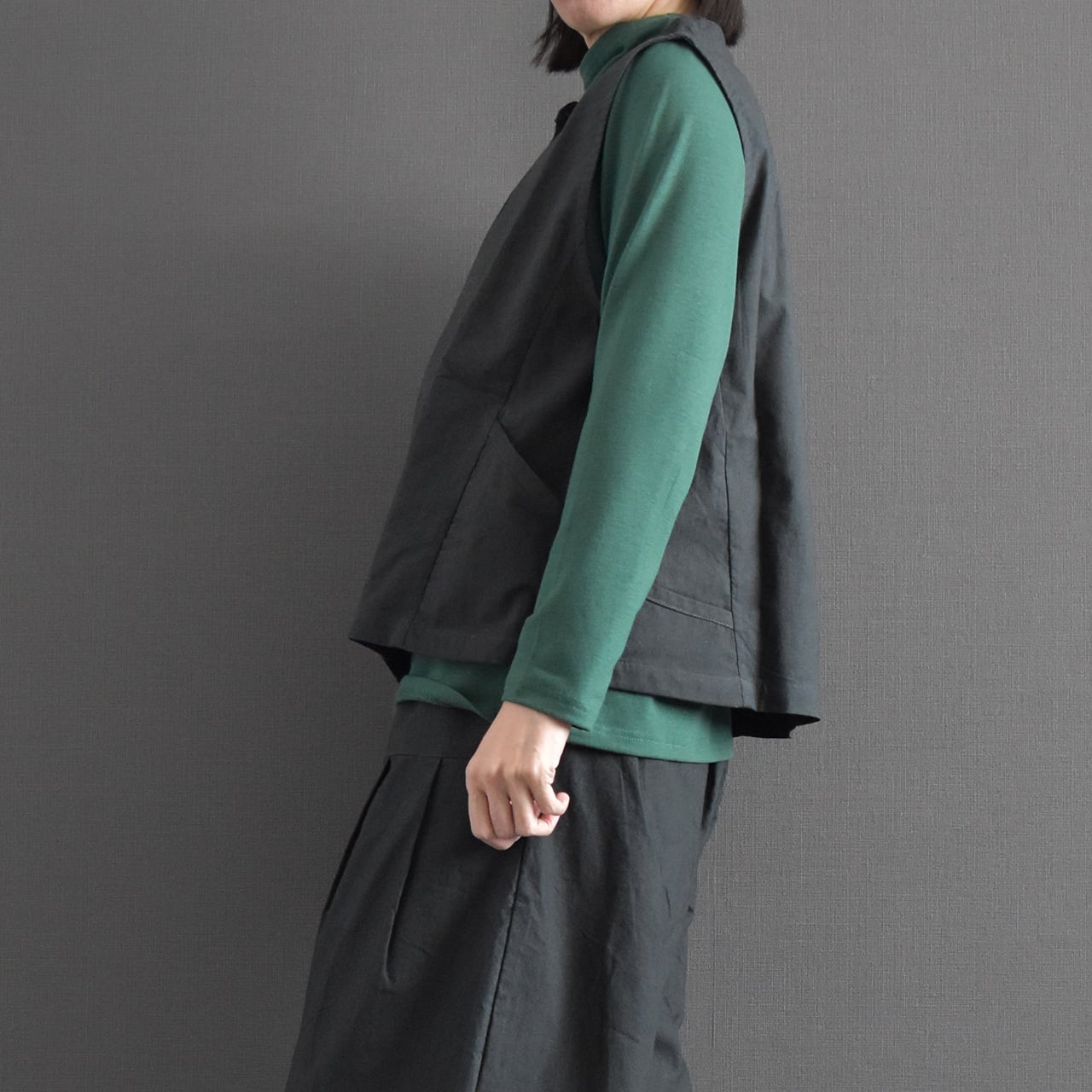 シンプルながらも立体感のあるデザインが魅力の前開きベストです。