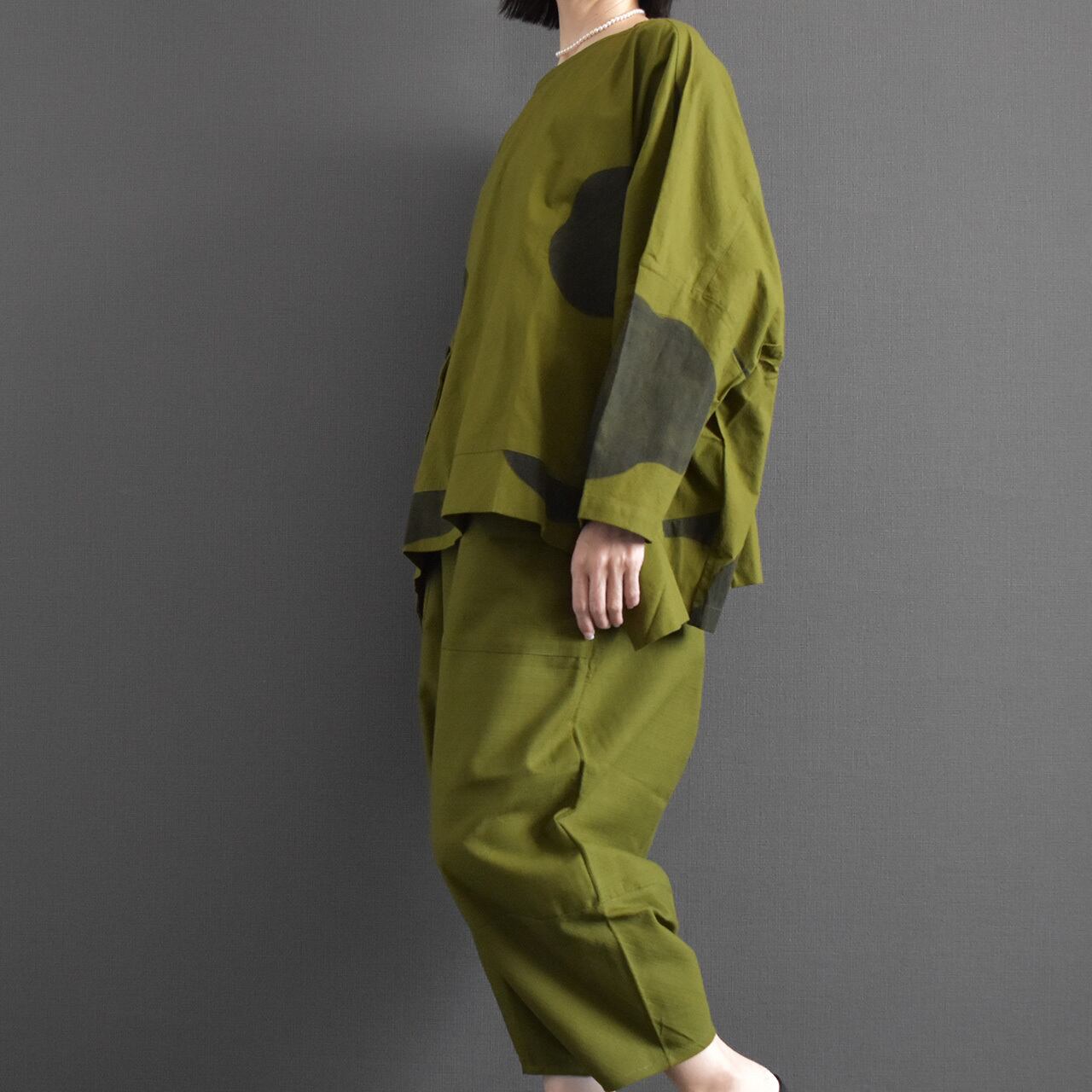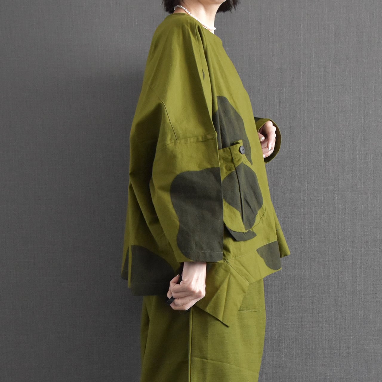 ゆったりとしたシルエットで身体のラインを拾いにくく、着るだけでコーディネートの主役になる一枚です。