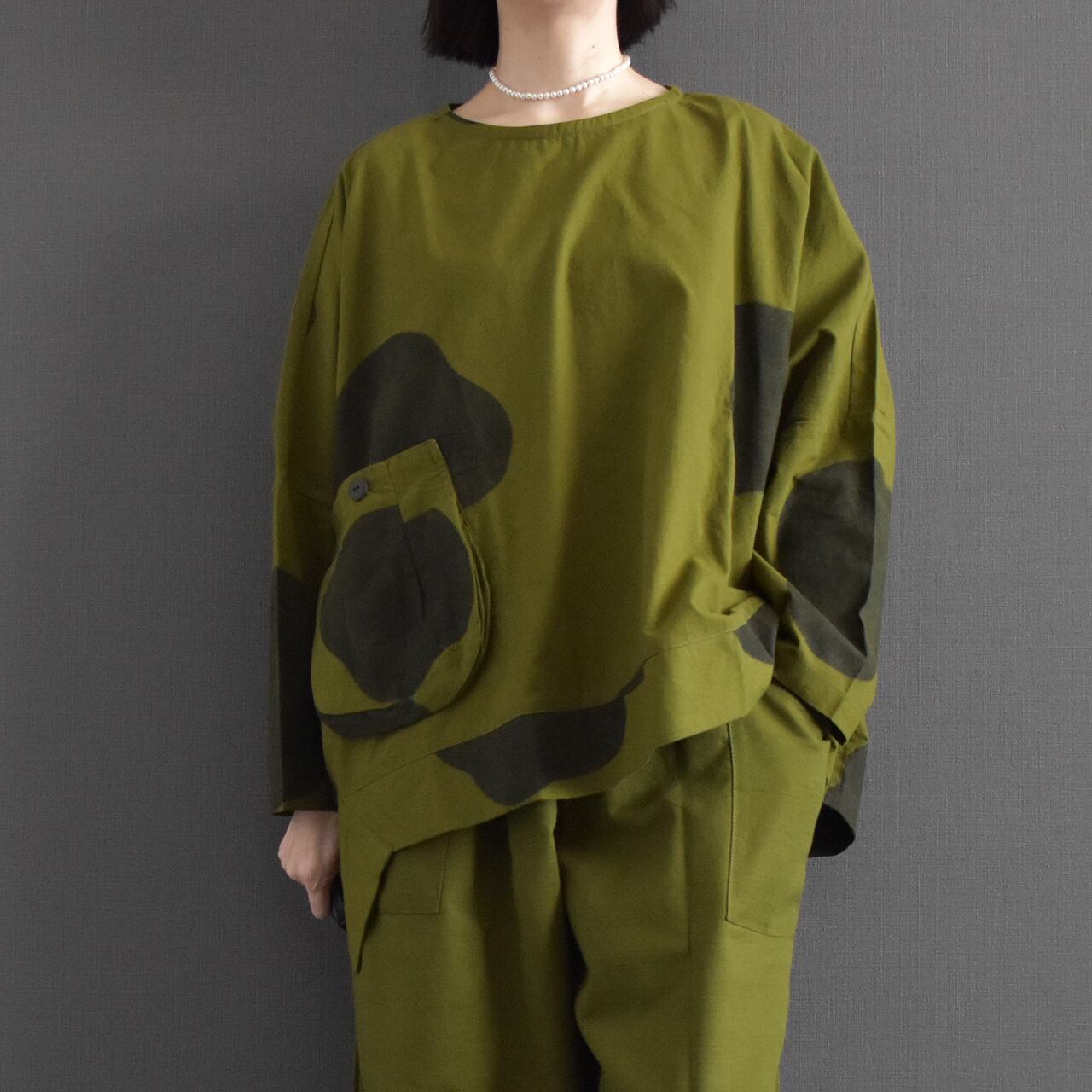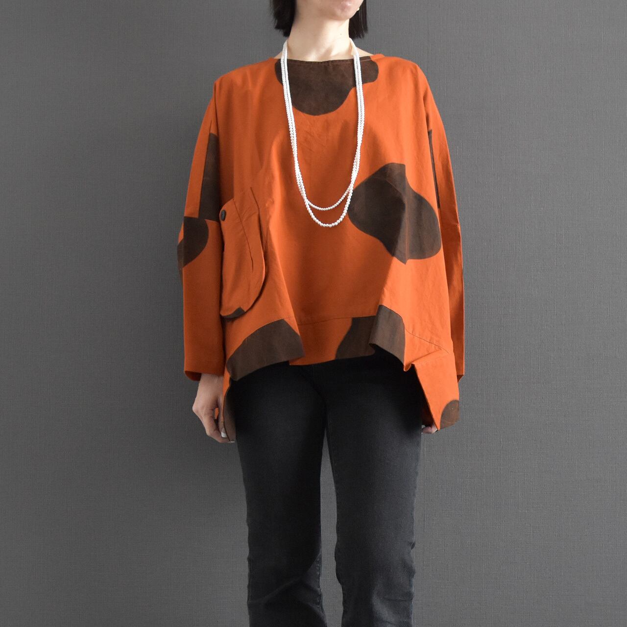 大胆な配色と丸みのあるモチーフが目を惹く、アート感覚のデザイントップス。