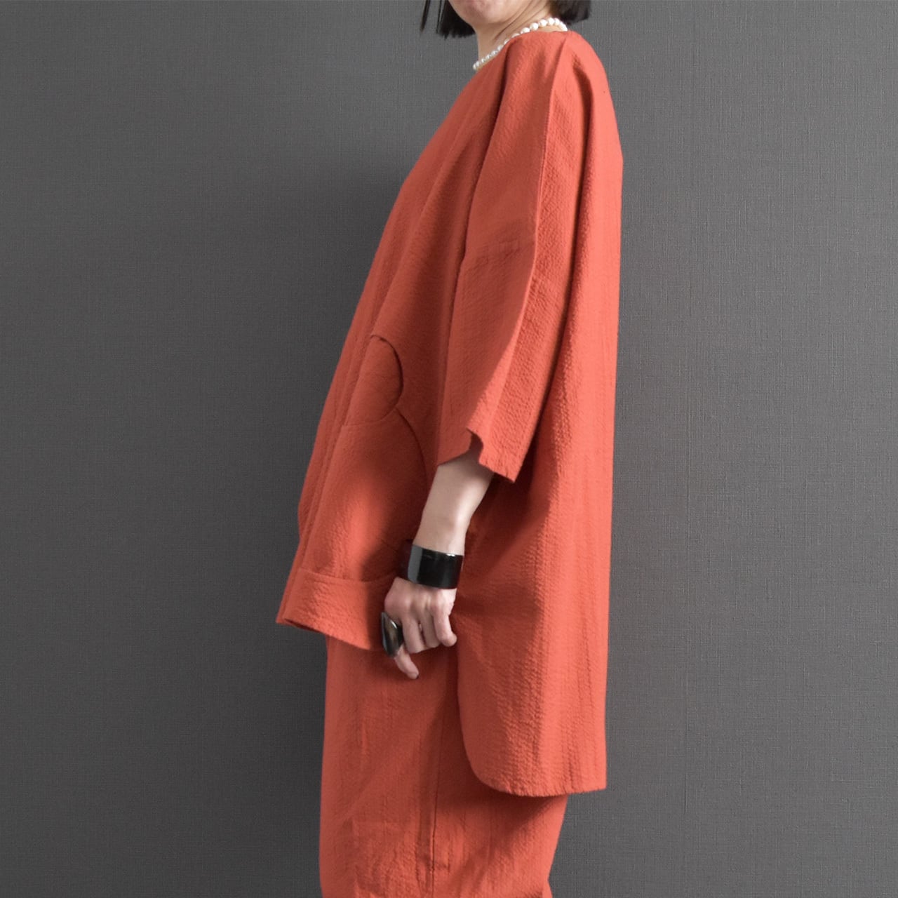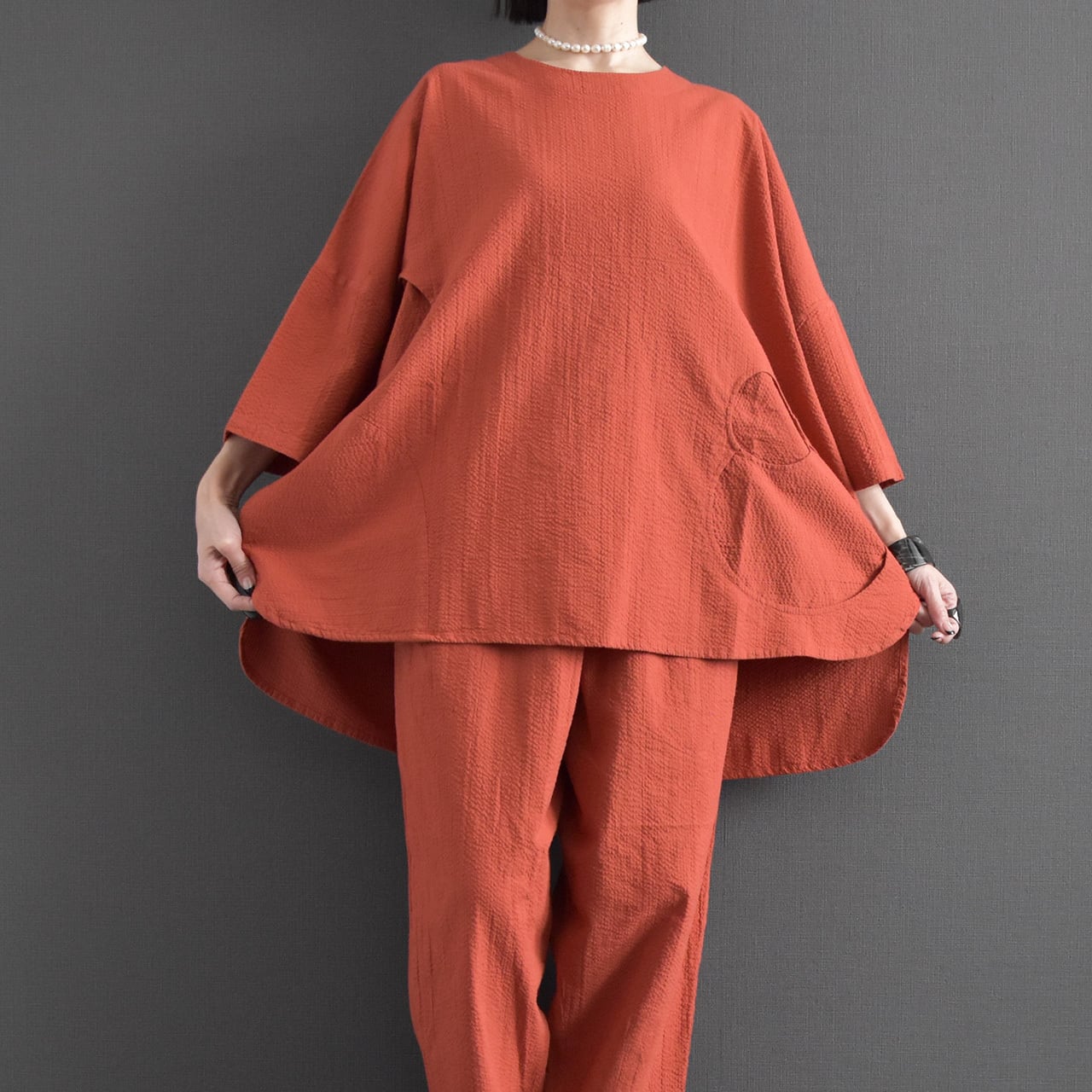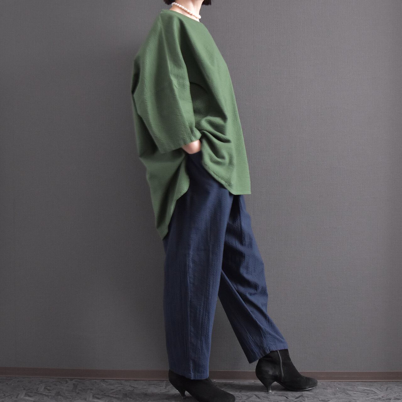素材には、表情のある綿生地を使用。 細かな凹凸のある風合いが、シンプルながらも奥行きのある印象を与えます。