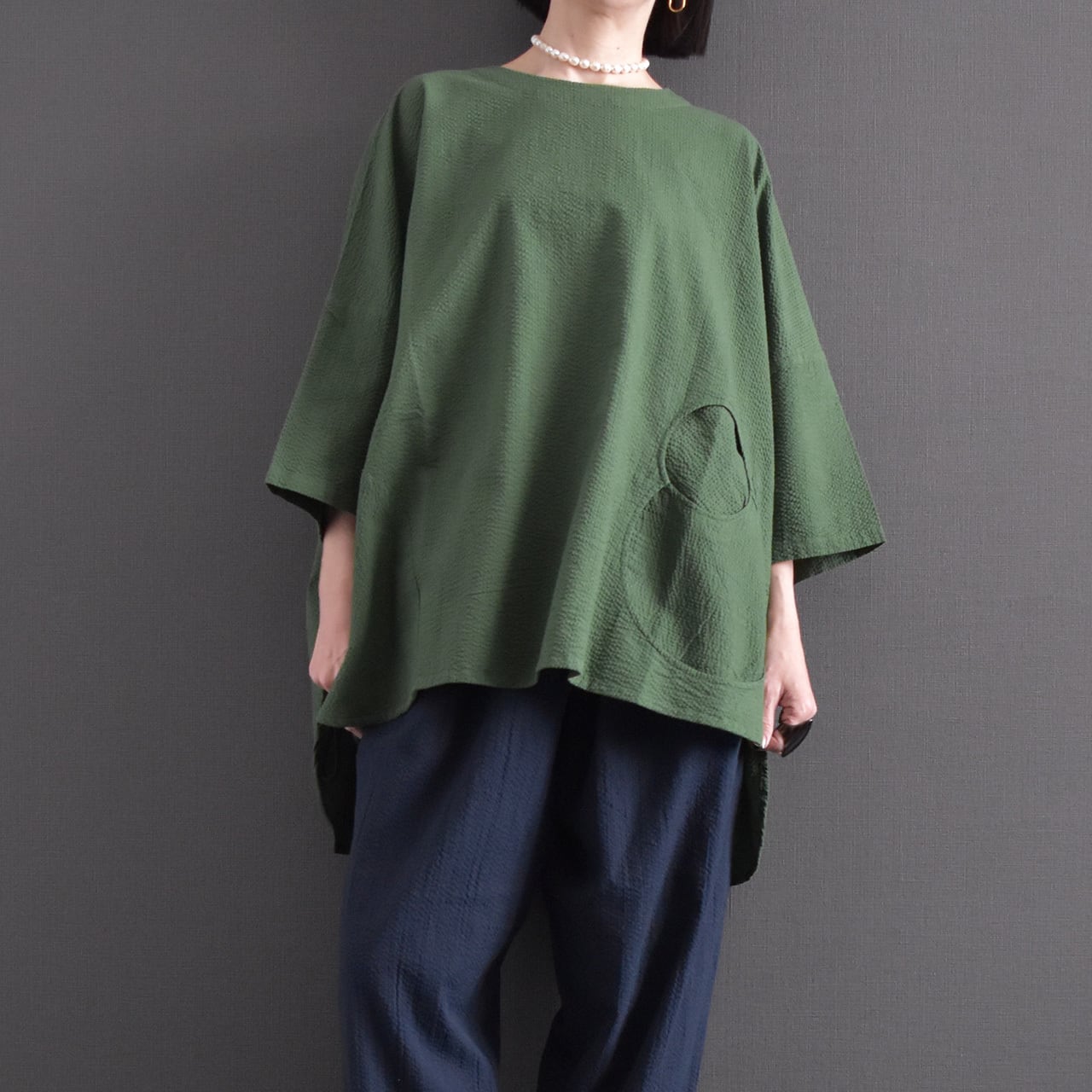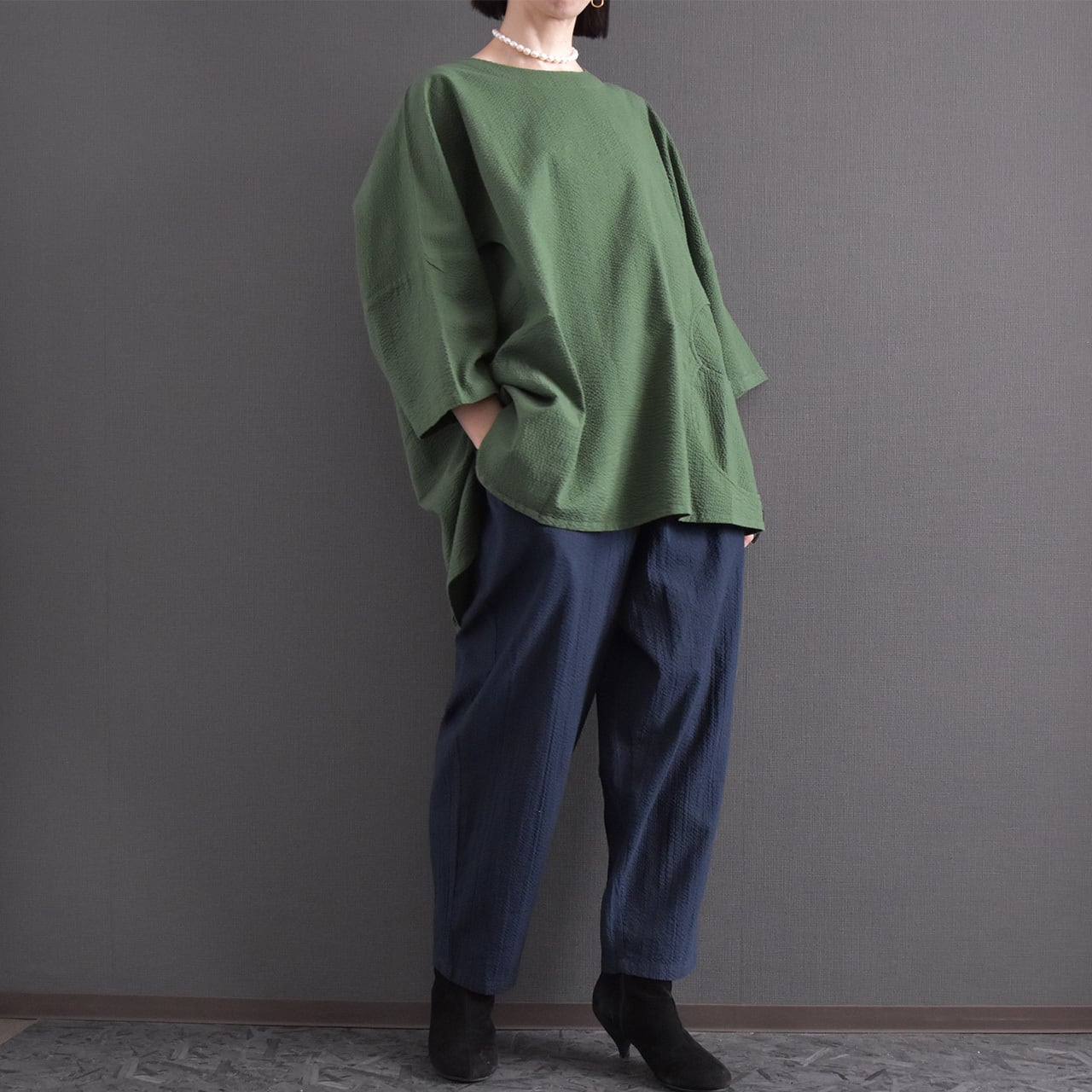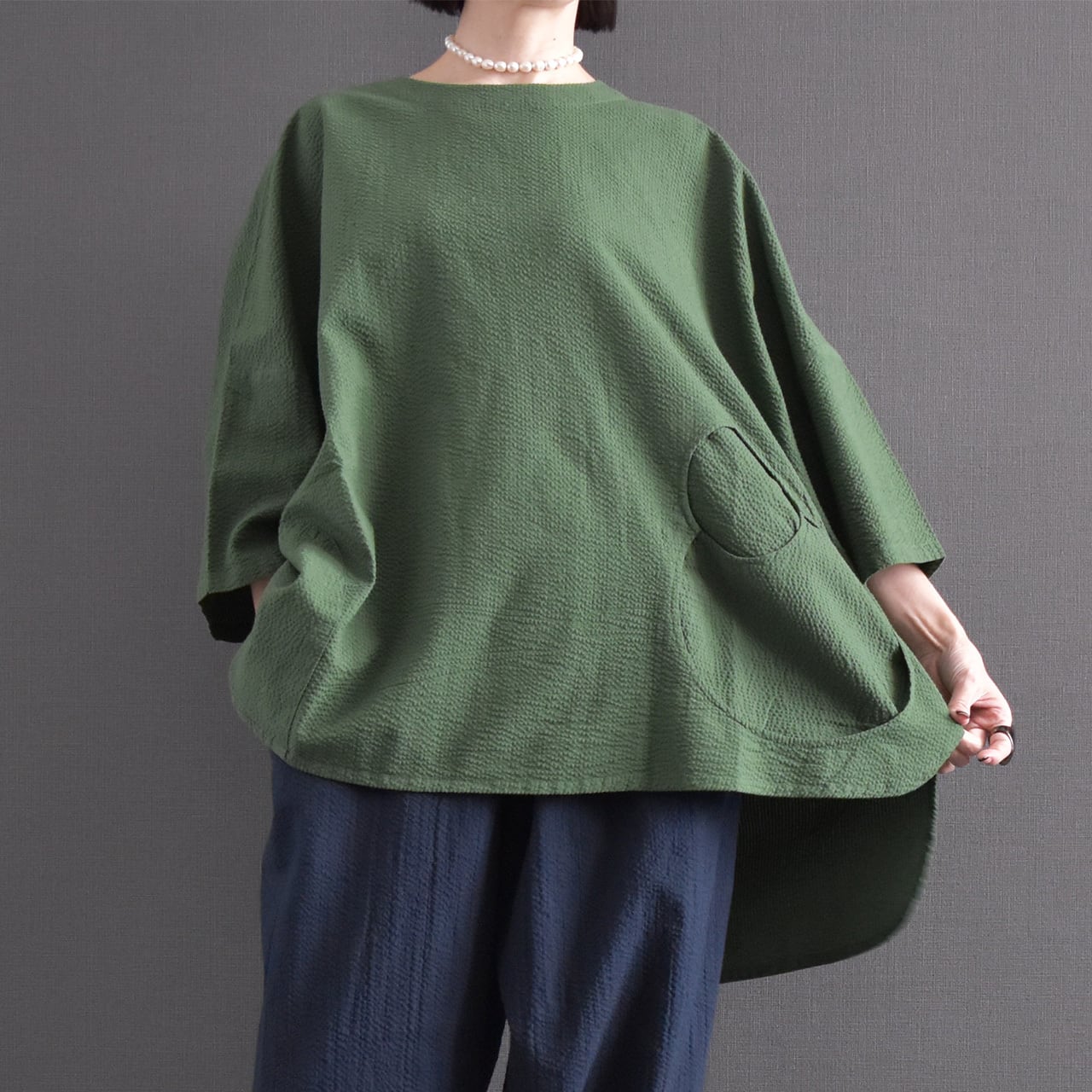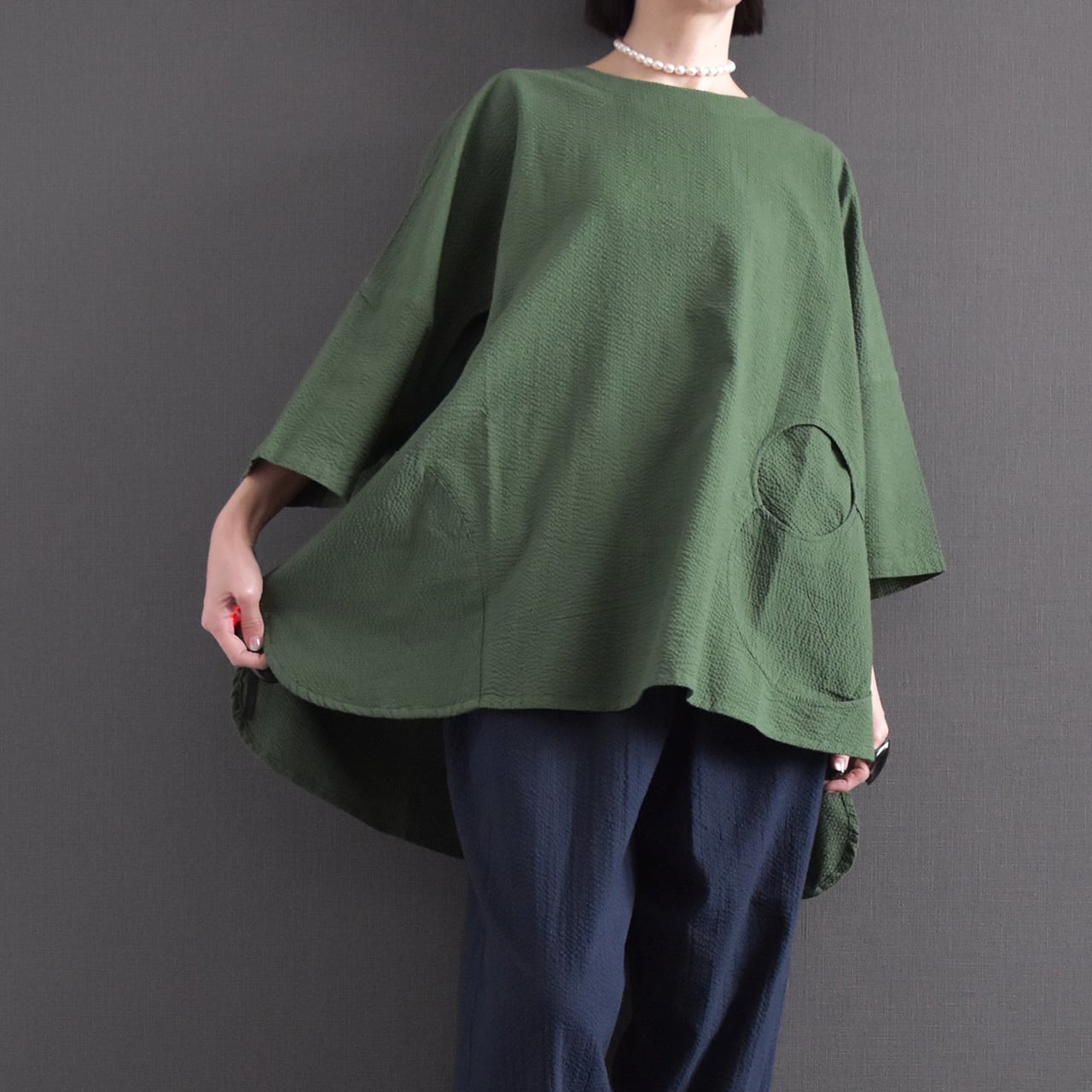 素材には、表情のある綿生地を使用。 細かな凹凸のある風合いが、シンプルながらも奥行きのある印象を与えます。