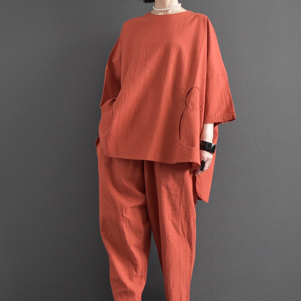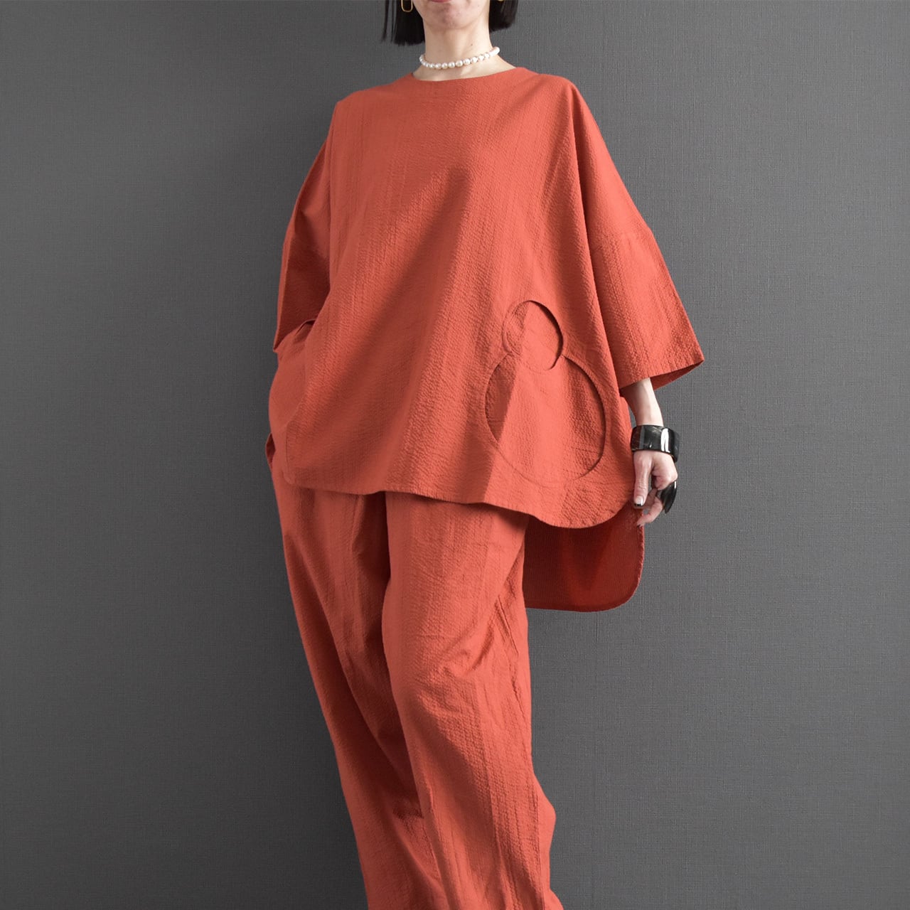 身幅をたっぷりと取ったワイドシルエットに、サイドに配した丸みのある切替デザインがアクセントになっています。