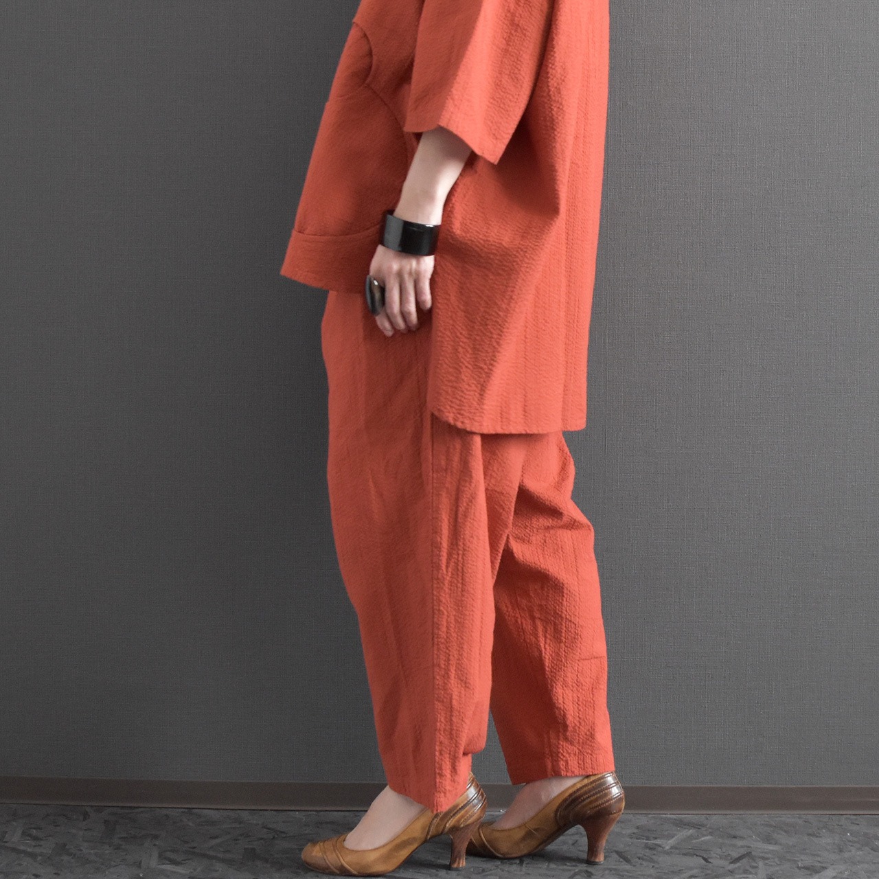 凹凸のあるコットン生地を使用した、ナチュラルな風合いが魅力のテーパードパンツです。