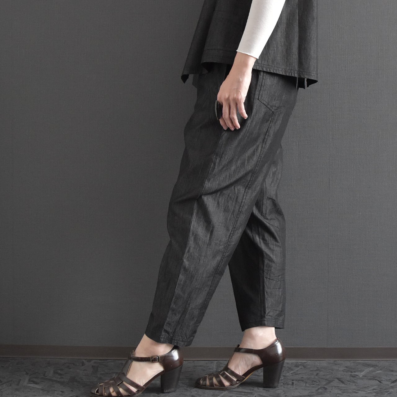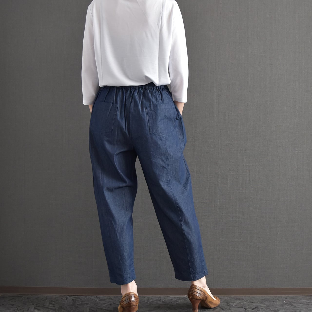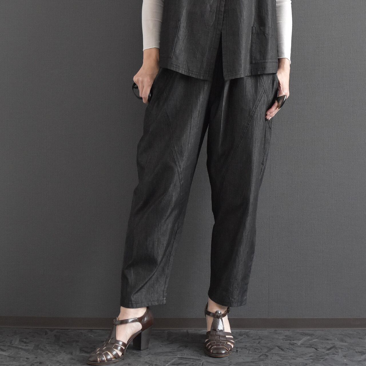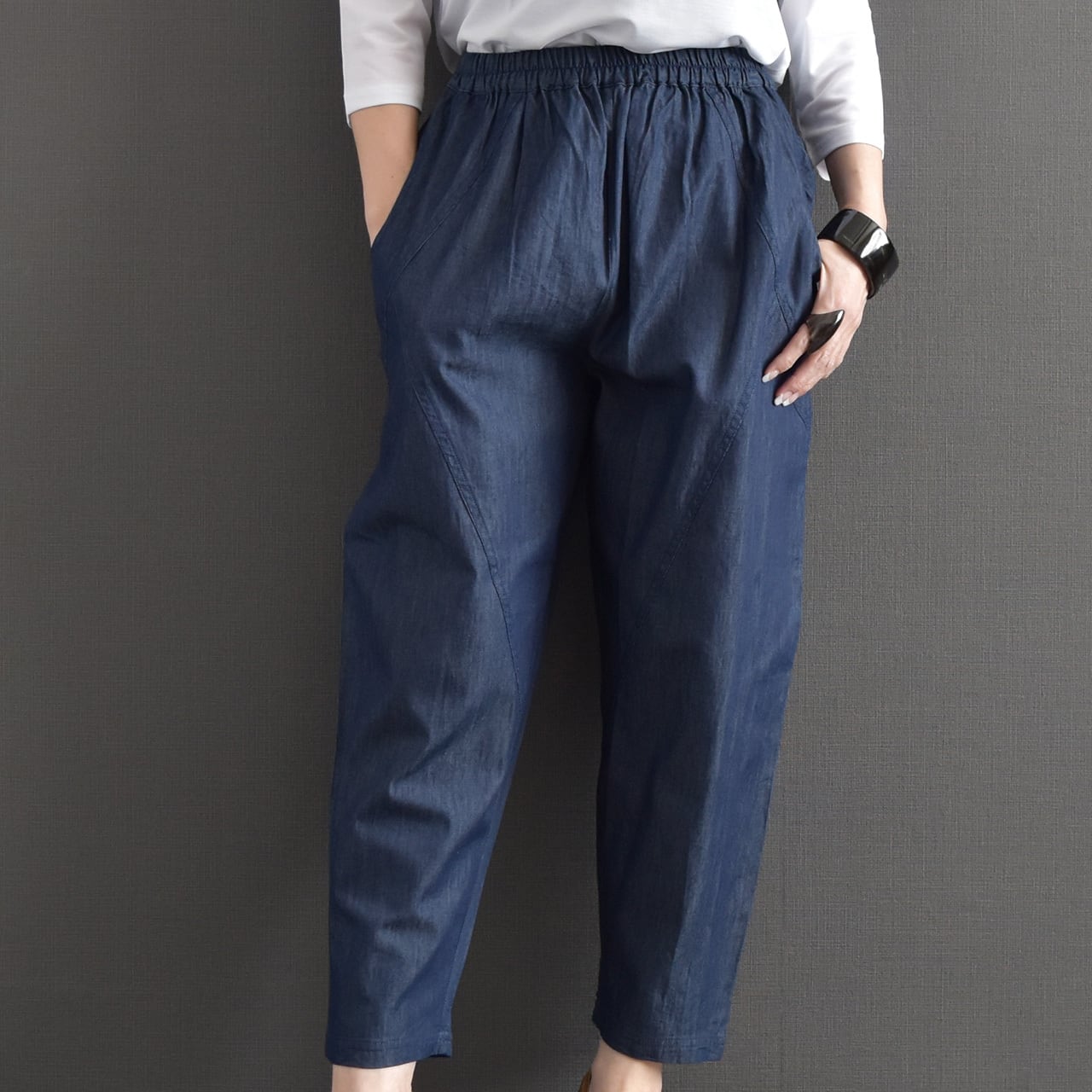 ウエストは総ゴム仕様で、締め付け感が少なくデイリーに取り入れやすいデザイン。 ヒップから太ももにかけてはゆとりを持たせ、裾に向かってすっきりとしたシルエットで、体のラインを拾いにくいのもポイントです。