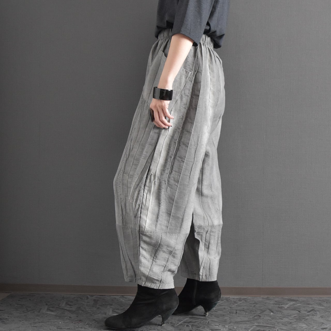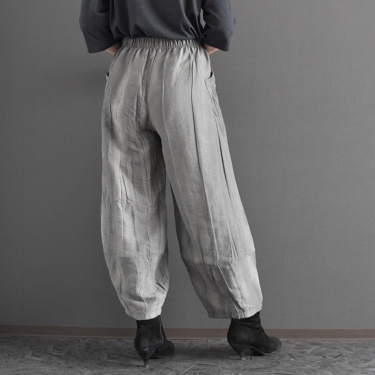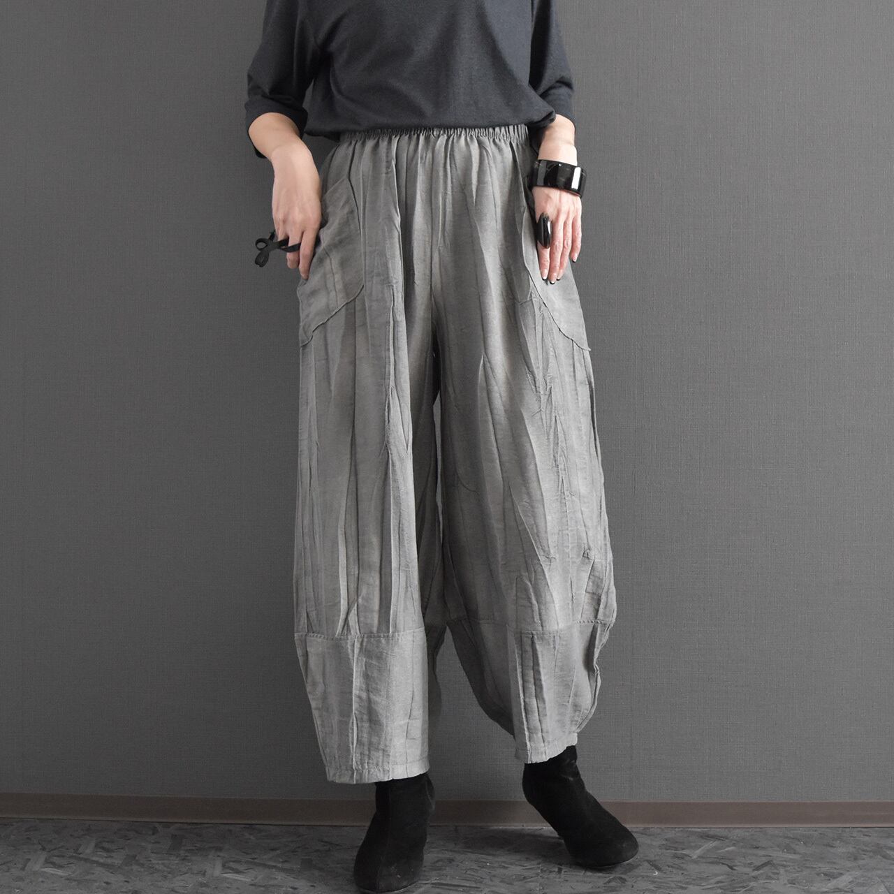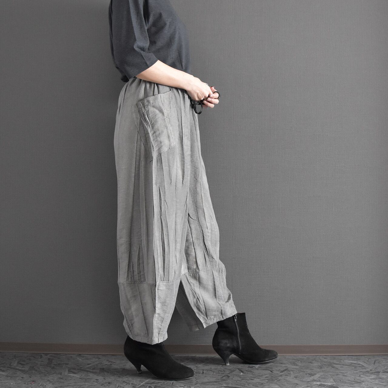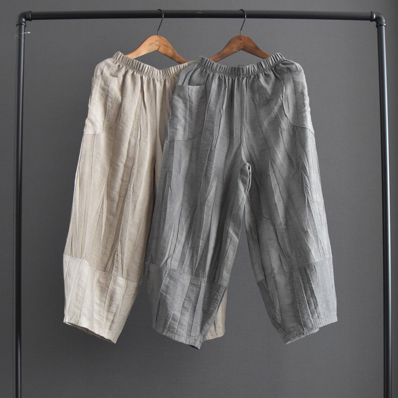 絞り染めを施した、表情のある麻混素材のイージーパンツです。