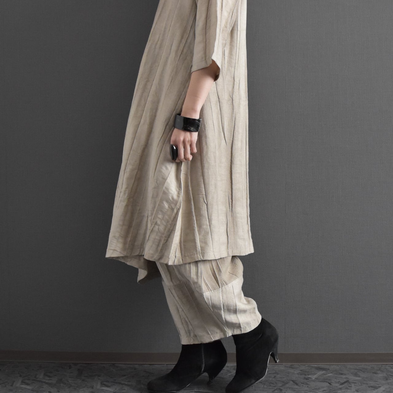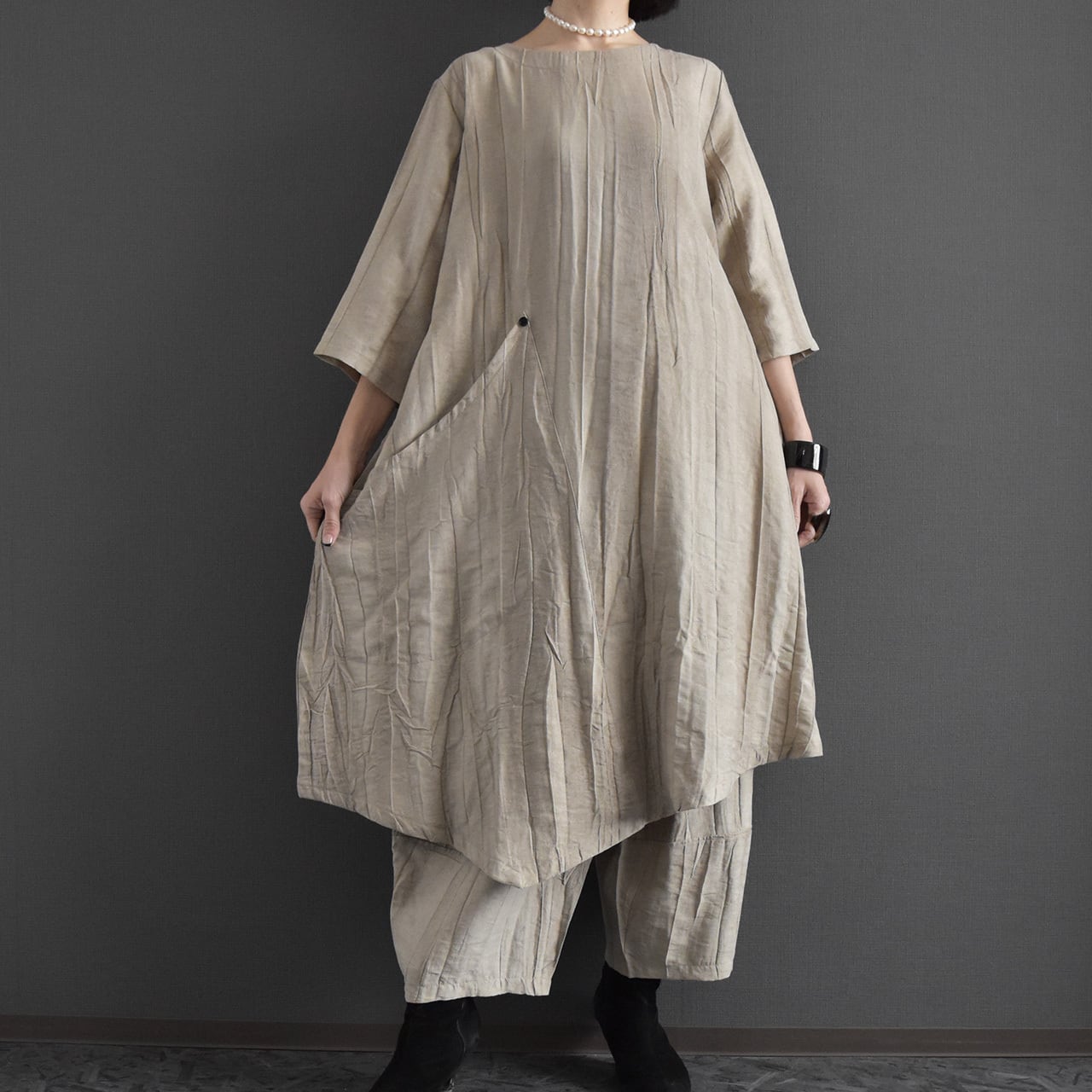 落ち着いたニュアンスカラーと表情のある素材感が、洗練された大人の雰囲気を演出します。