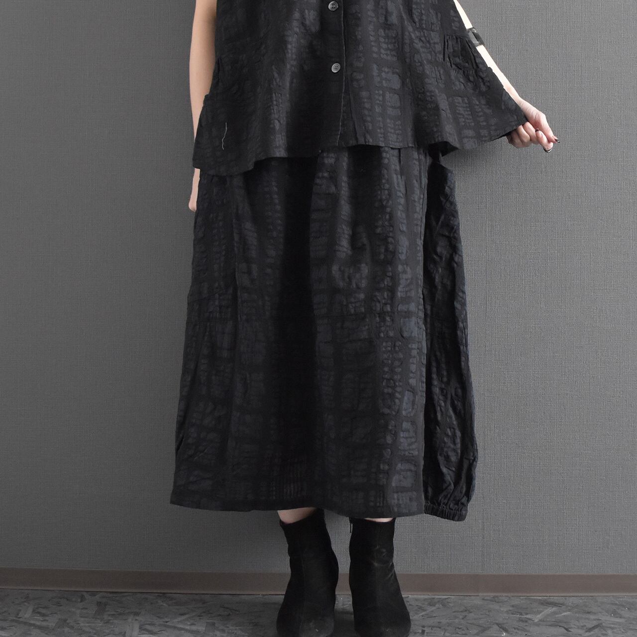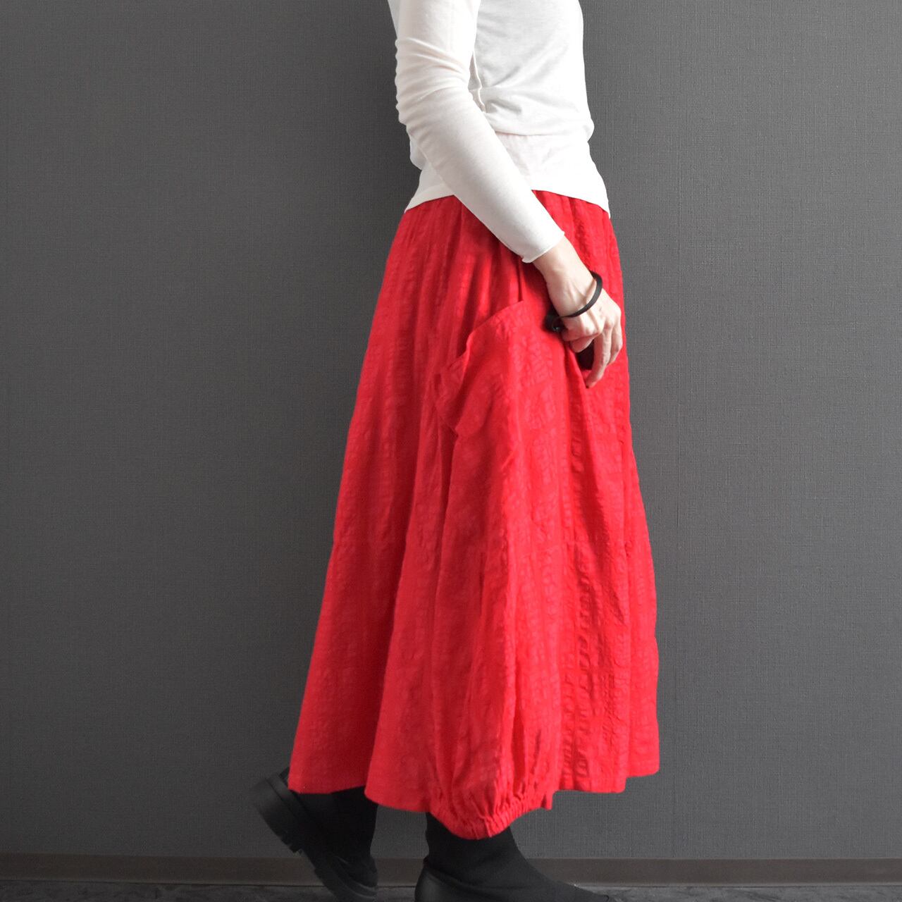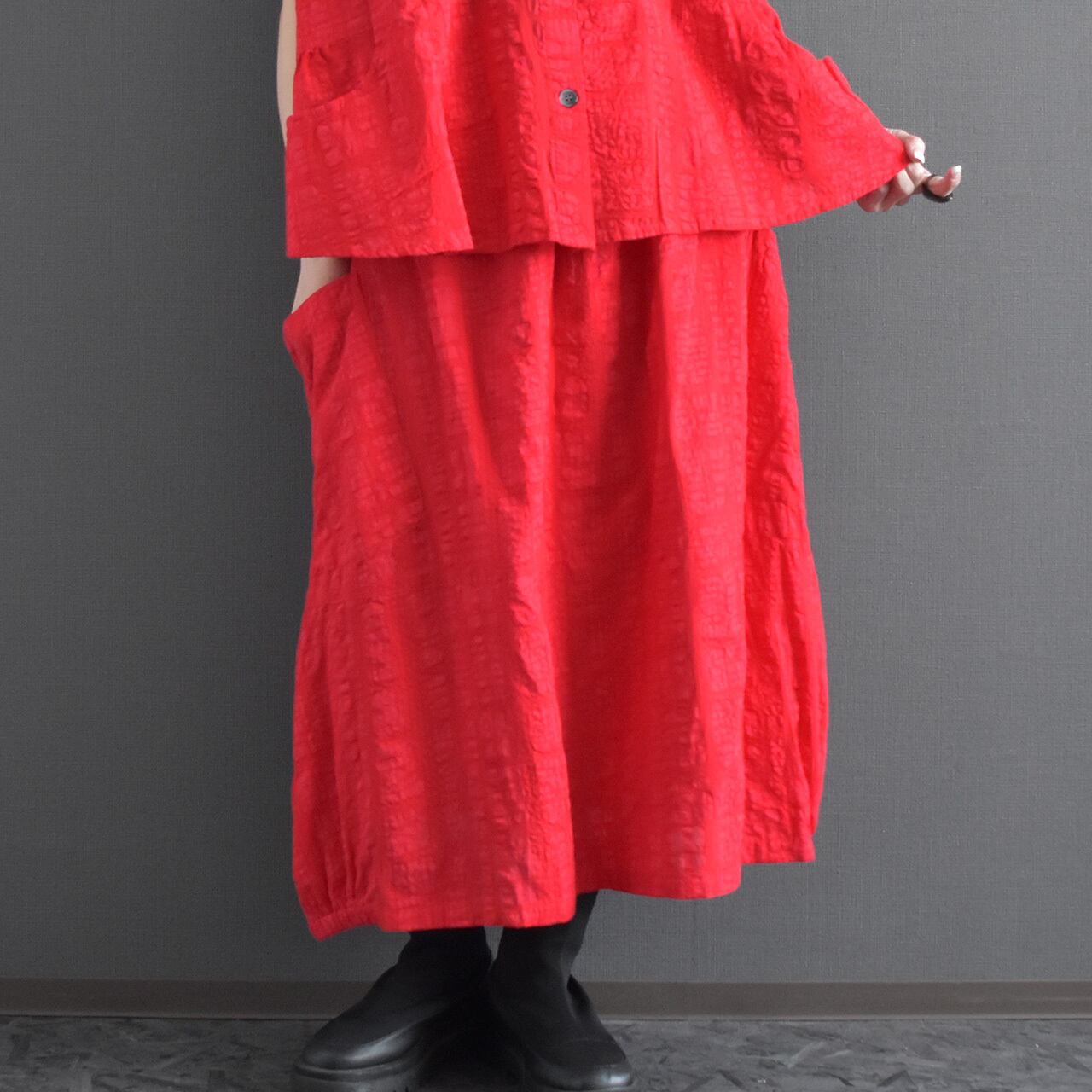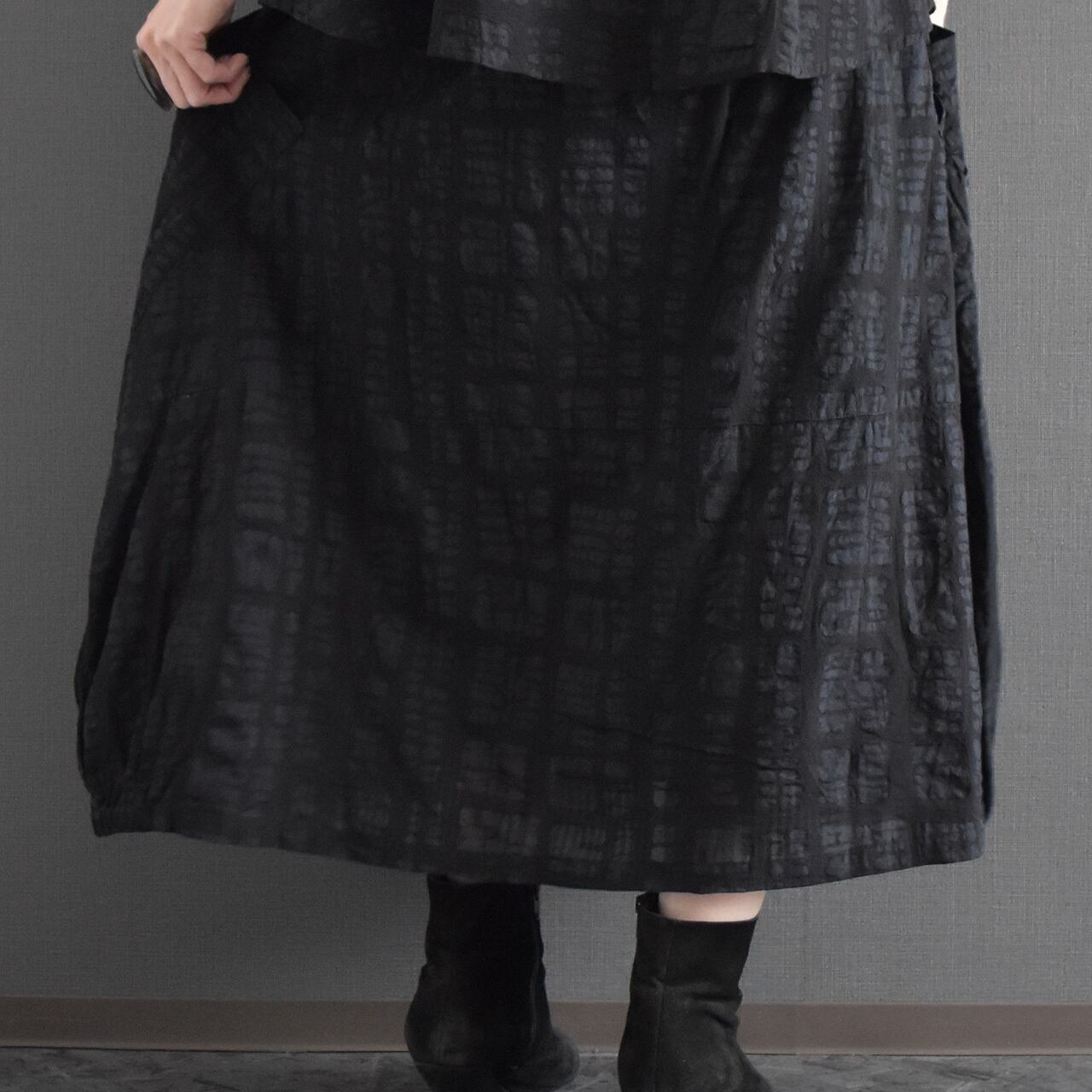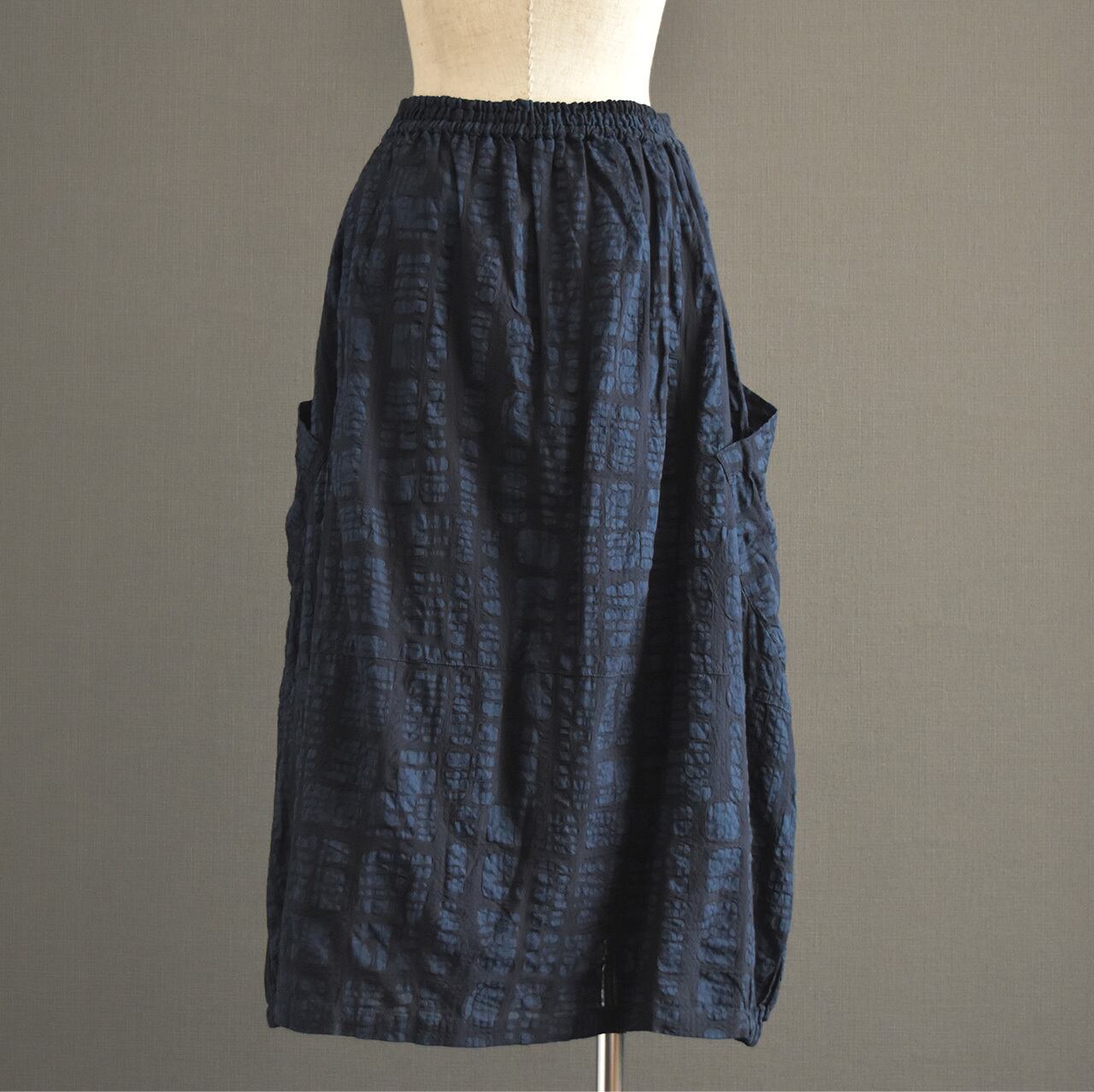 ブロックモチーフのエンボス加工を施した、表情のある綿生地を使用したスカートです。