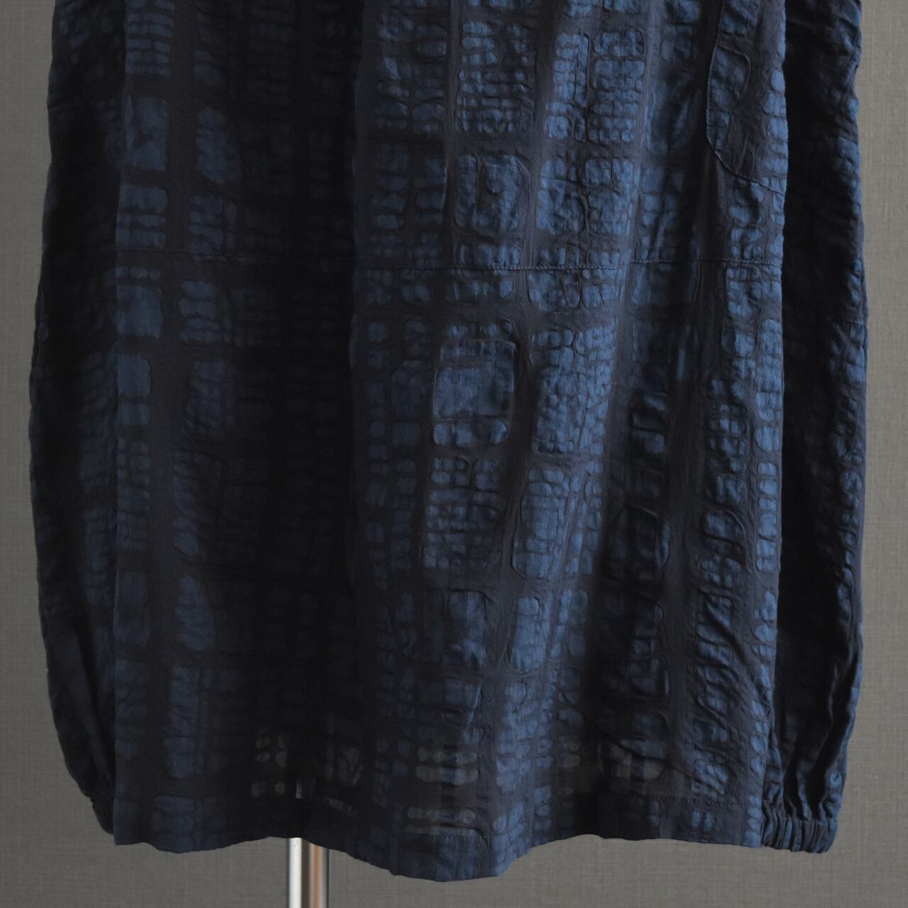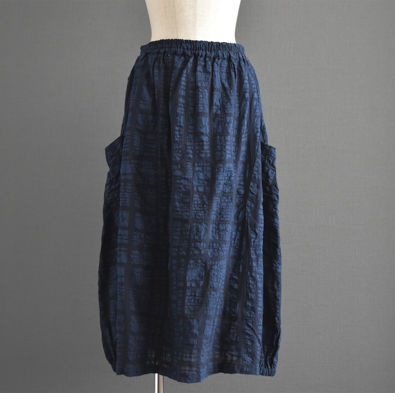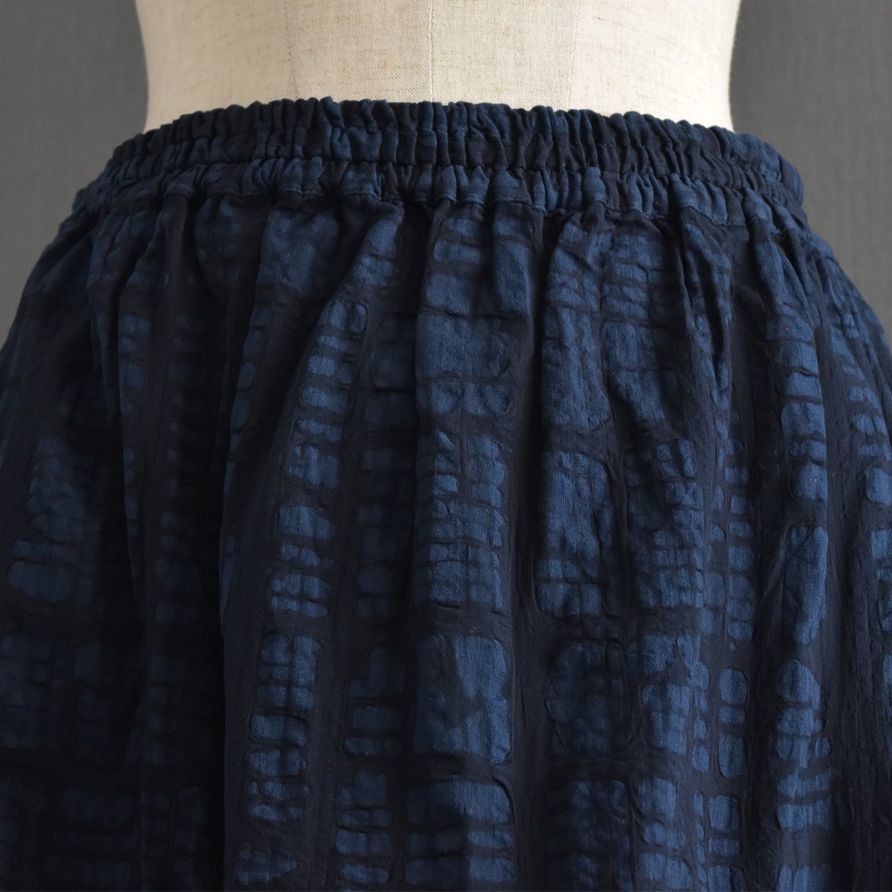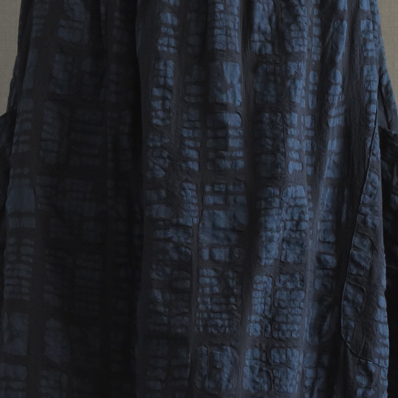 ブロックモチーフのエンボス加工を施した、表情のある綿生地を使用したスカートです。