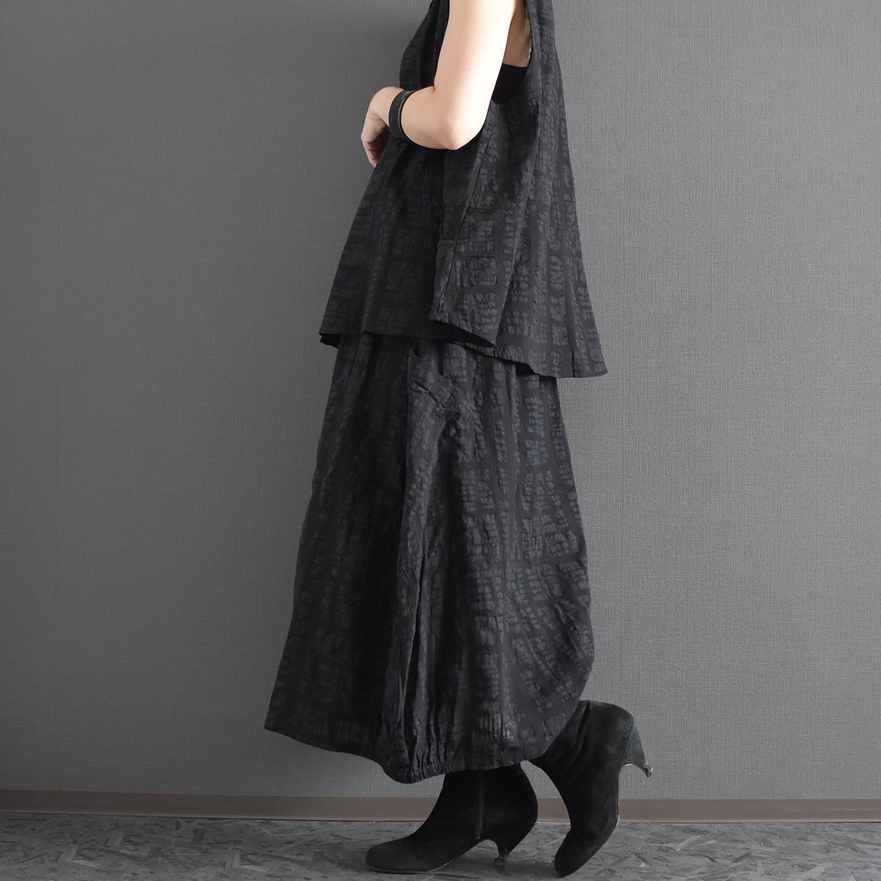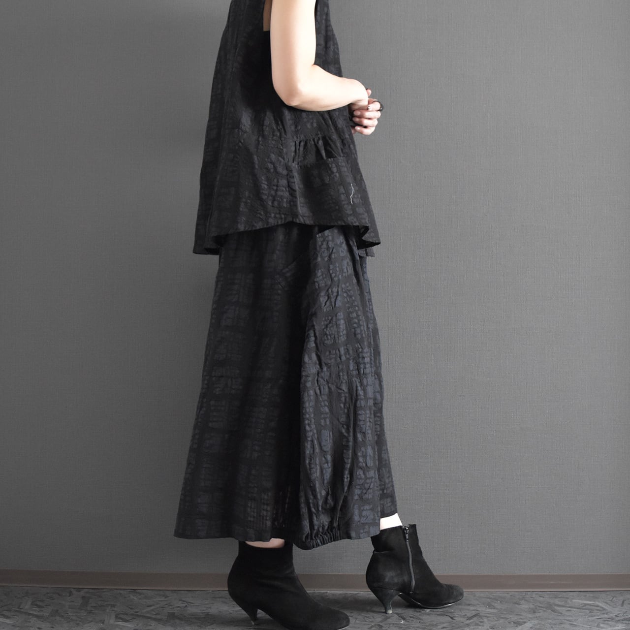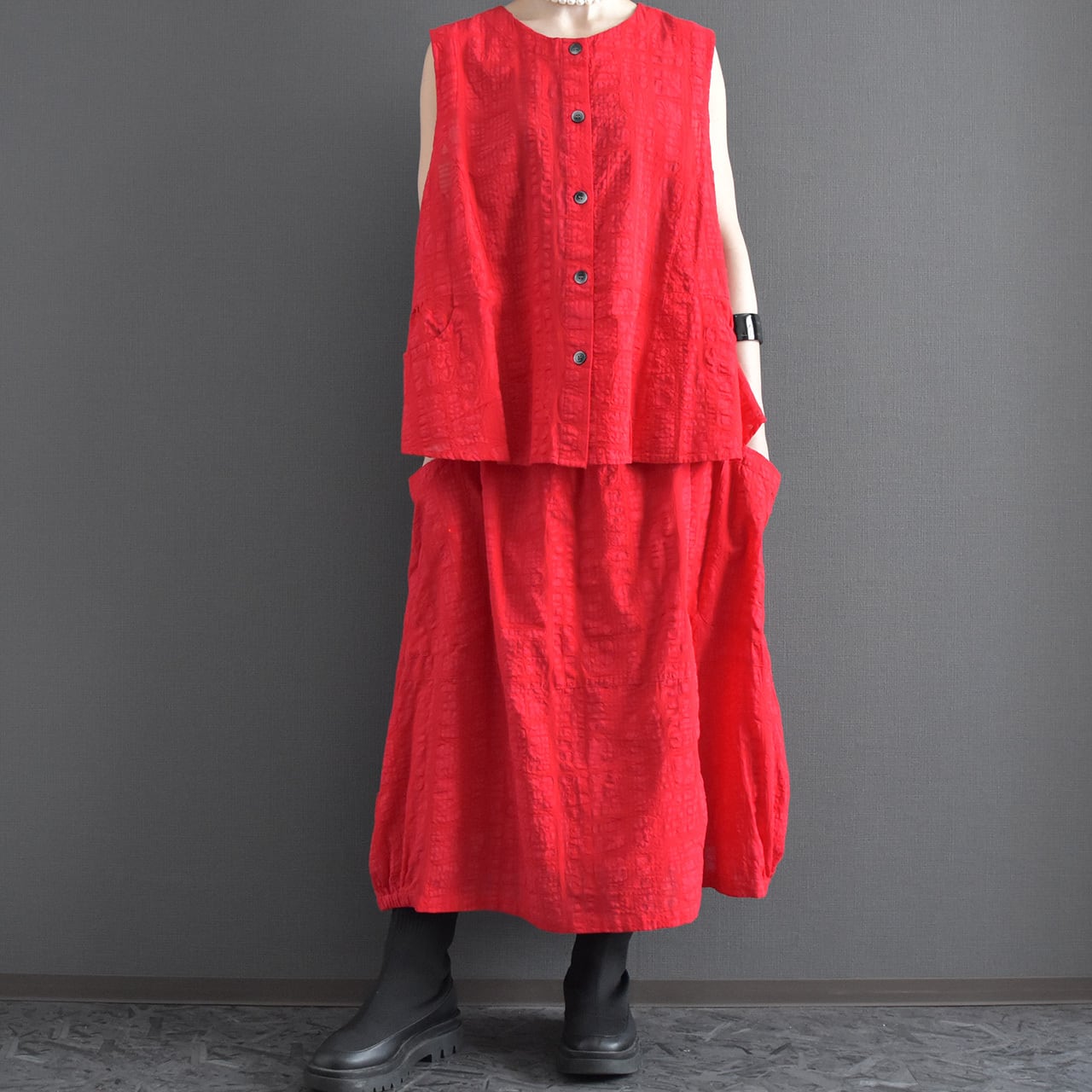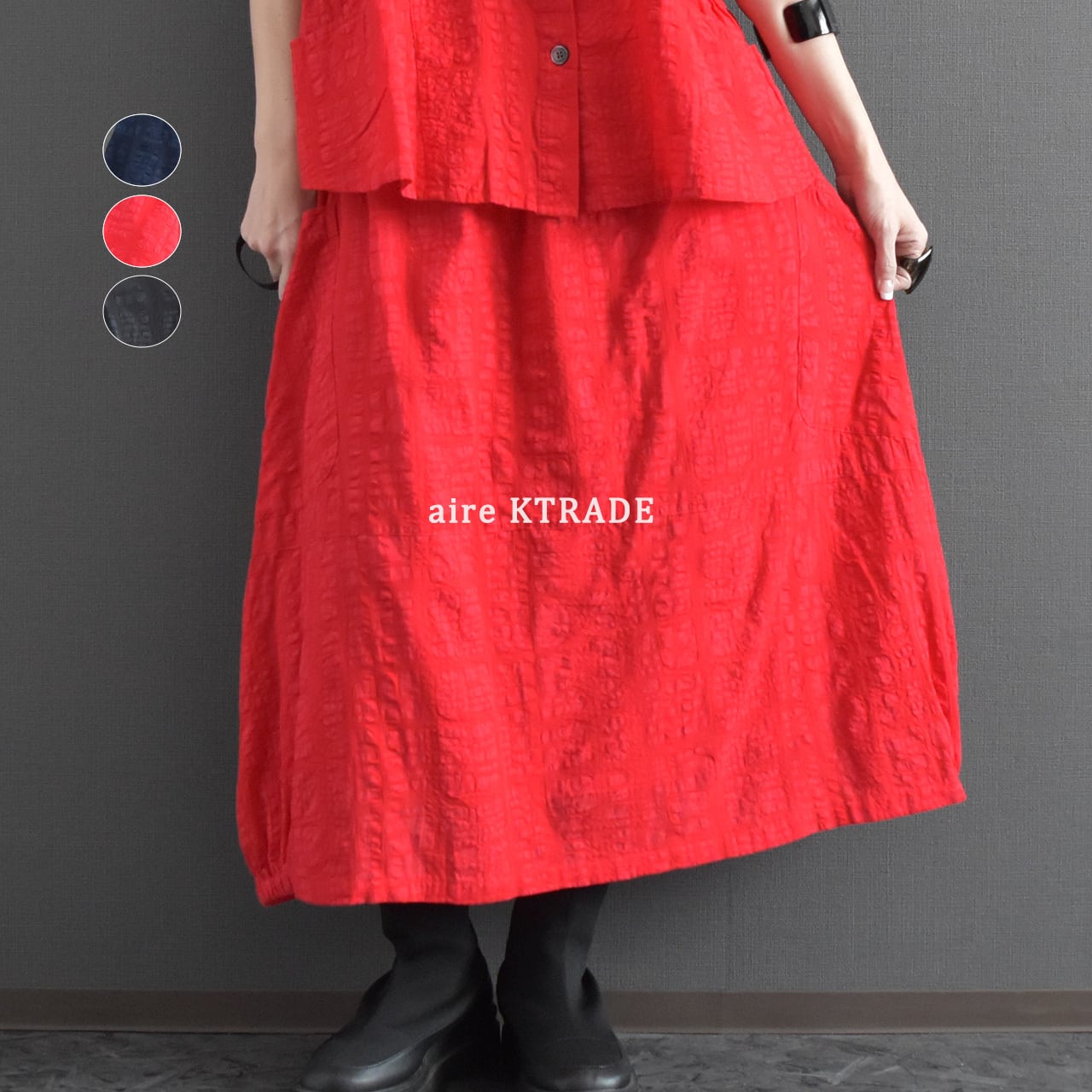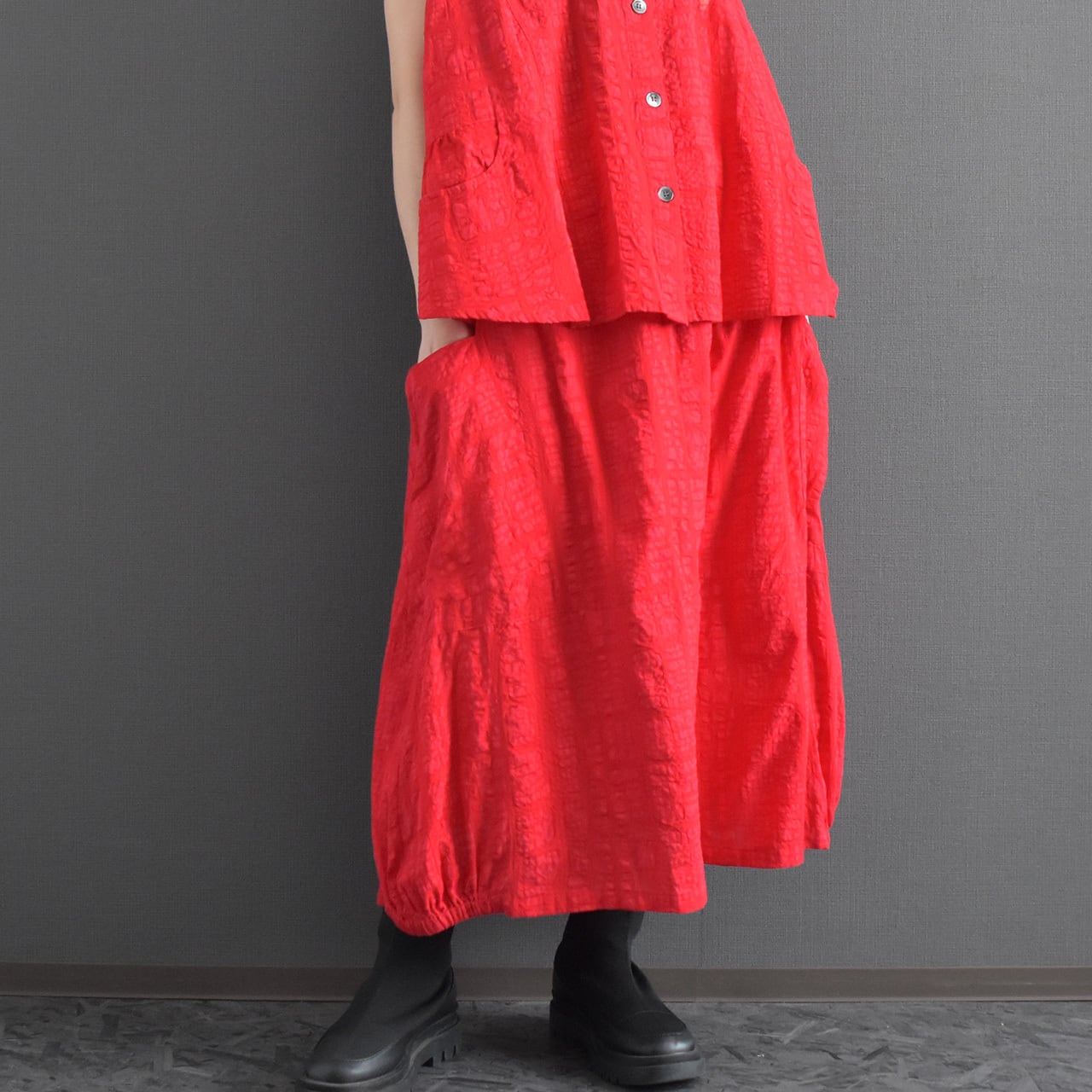 ブロックモチーフのエンボス加工を施した、表情のある綿生地を使用したスカートです。