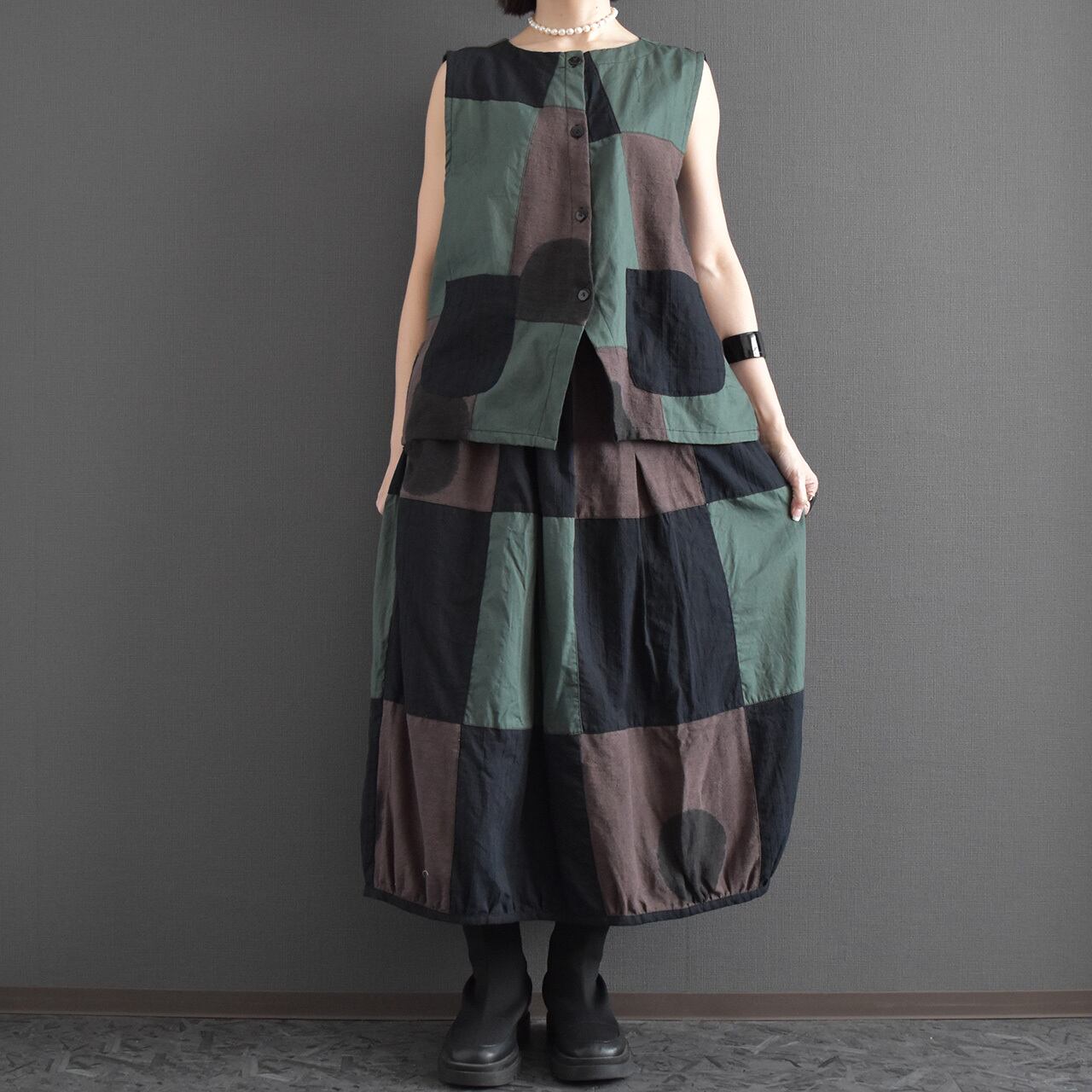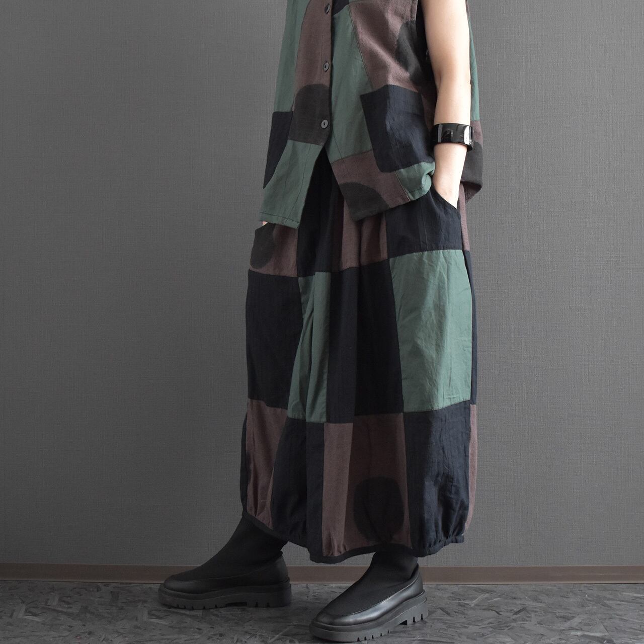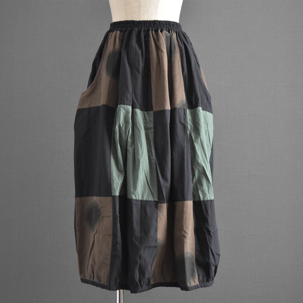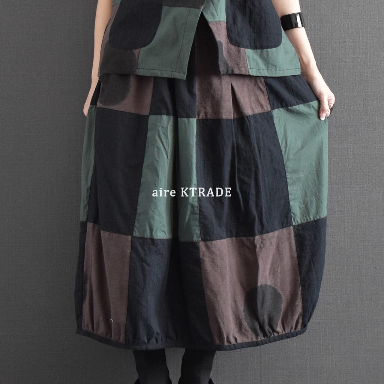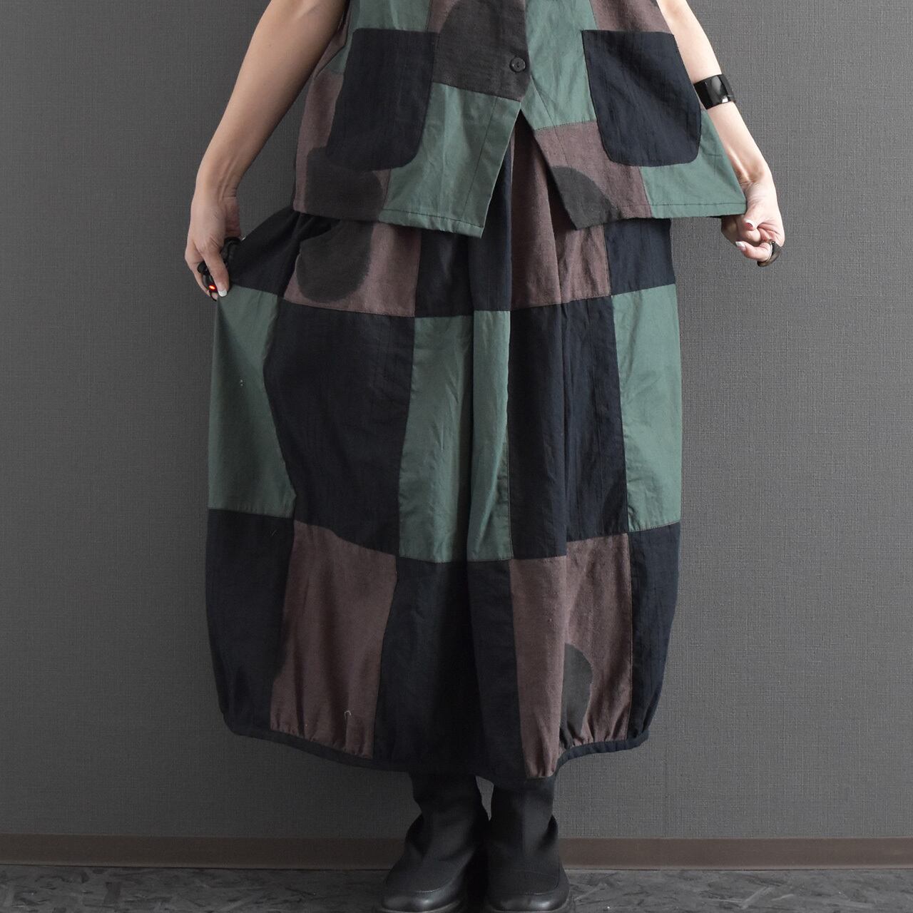 落ち着いた配色のクレイジーパッチワークが目を引く、存在感のあるバルーンスカート。