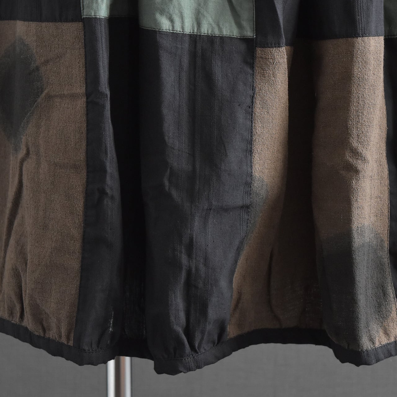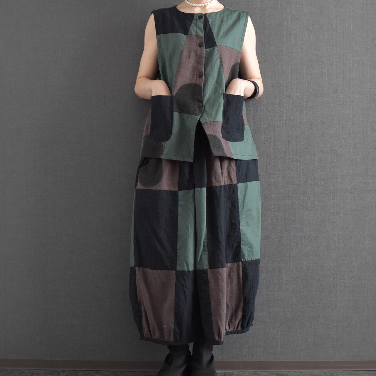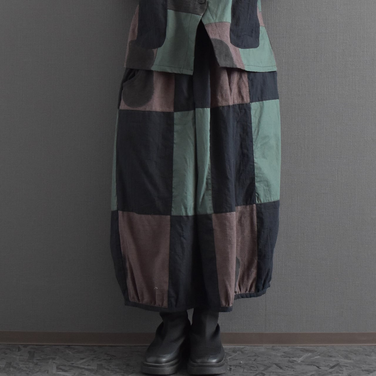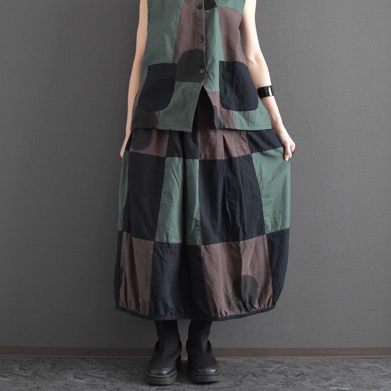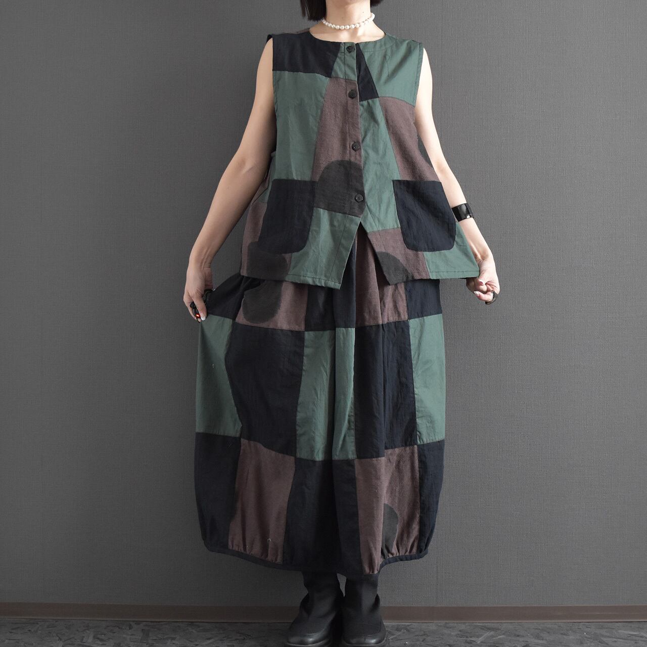 落ち着いた配色のクレイジーパッチワークが目を引く、存在感のあるバルーンスカート。