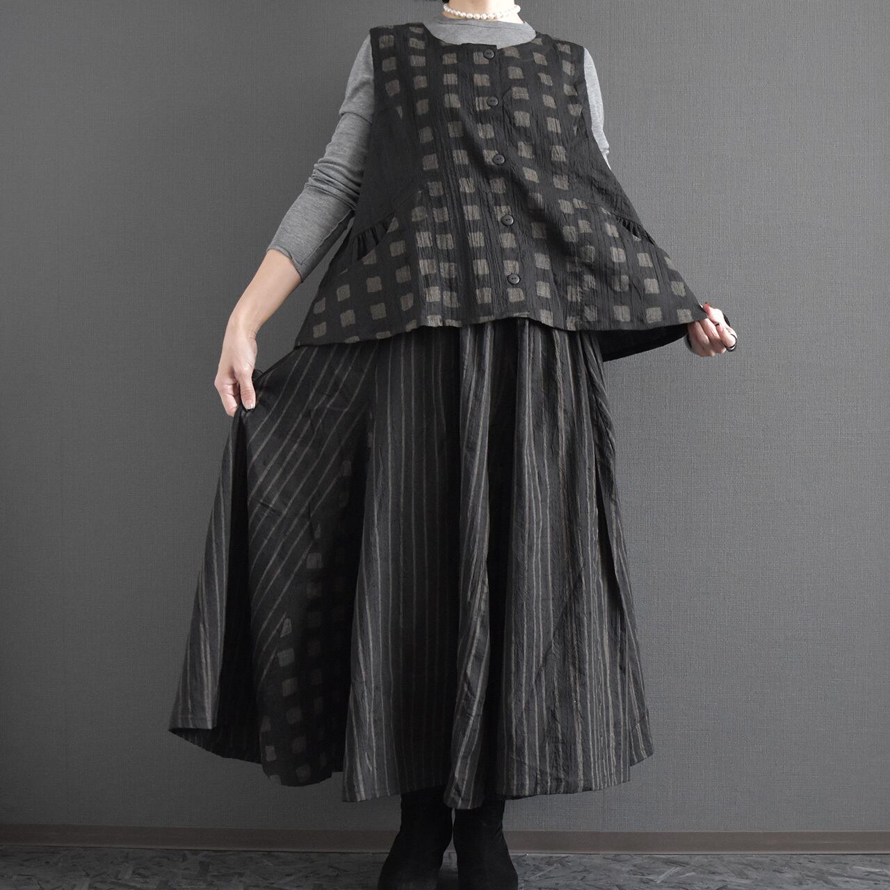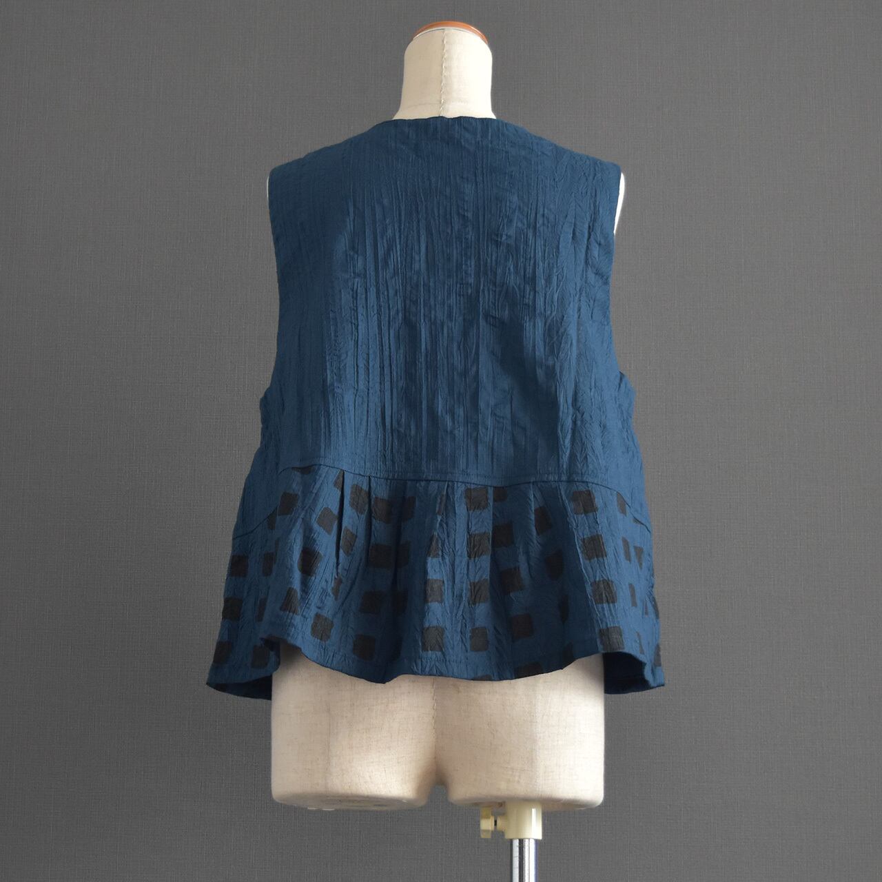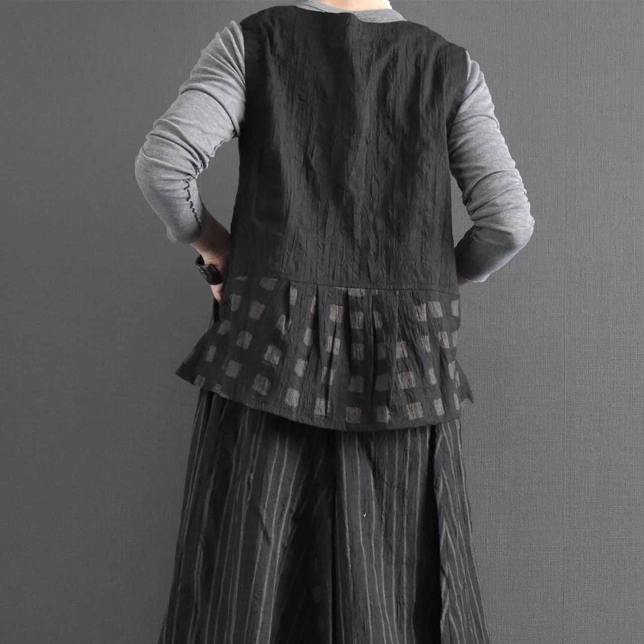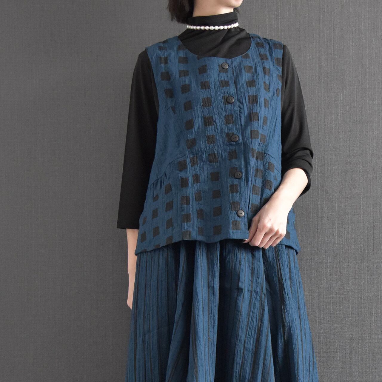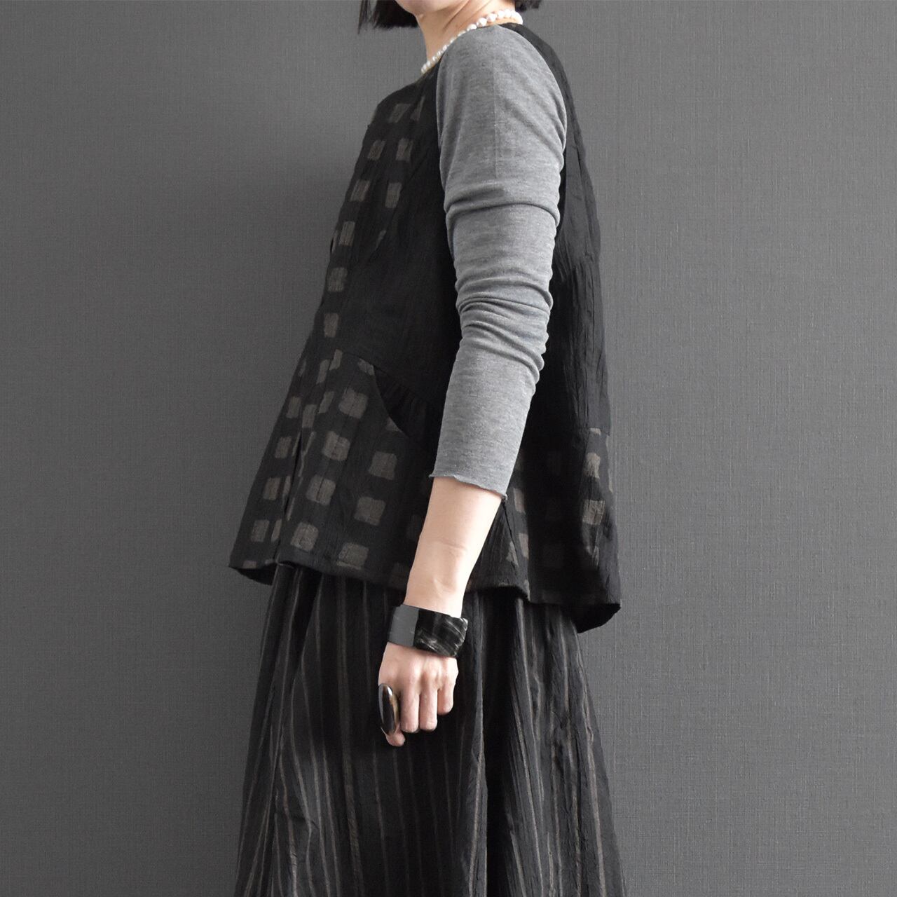 落ち着いた色合いに、さりげないスクエア柄が映える前開きベスト。