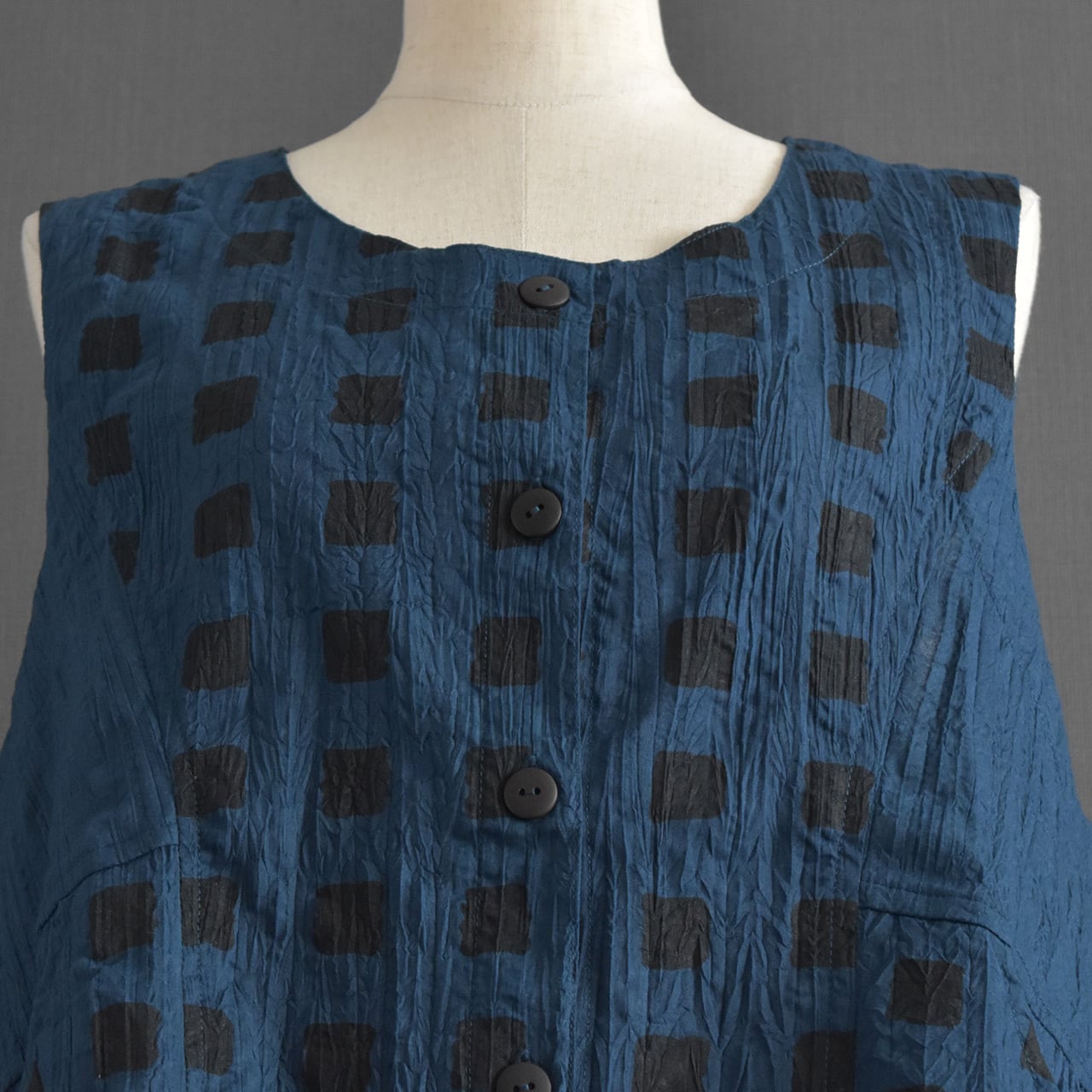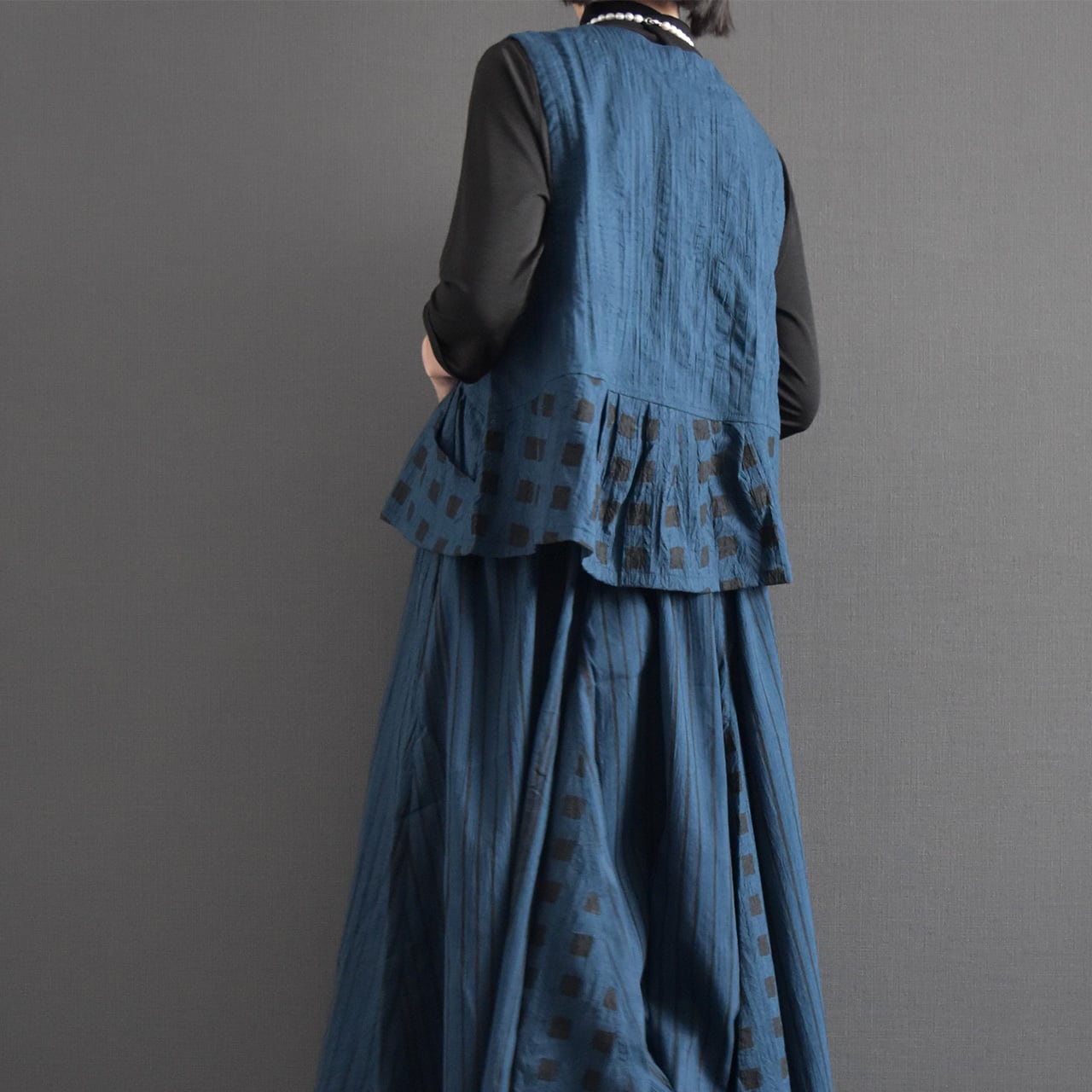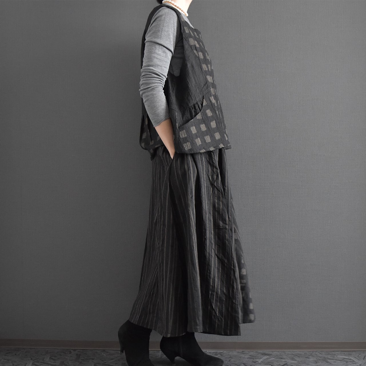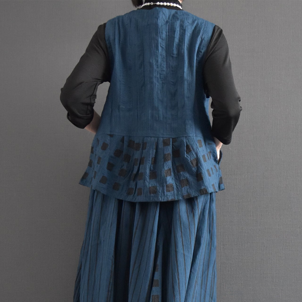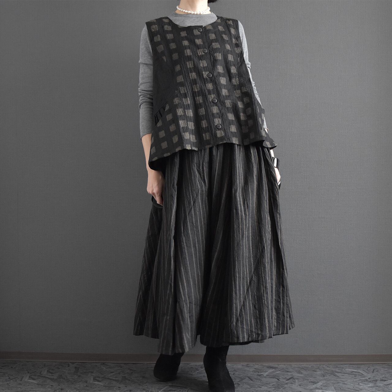 落ち着いた色合いに、さりげないスクエア柄が映える前開きベスト。