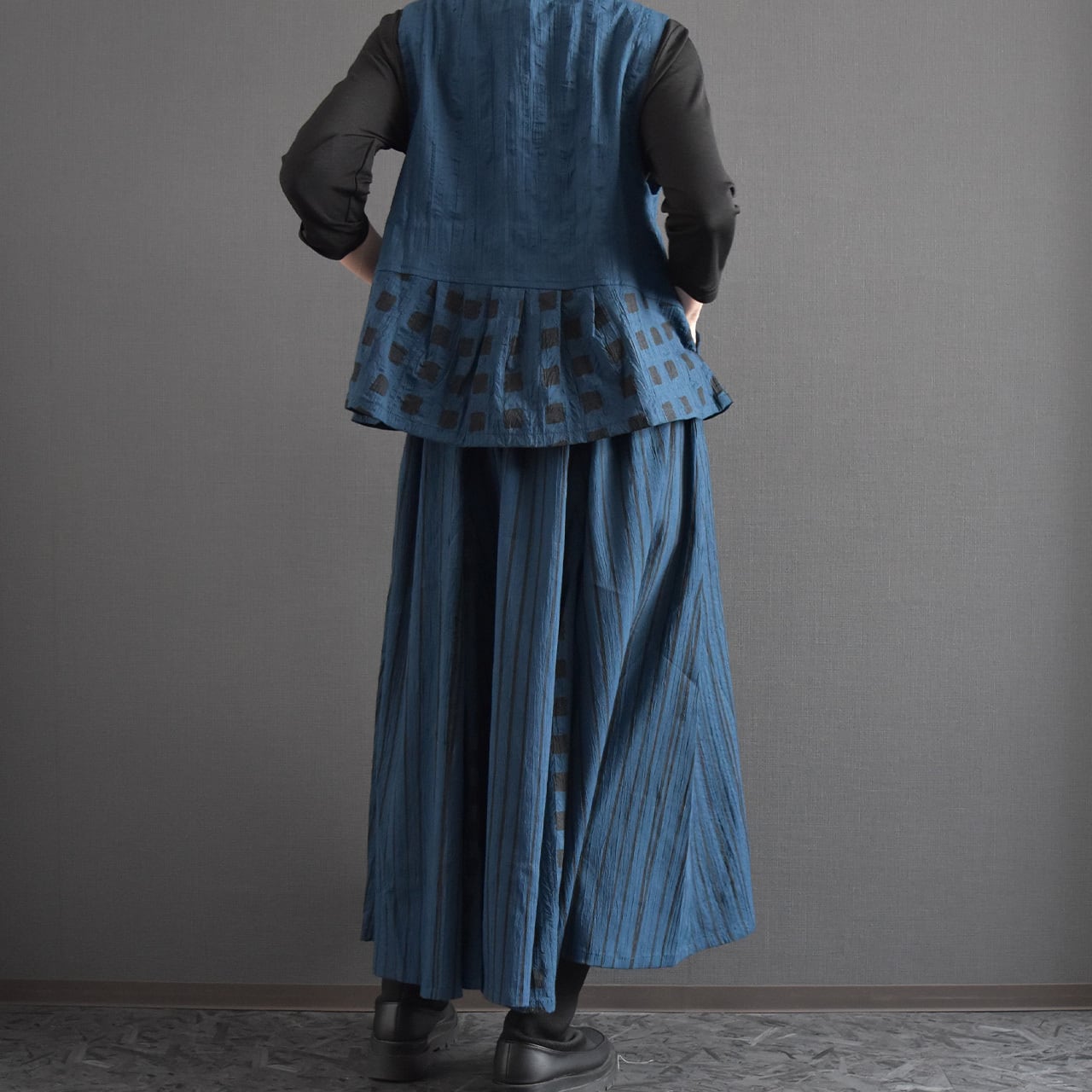 裾に向かって広がるデザインが動きを生み、パンツにもスカートにも好相性。