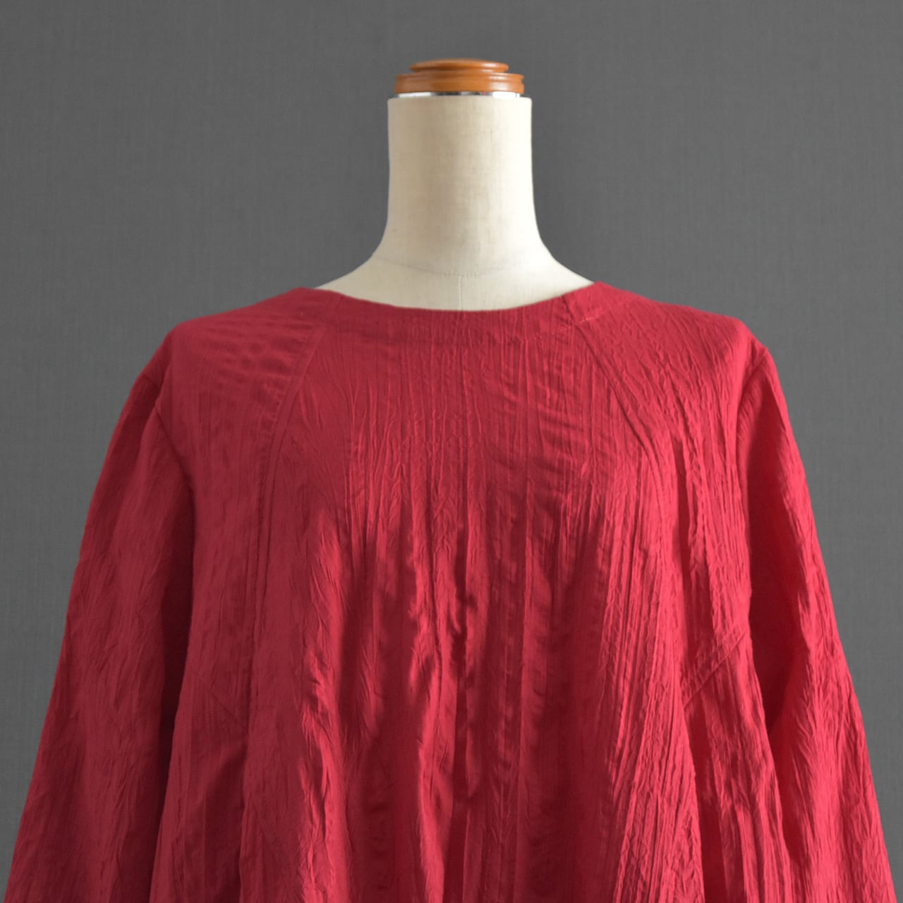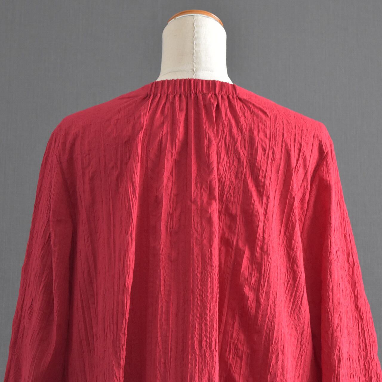 表情のあるワッシャー加工を施した生地は、ナチュラルなシワ感が特徴。肌離れがよく、春夏シーズンも涼しく快適に着用いただけます。綿のやさしい風合いにポリエステルをブレンドすることで、軽さと扱いやすさを兼ね備えました。