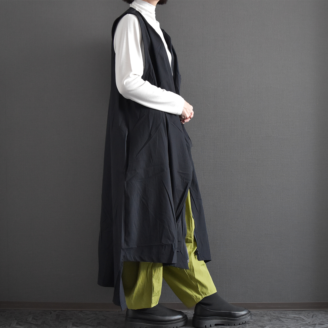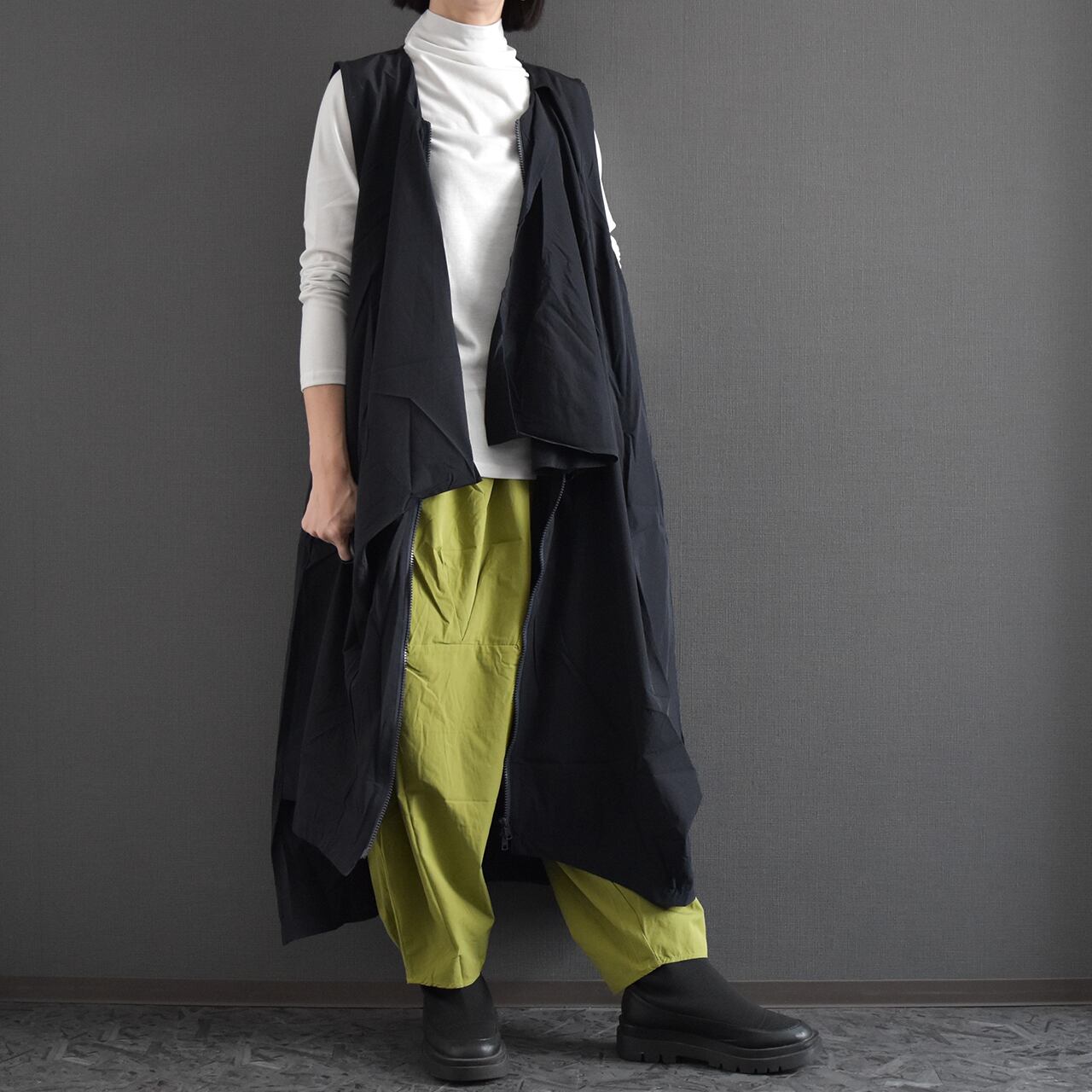 フロントに施した立体的なタックが、体のラインを拾わず自然にカバーしながら、動きのある上品な印象を演出します。