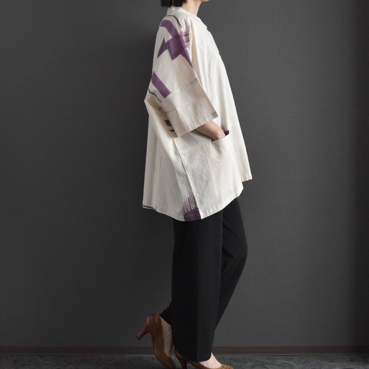 前開きボタン仕様で、ブラウスとしても羽織りとしても着用できます。