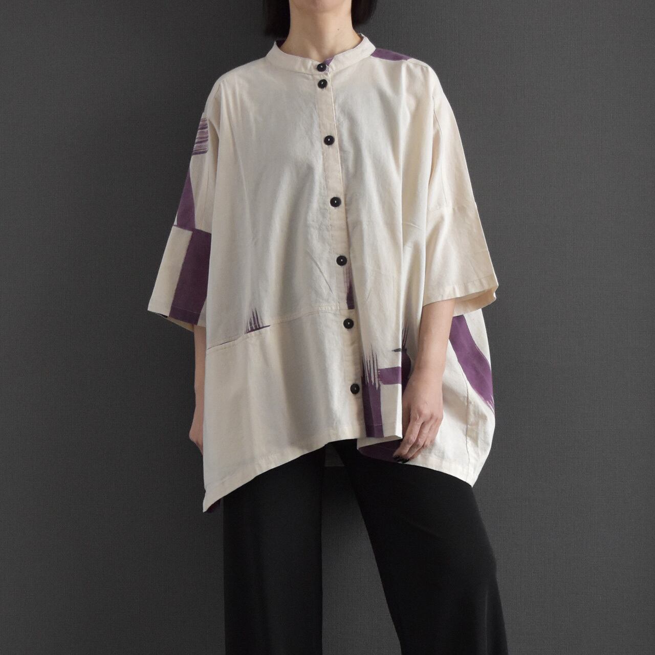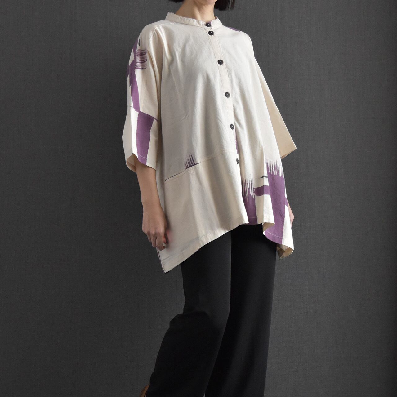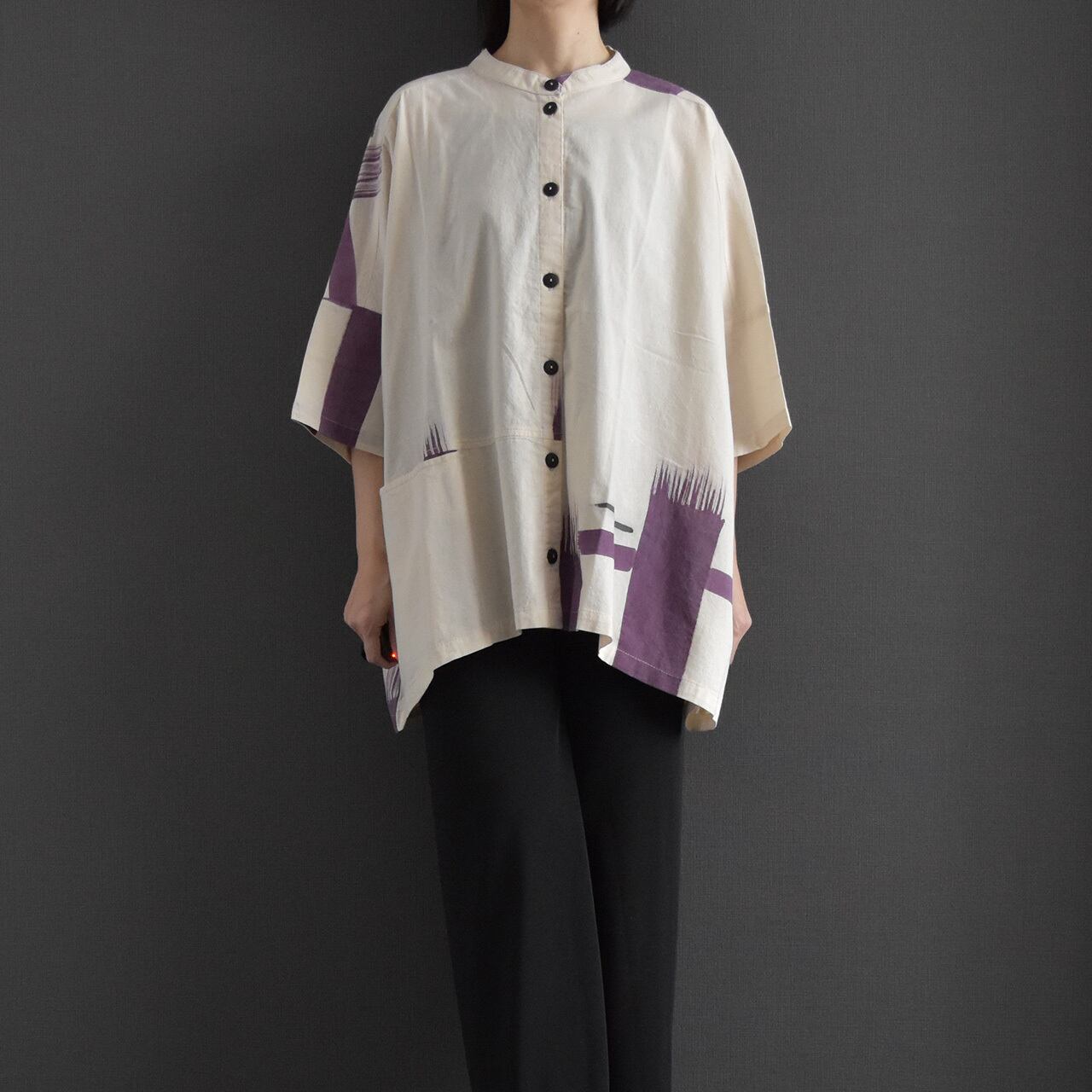 やわらかなタイコットンを使用した、手描き柄のバンドカラーブラウス。