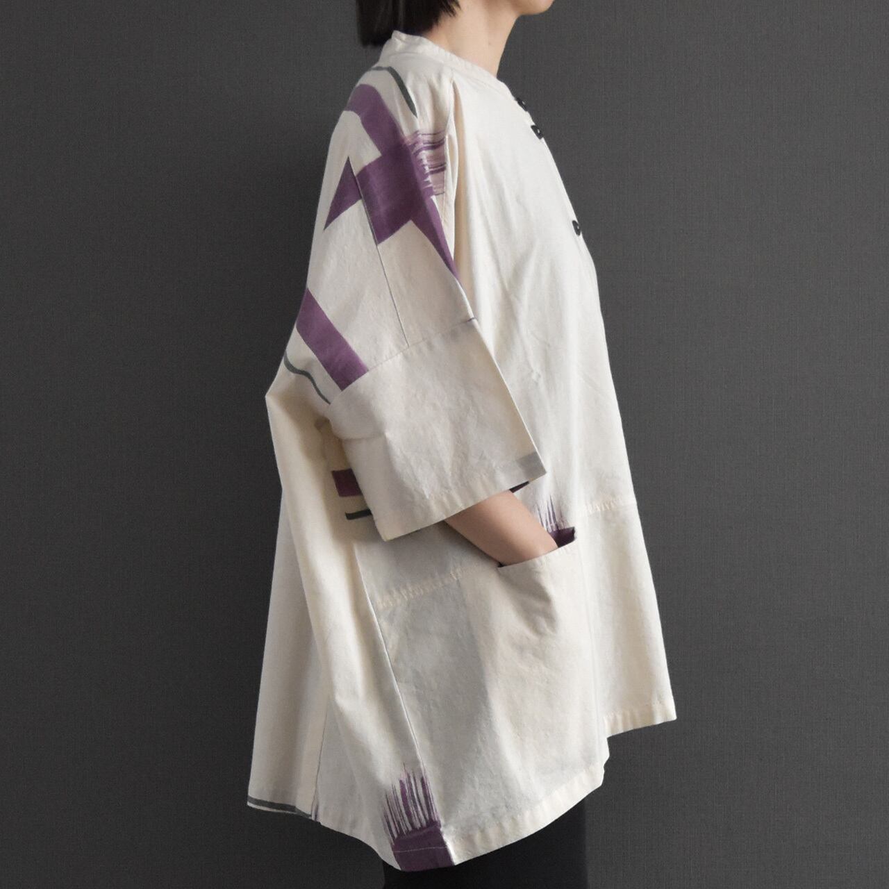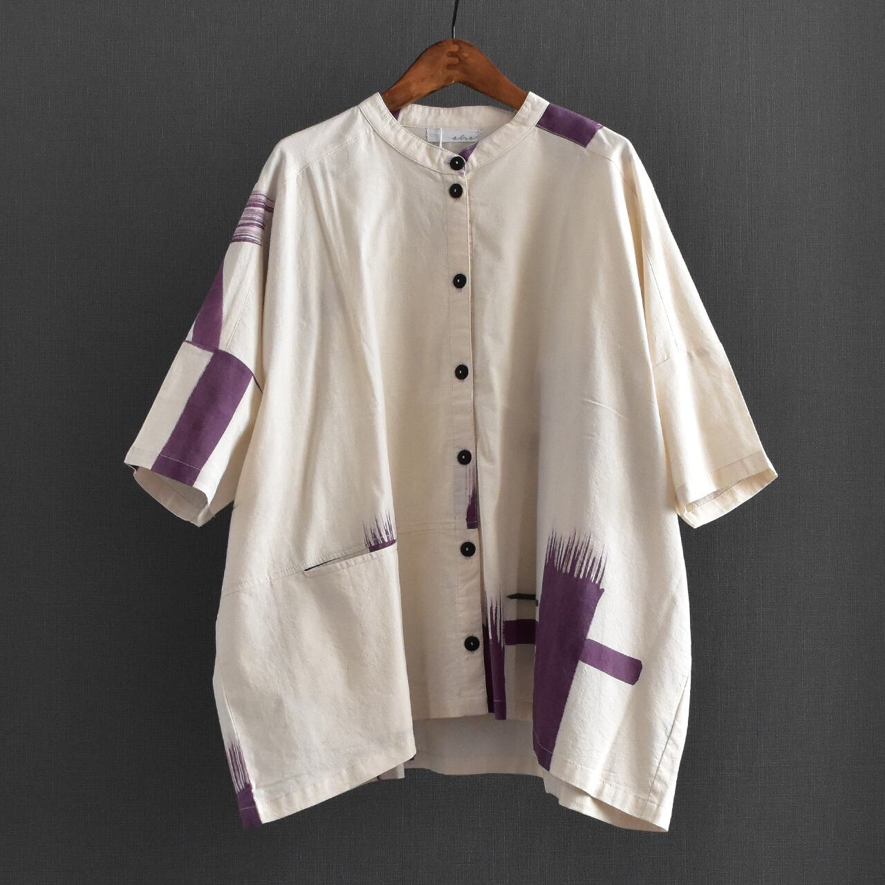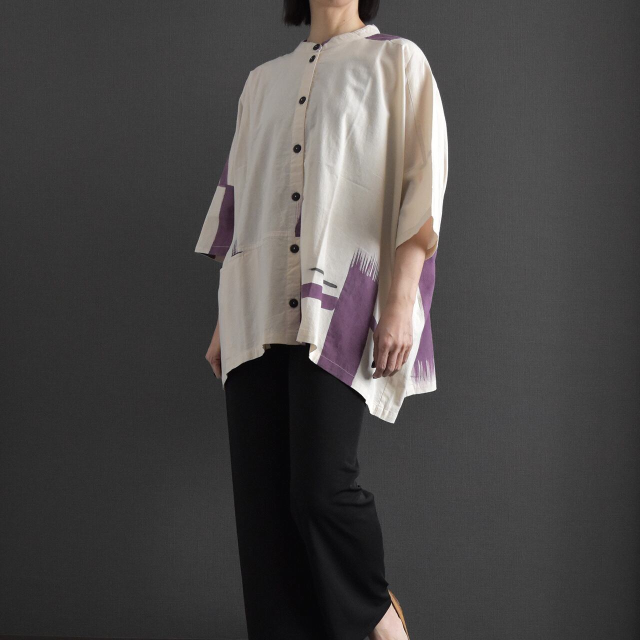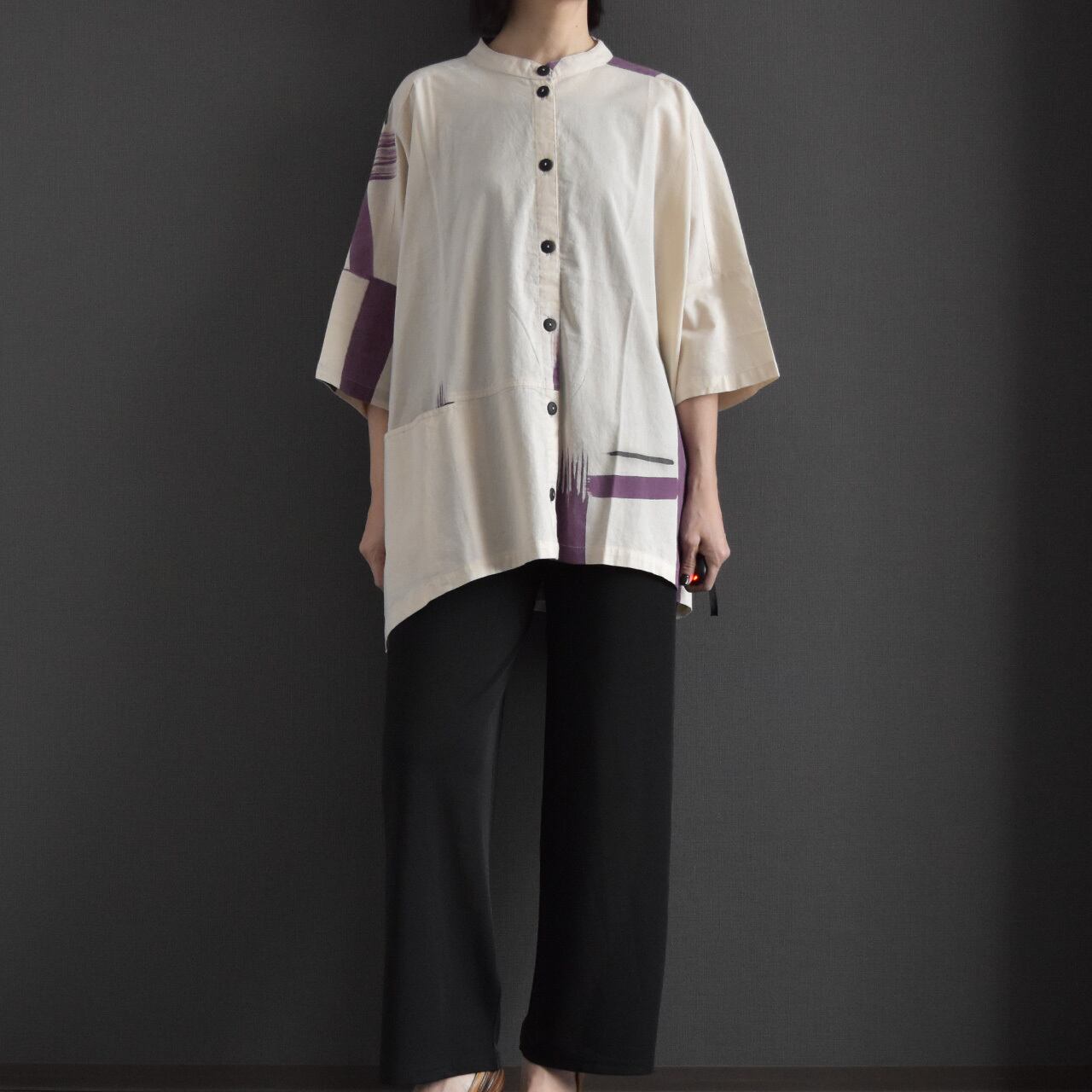 やわらかなタイコットンを使用した、手描き柄のバンドカラーブラウス。