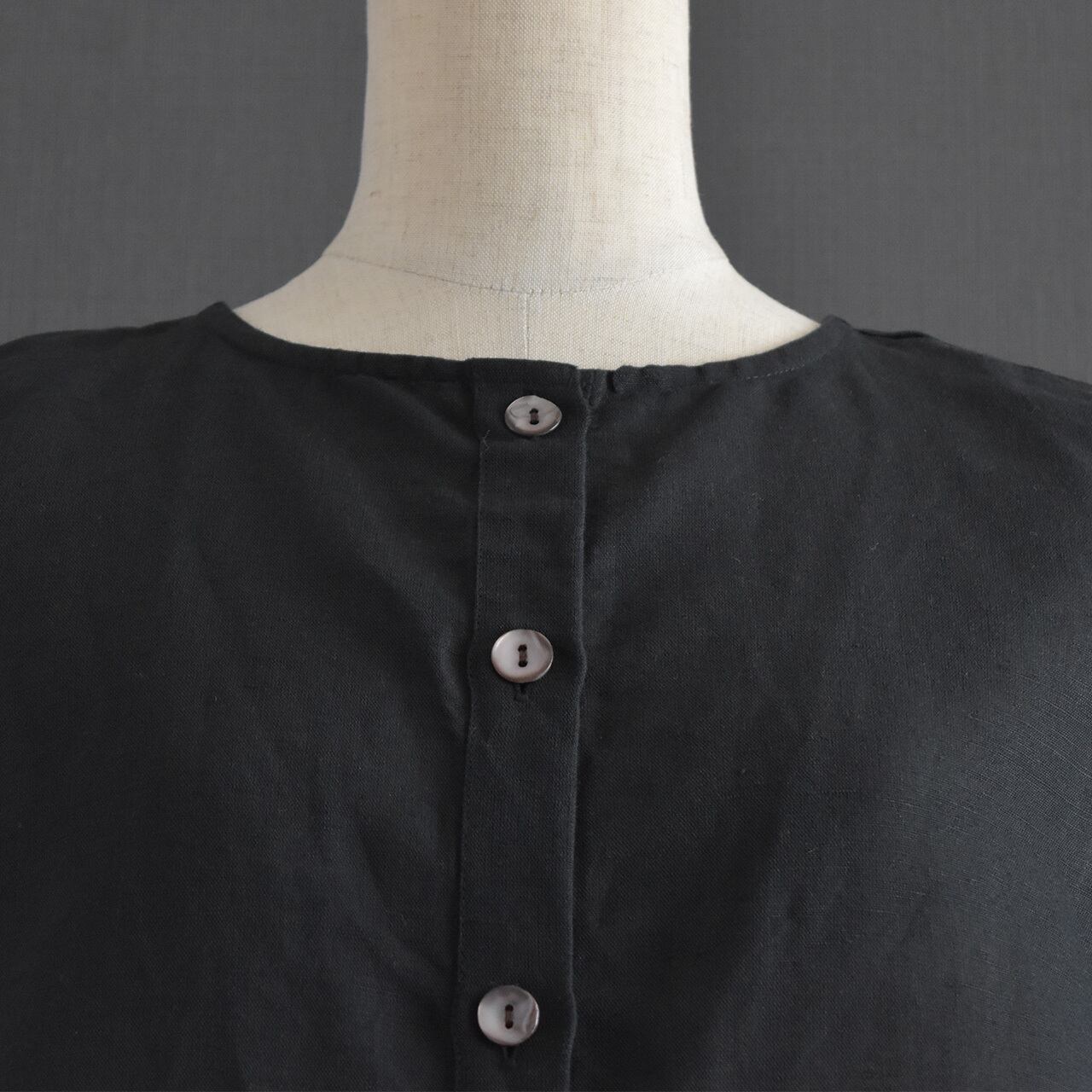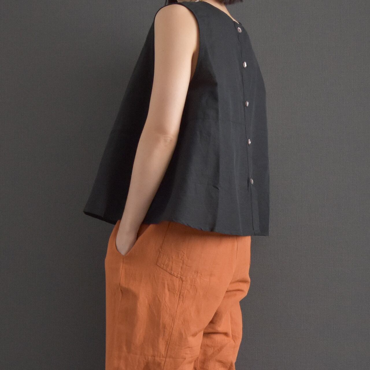 前後どちらでも着用できるデザインで、ボタンを前にしてベストとして、後ろにしてシンプルなプルオーバー風にも着こなせます。