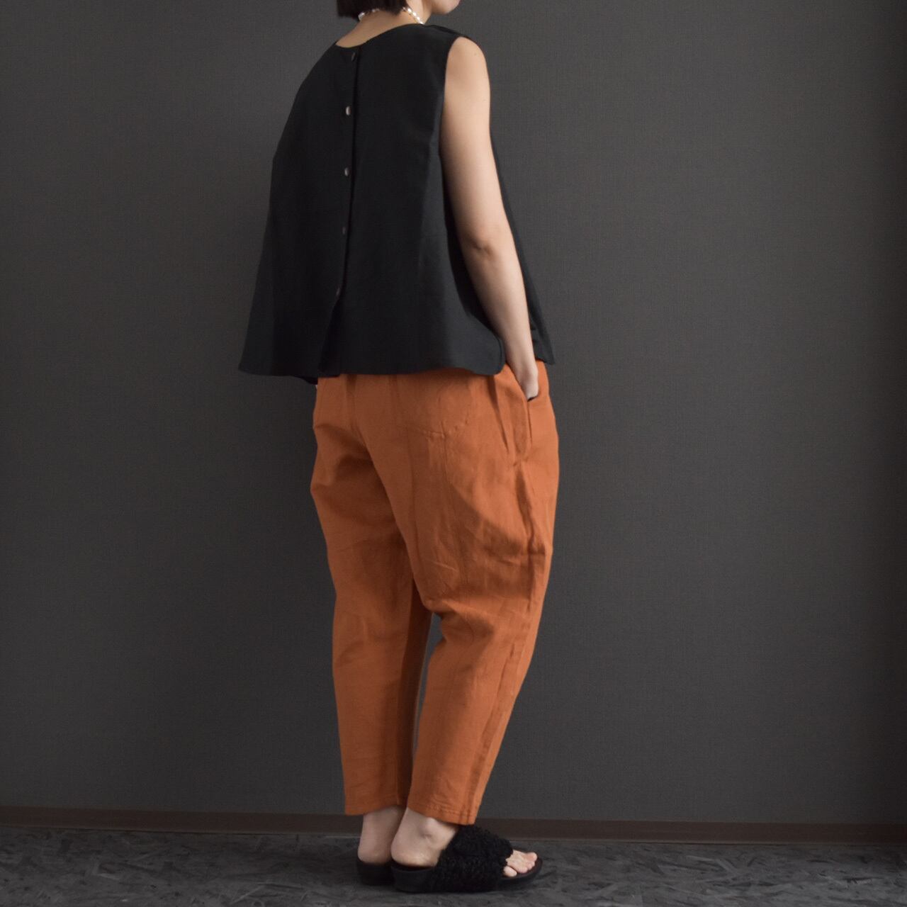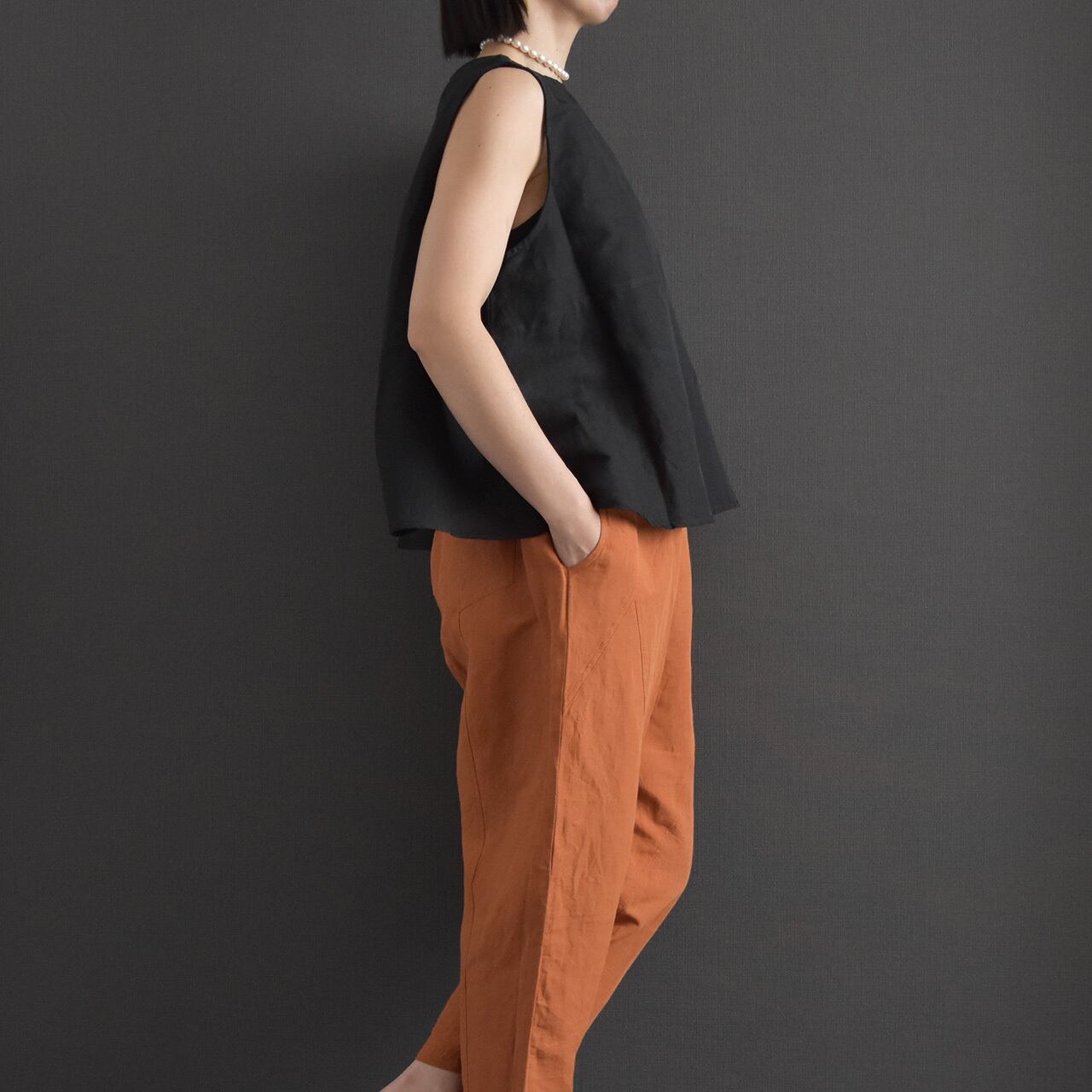 裏地:なし/ポケット:なし/生地:中厚布帛/透け感:若干あり/伸縮性:なし
