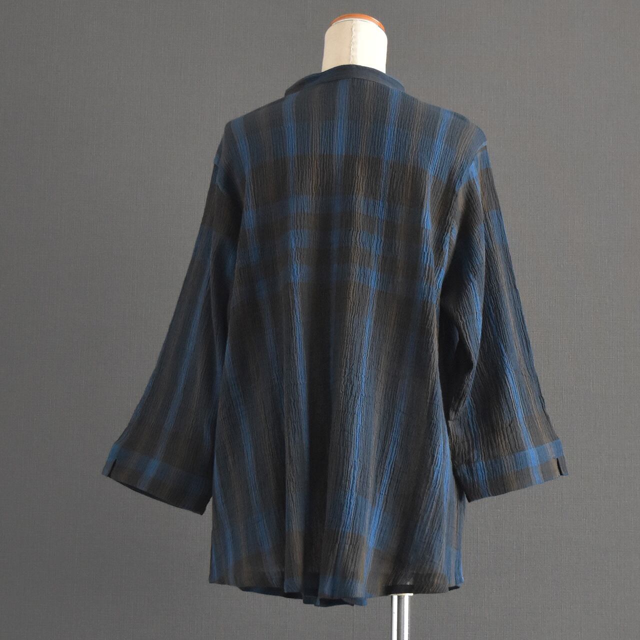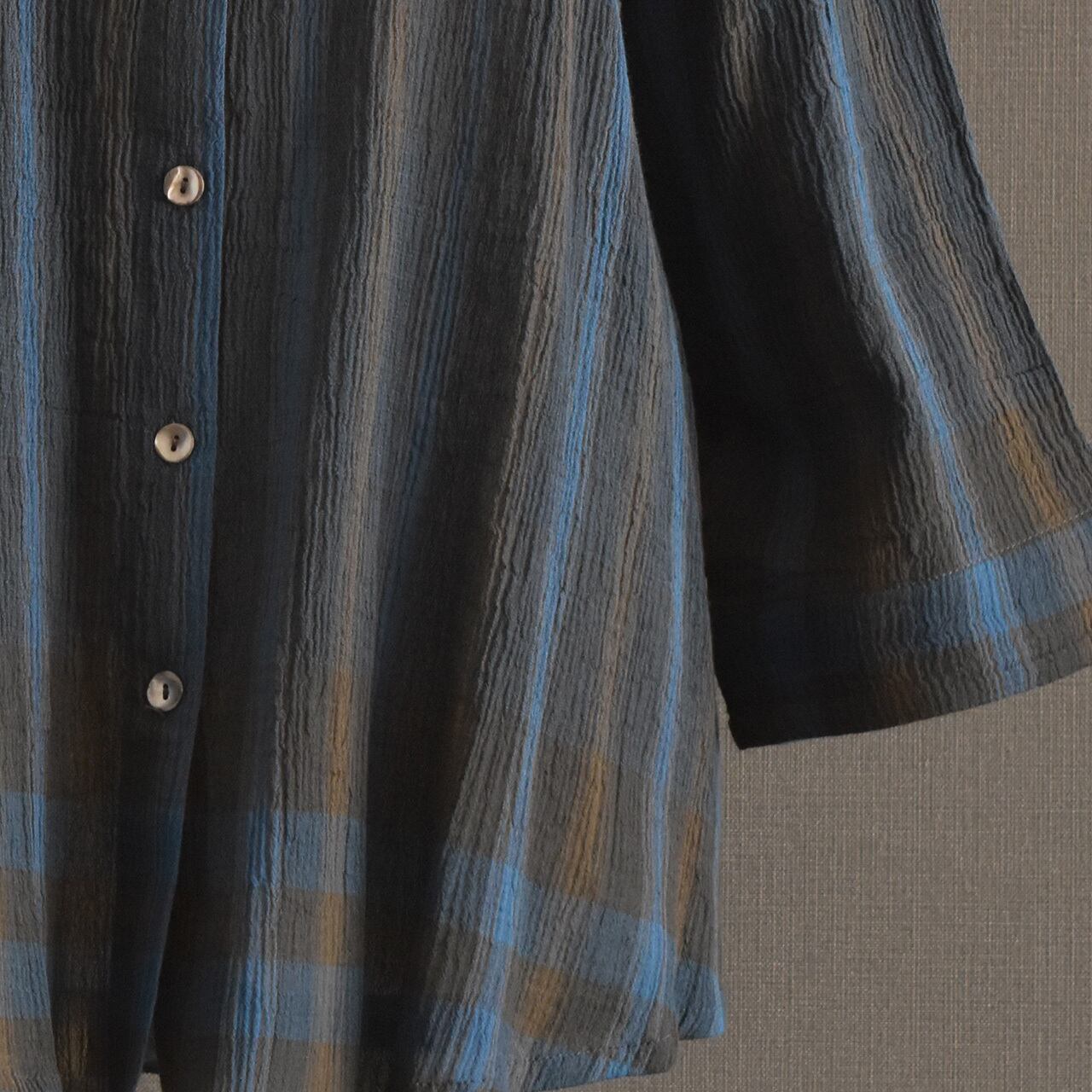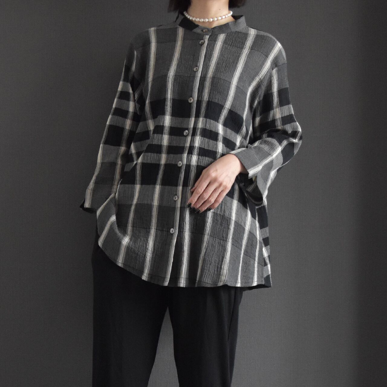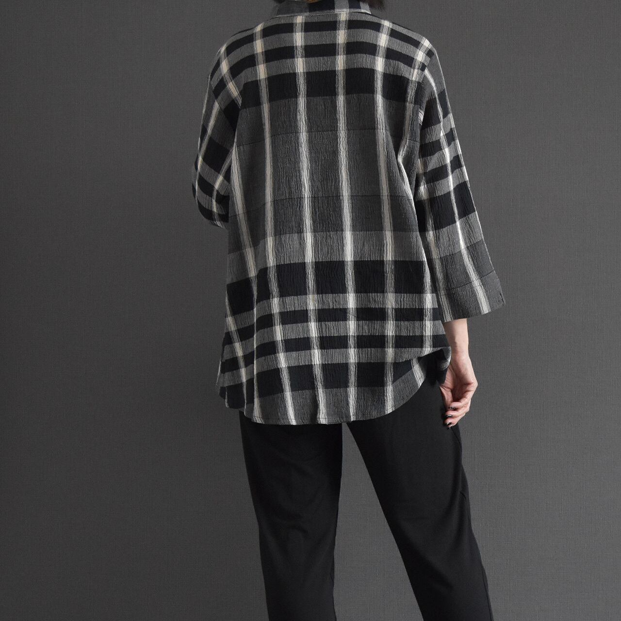 表情のあるコットンクレープ素材に、ニュアンスチェック柄をのせた前開きブラウス。