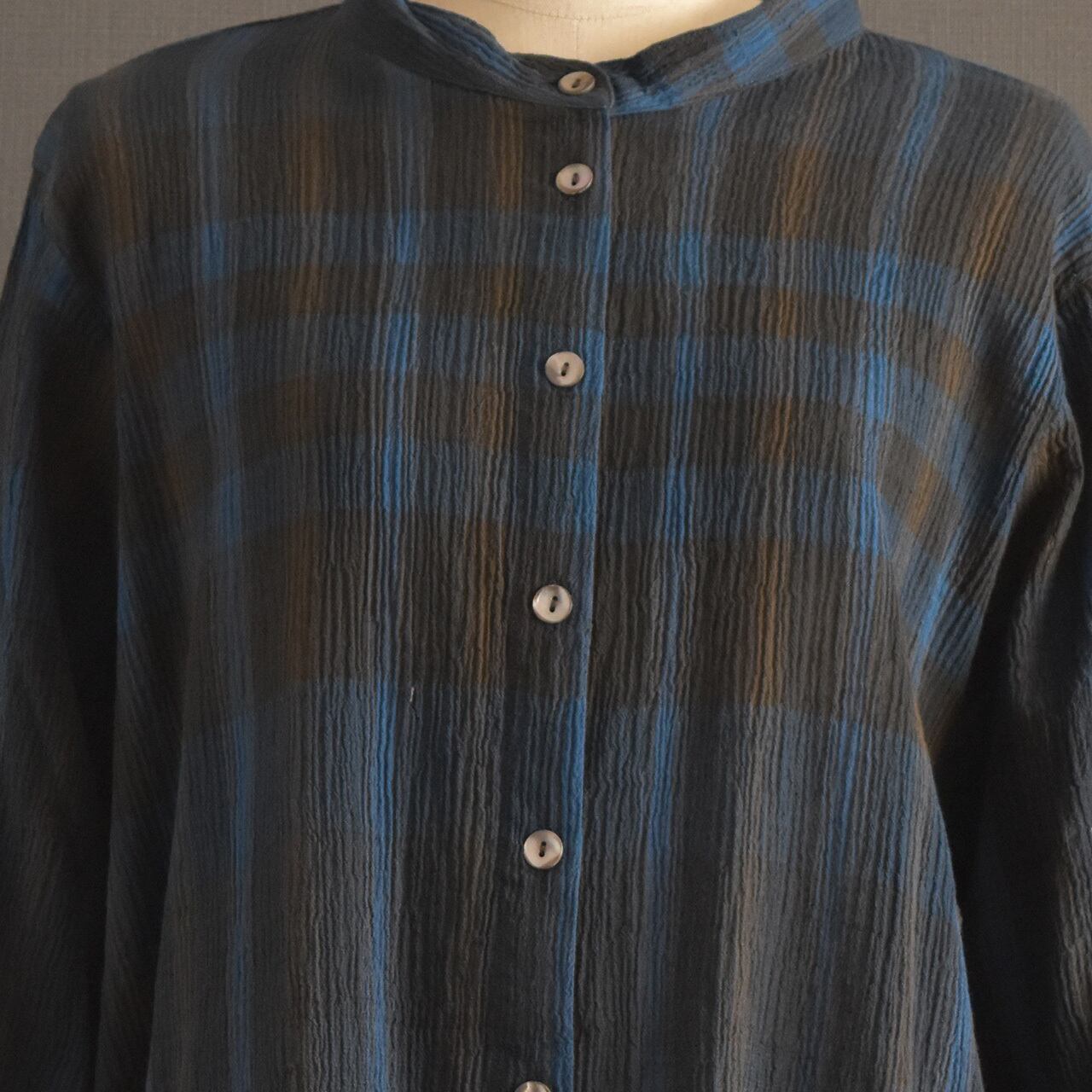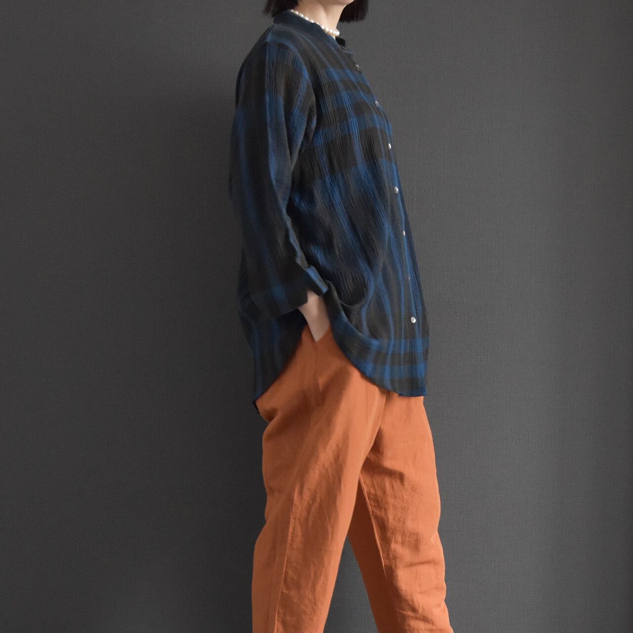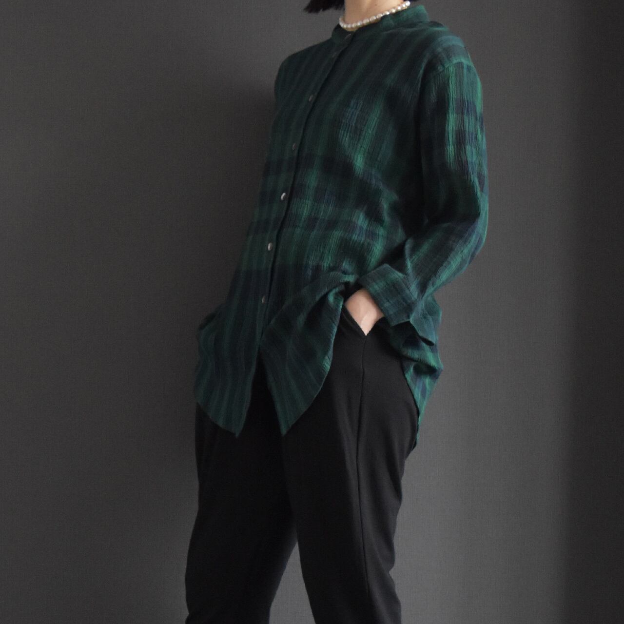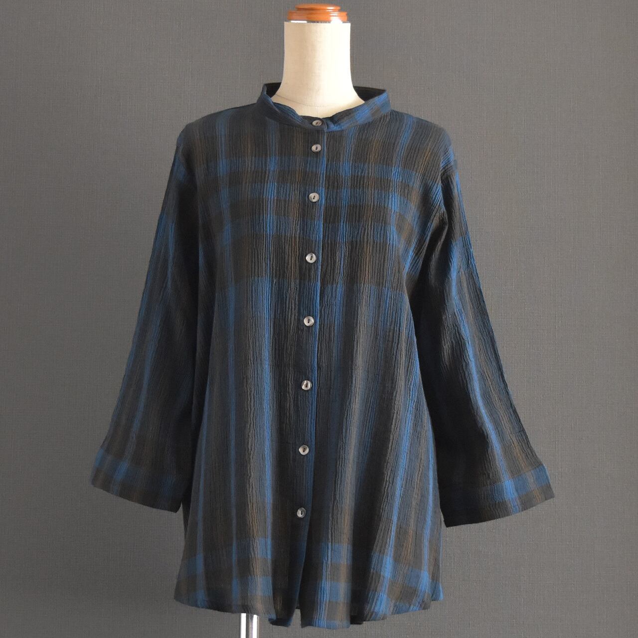 表情のあるコットンクレープ素材に、ニュアンスチェック柄をのせた前開きブラウス。
