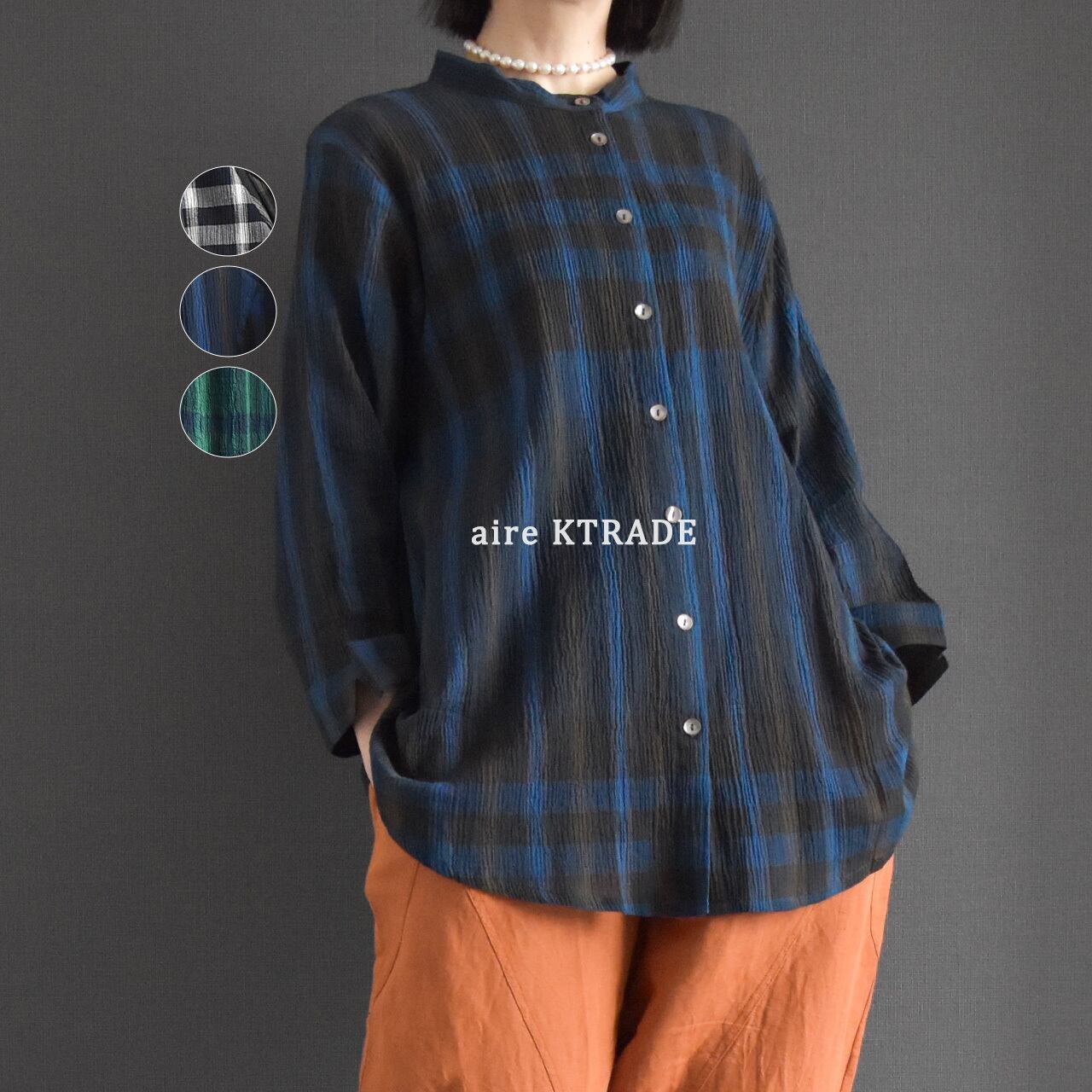 コットンクレープ チェック柄前開きブラウス 2026夏