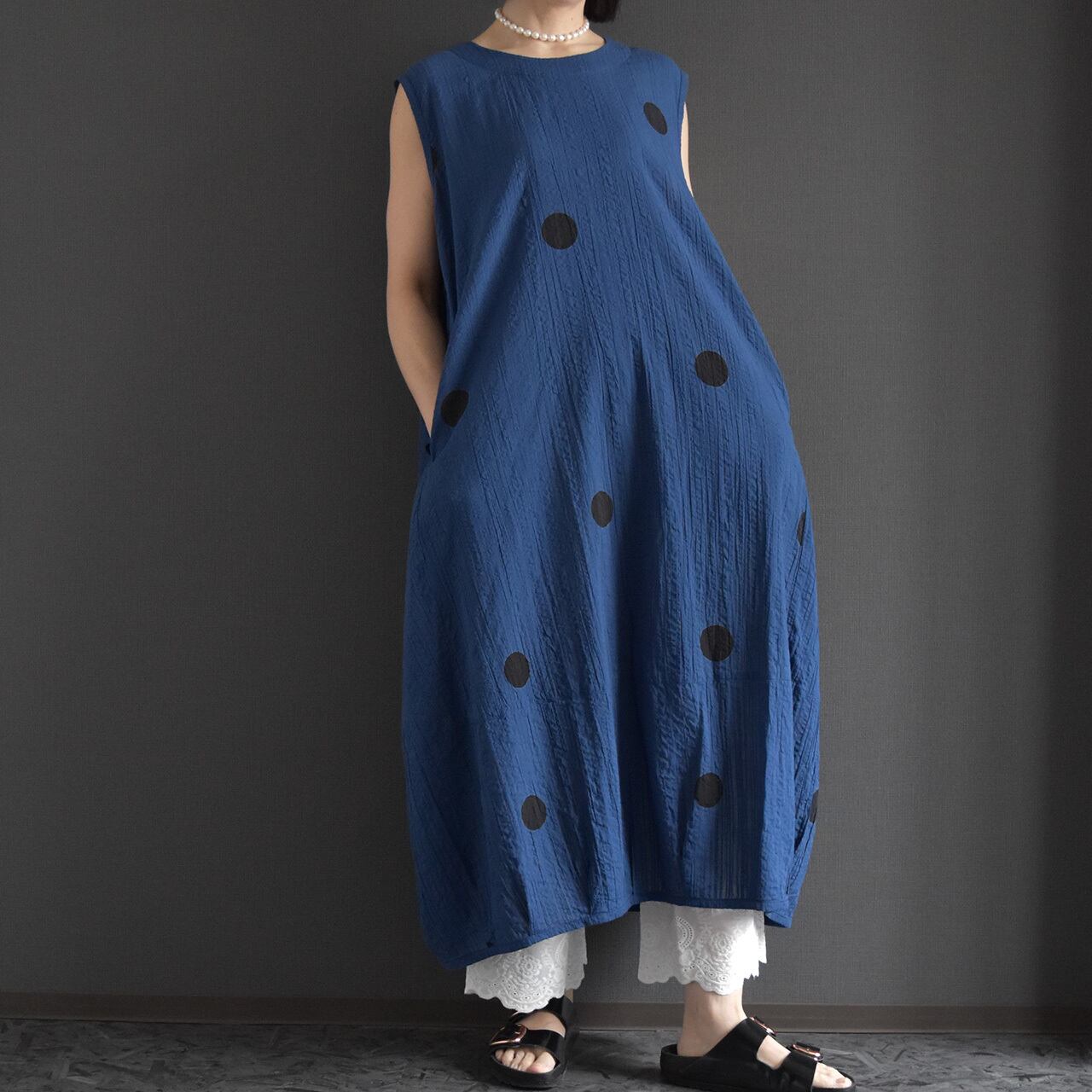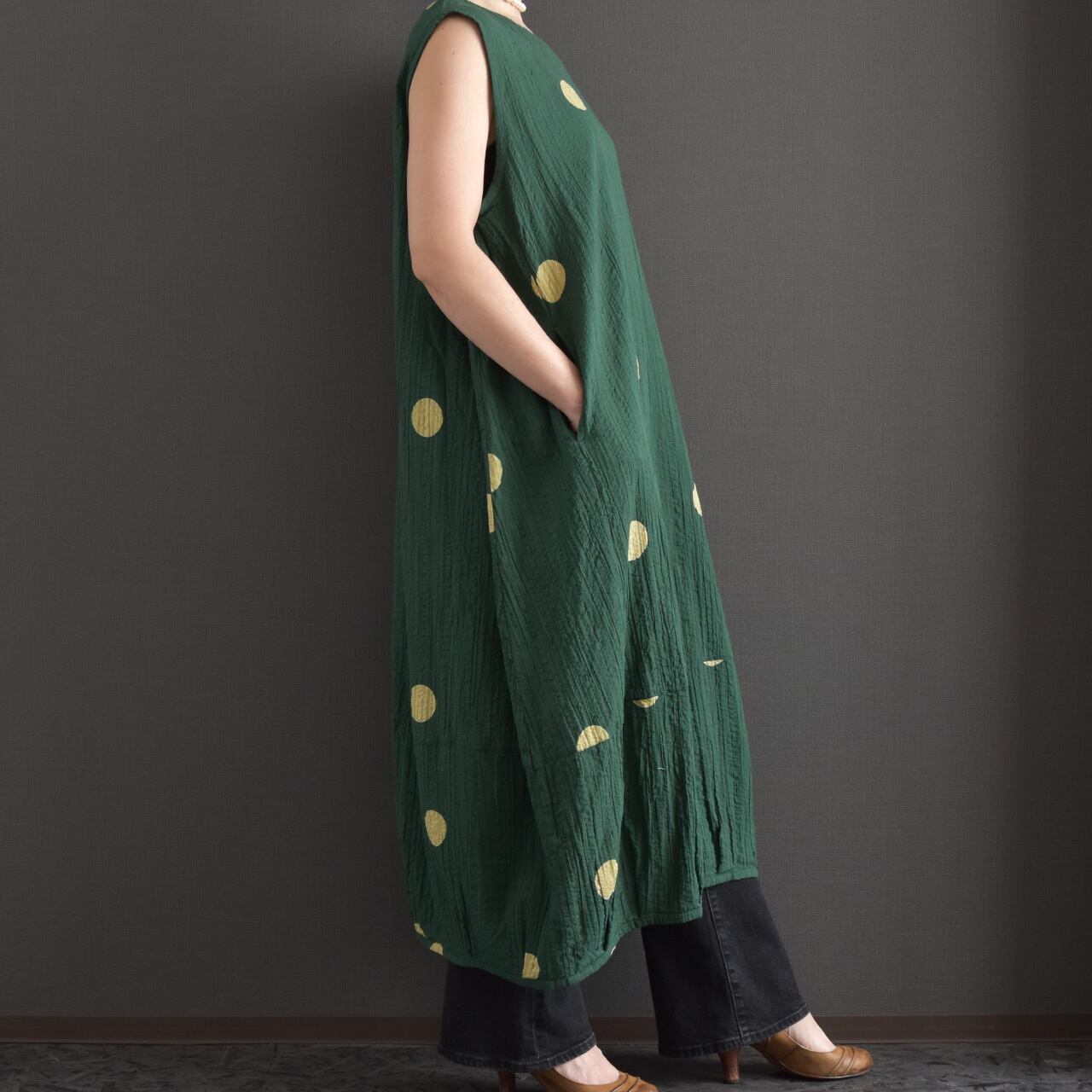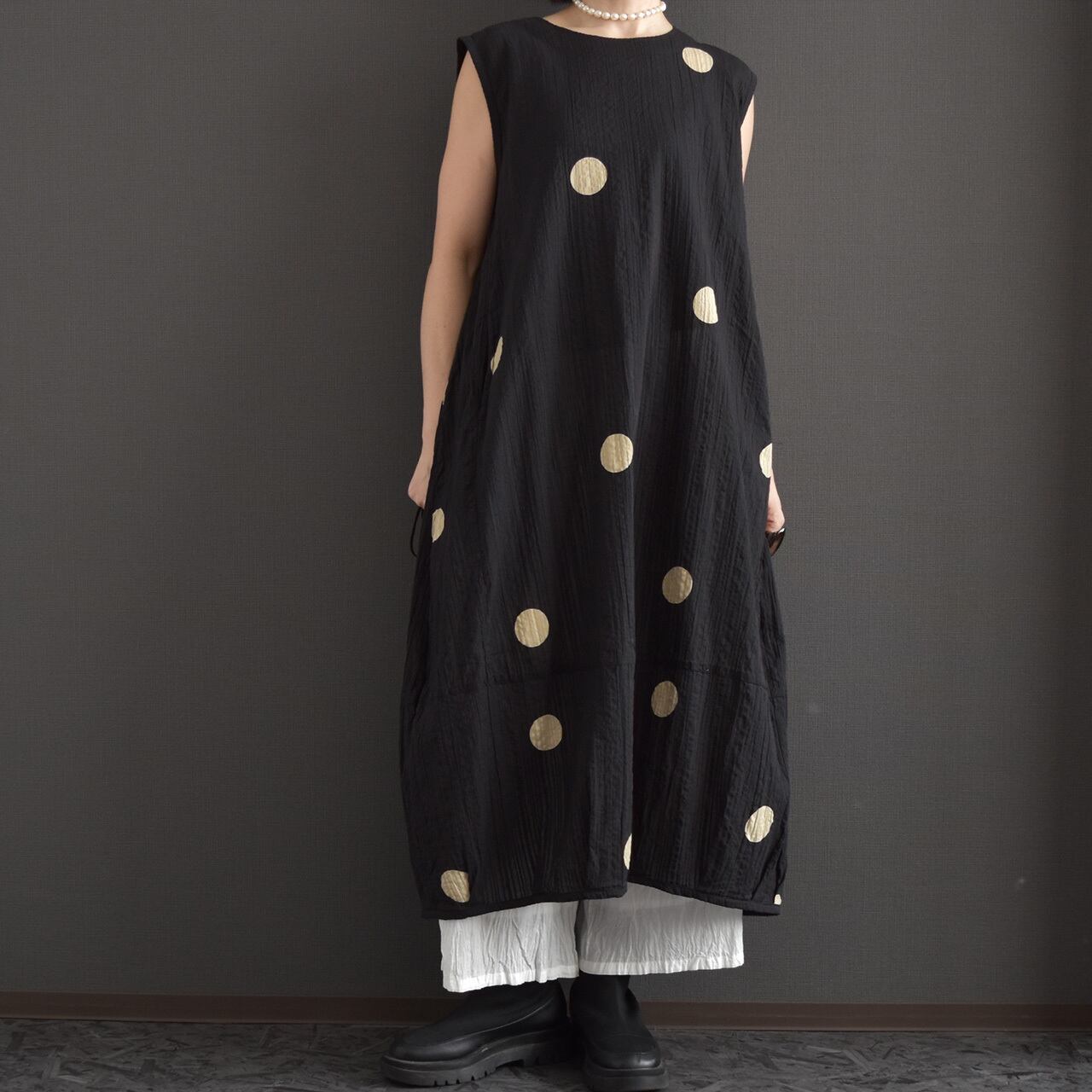 ゆったりとしたシルエットとドット柄が、シンプルながらも存在感のある一枚です。