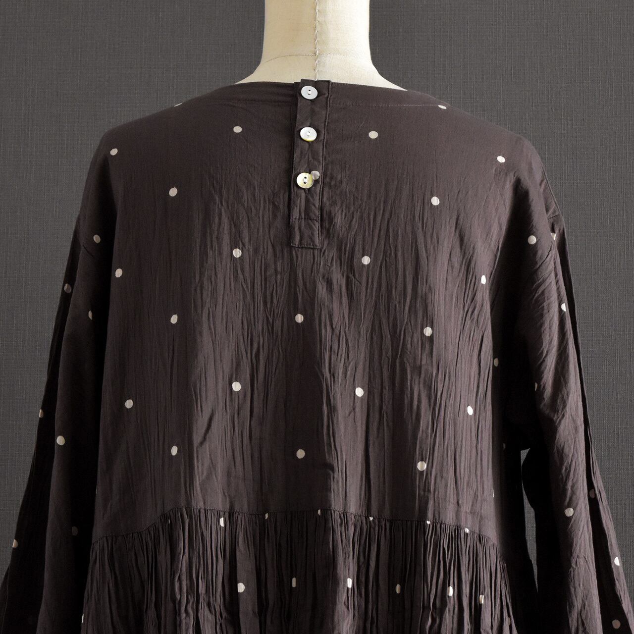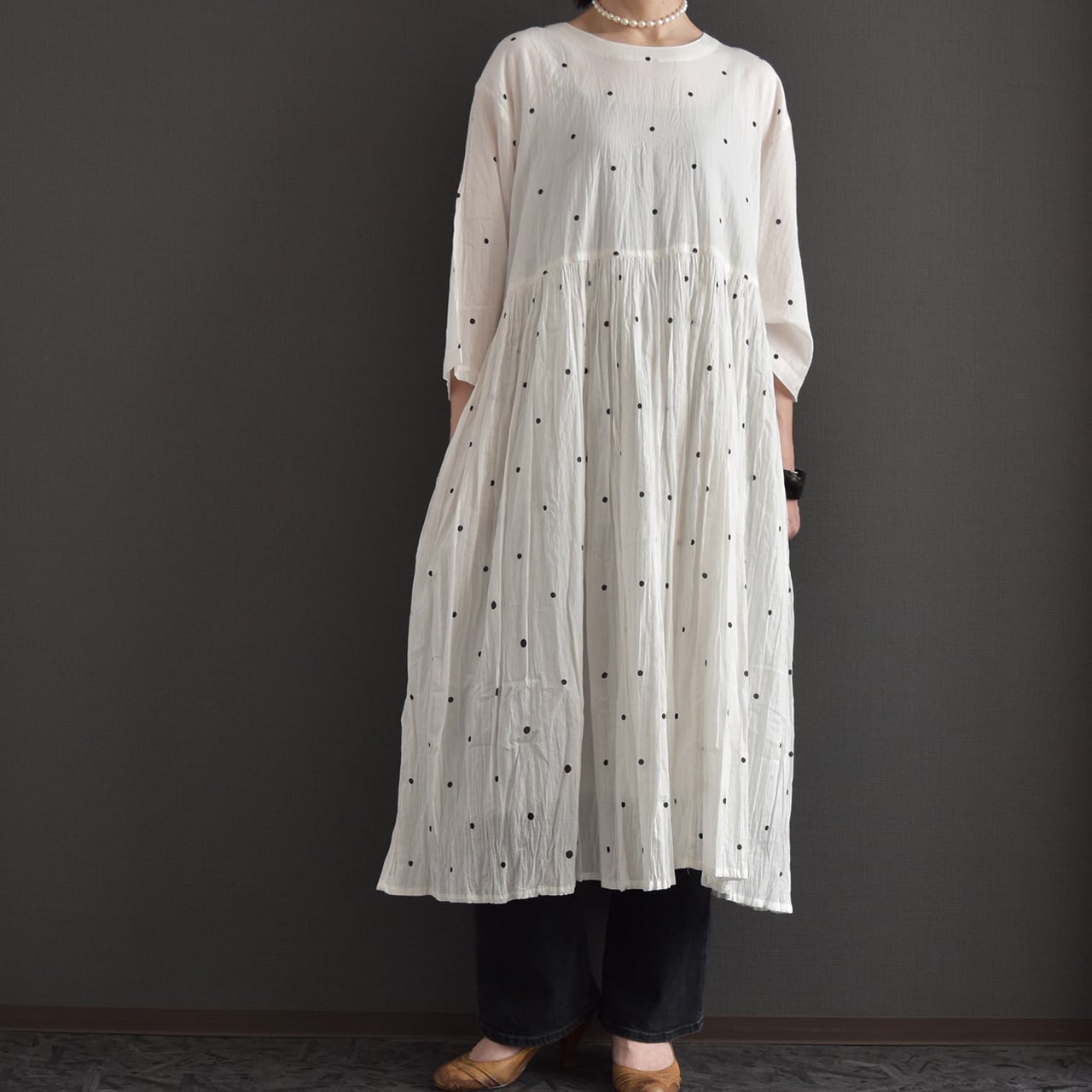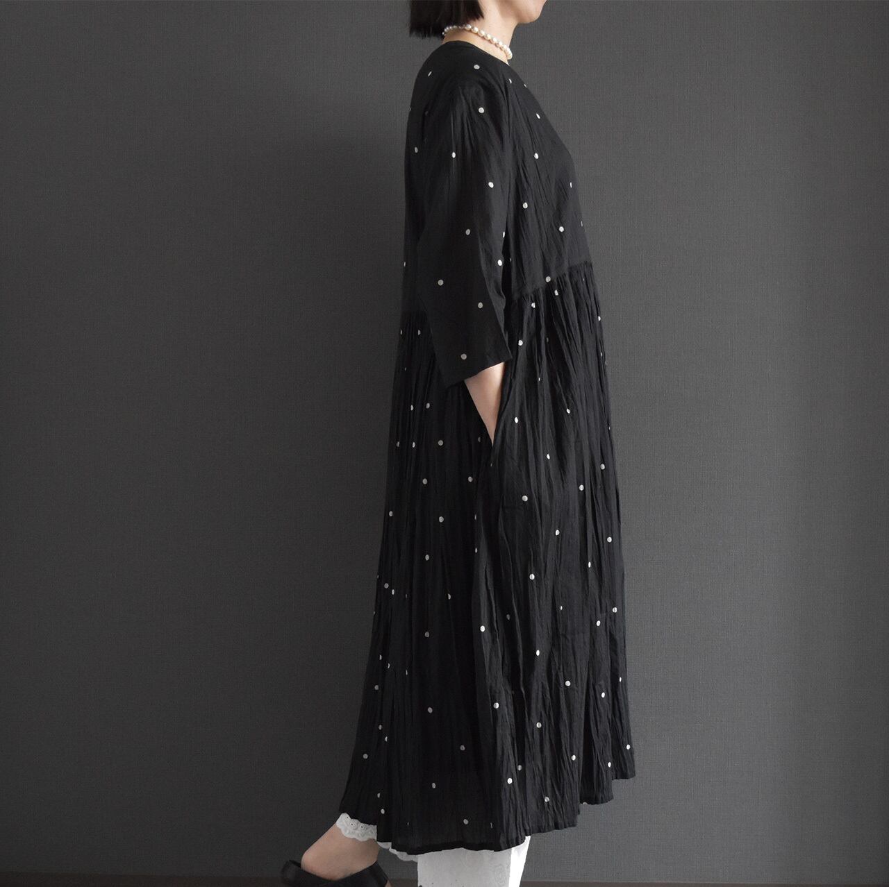 ナチュラルなシワ感とさりげないドット柄が、やわらかく上品な印象に。